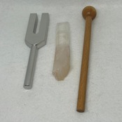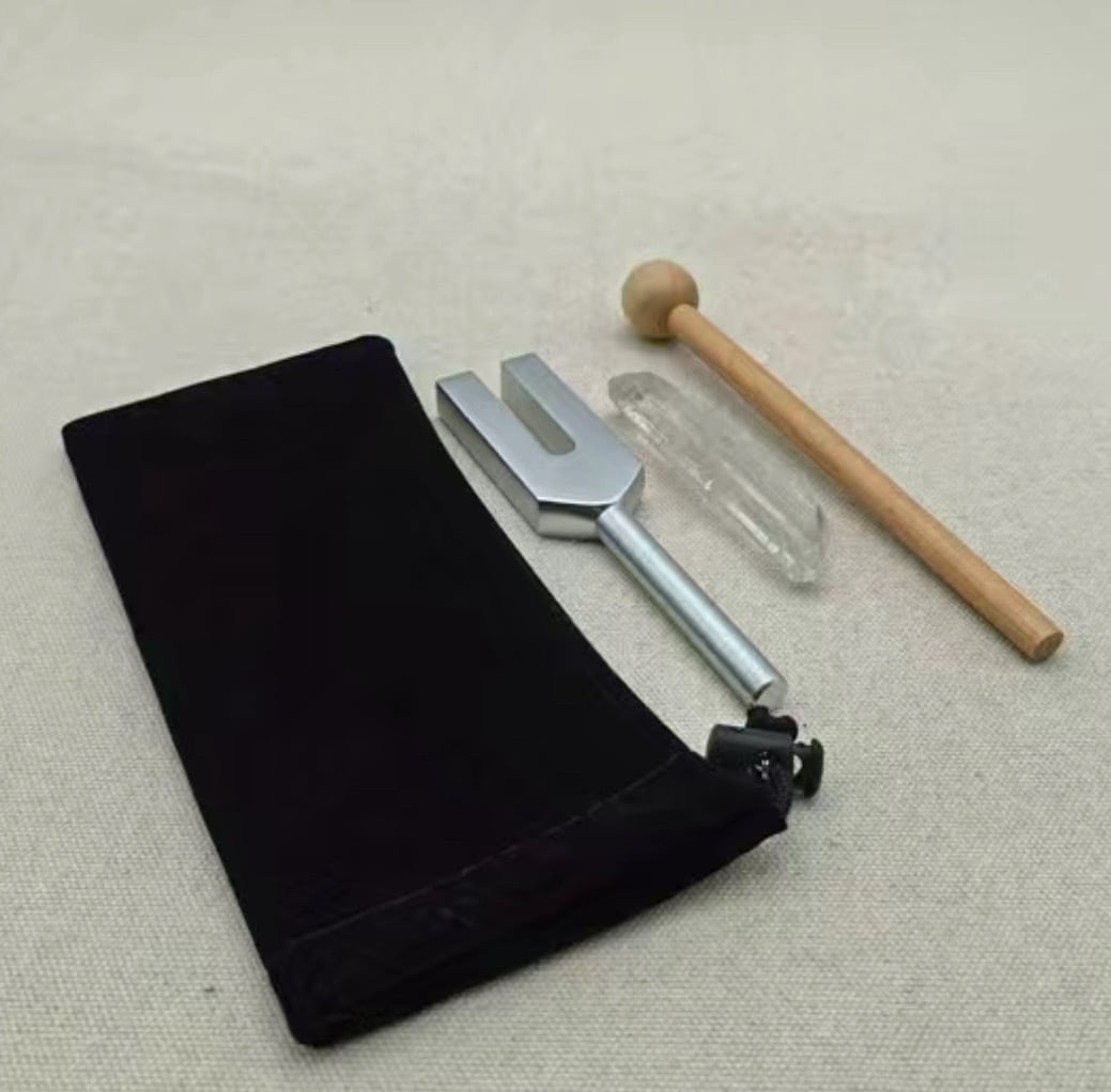 クリスタルチューナー、木製マレット、水晶ポイント、収納袋のセットになります。