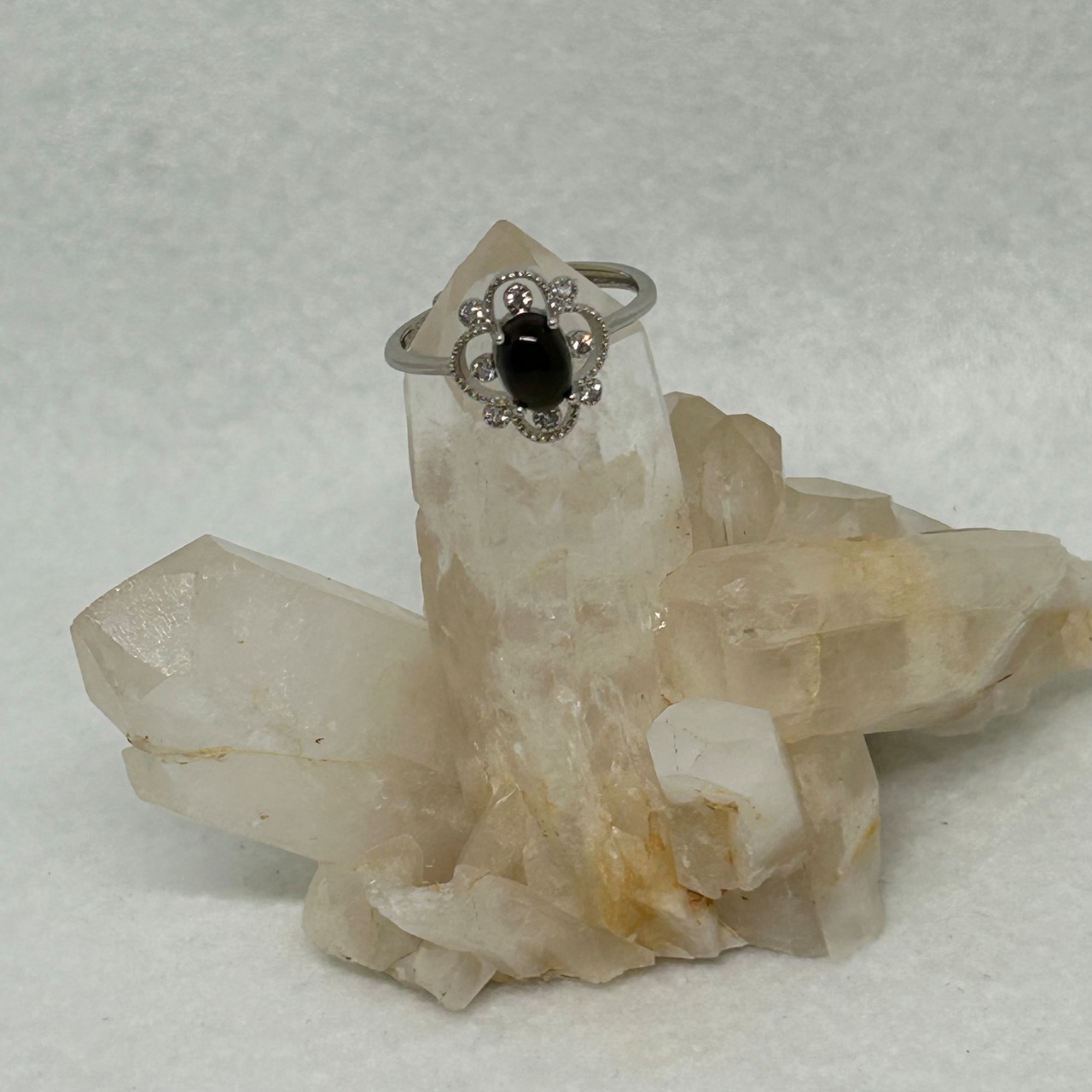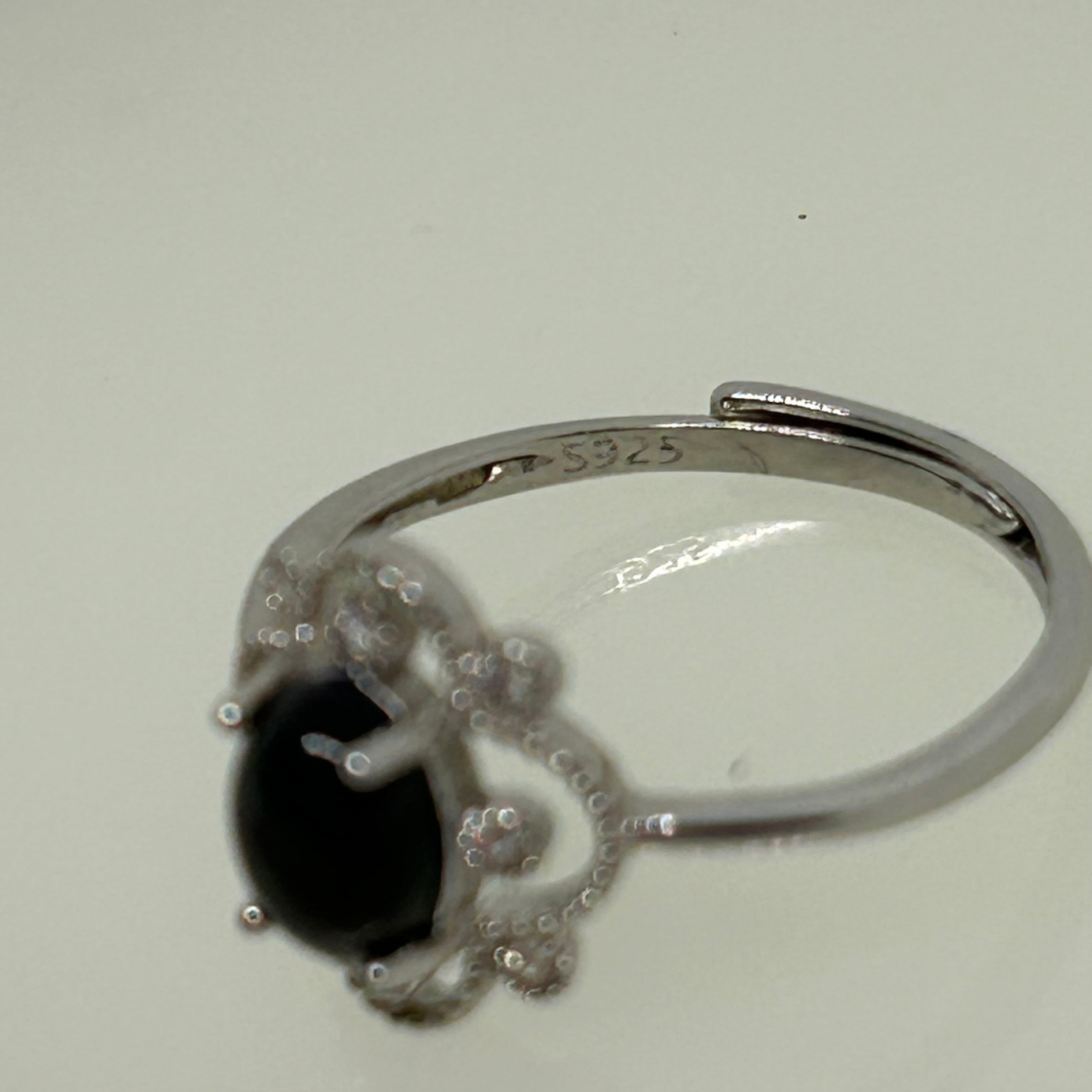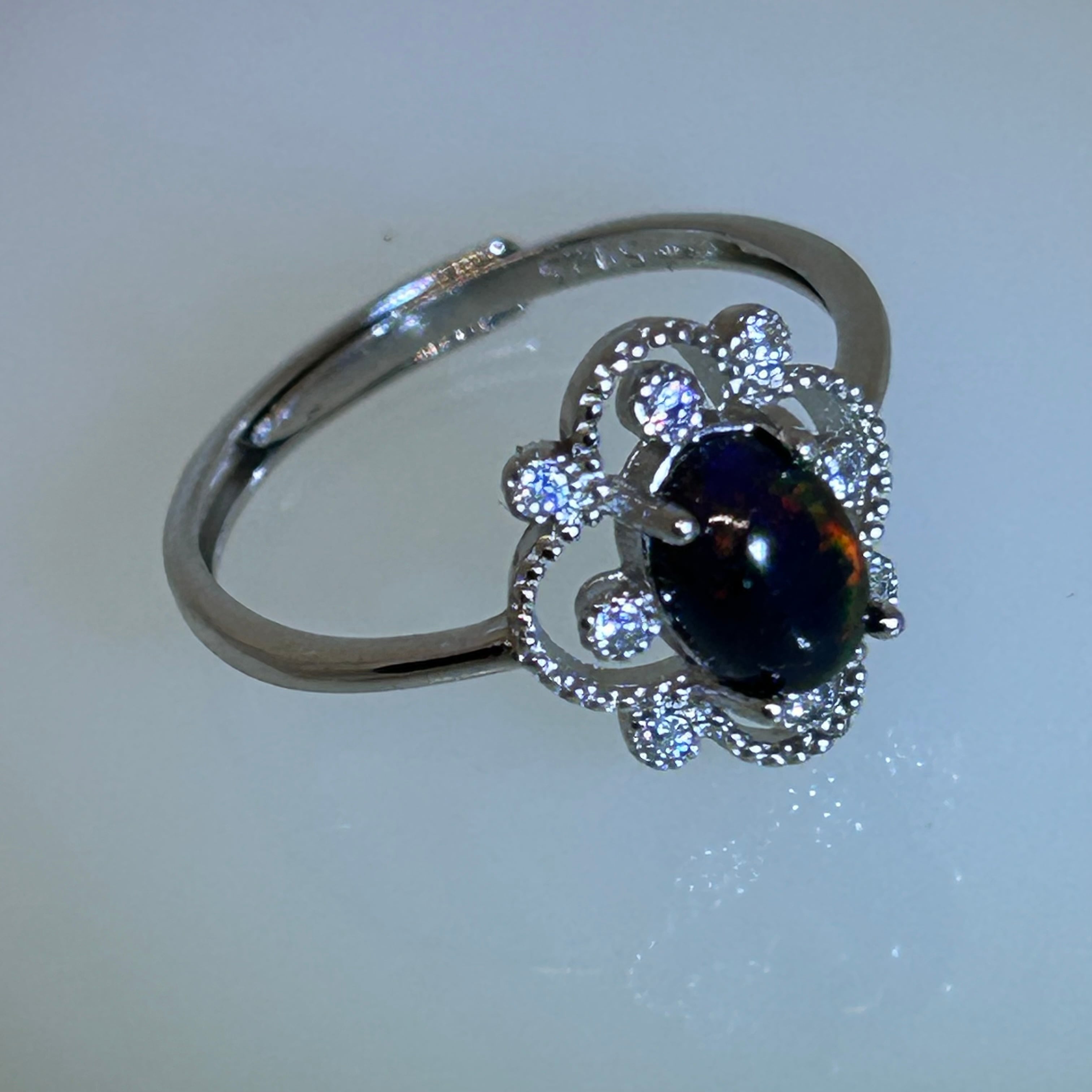 美しいブラックオパールと輝くジルコンが融合した、華やかなリング。925シルバー製で、フリーサイズなのでサイズを心配する必要はありません。ブラックオパールは独特のダイナミックな色合いで、手元を一層鮮やかに彩ります。