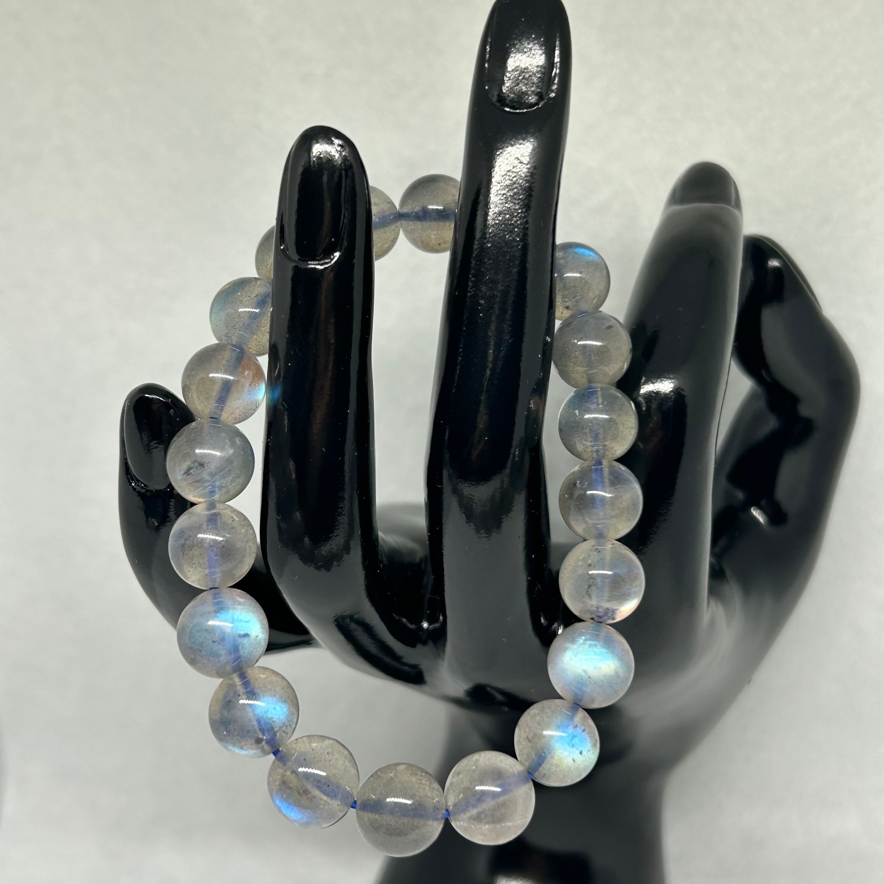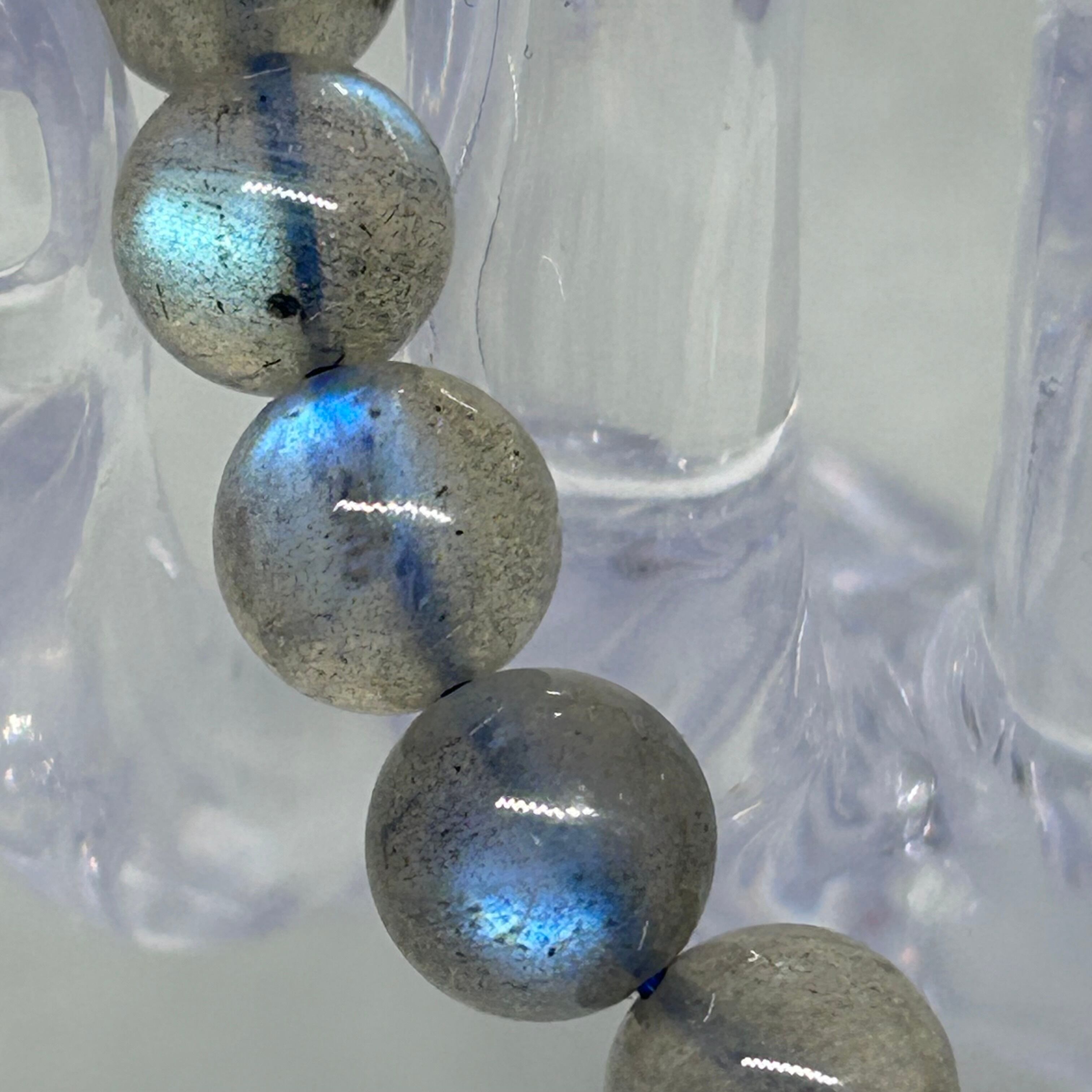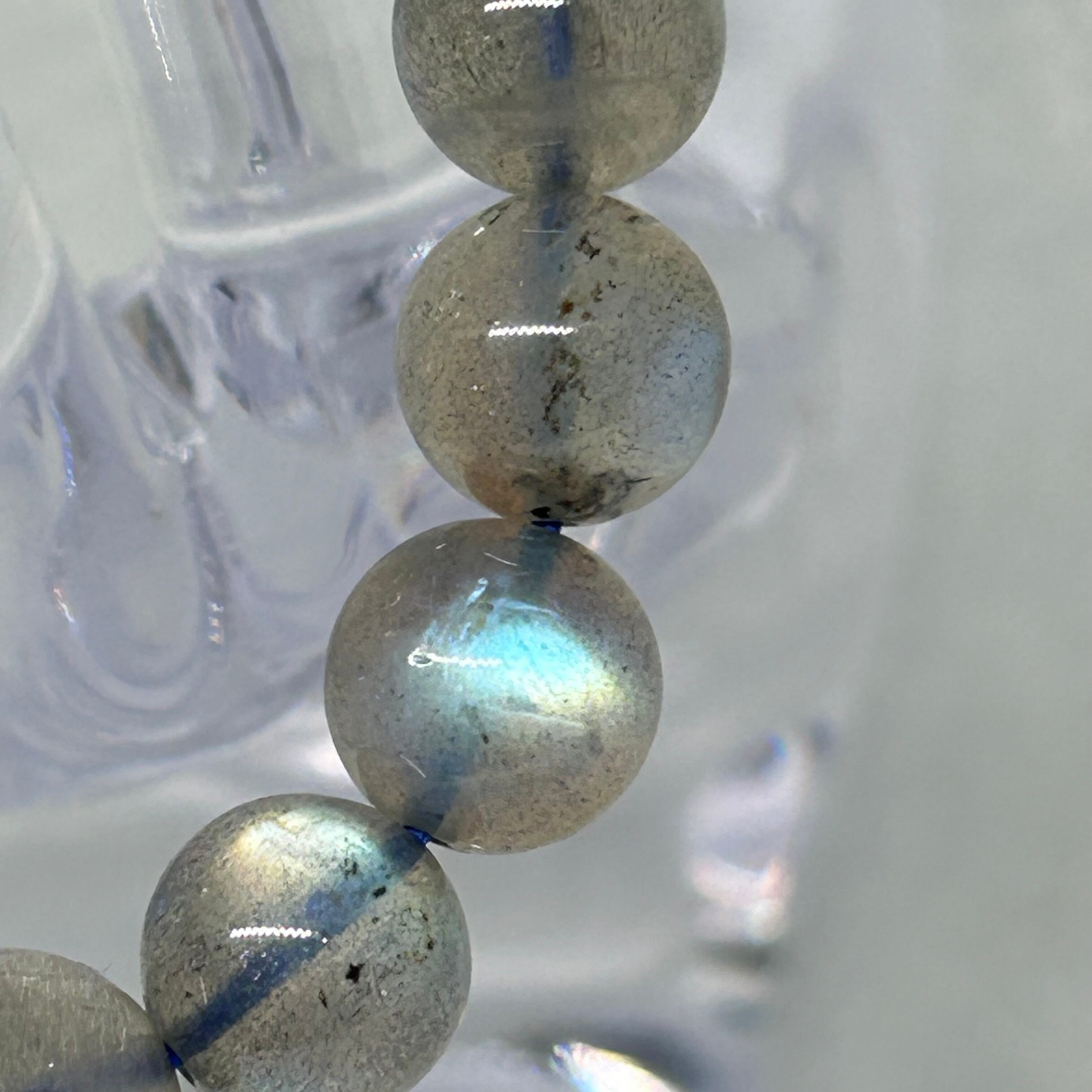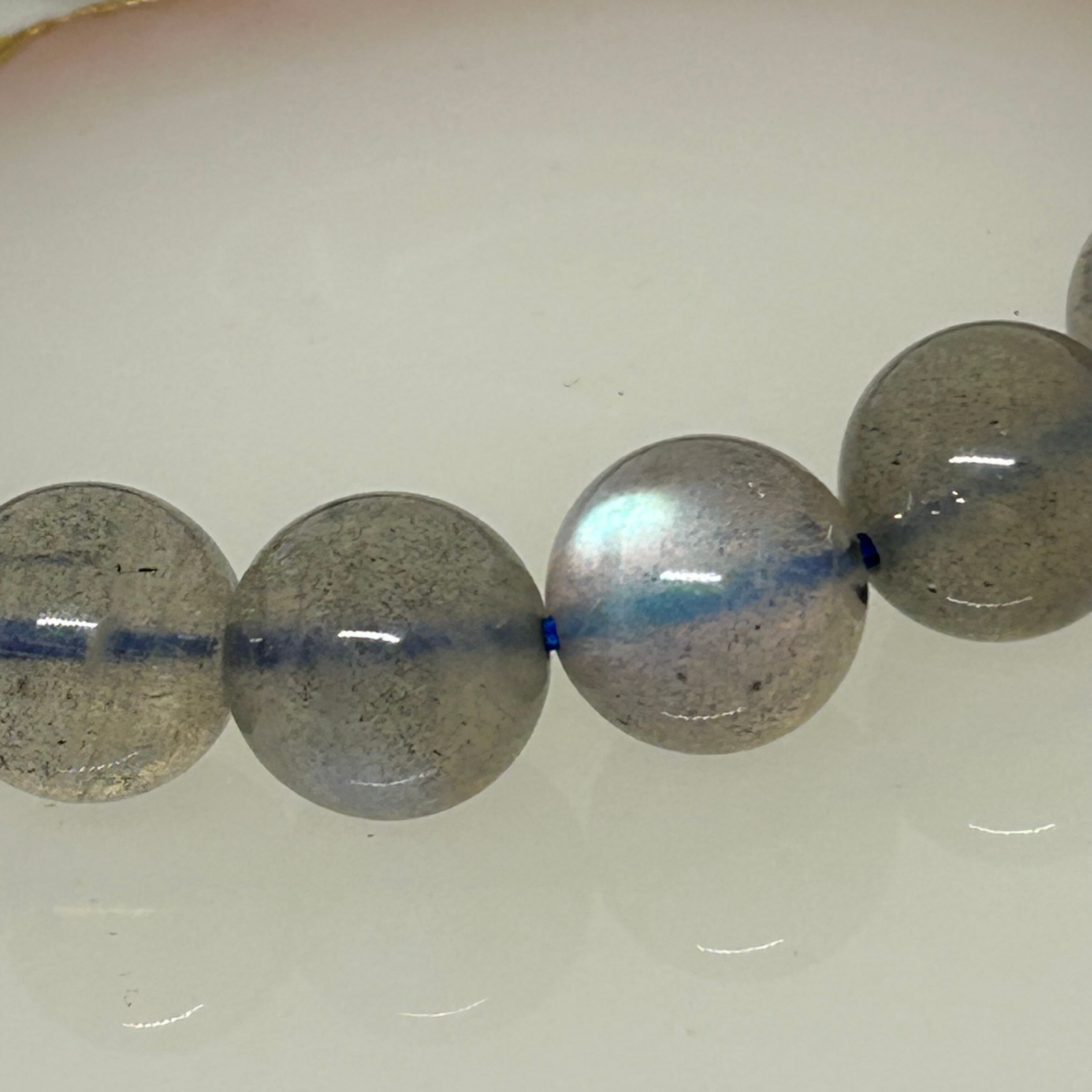 幻想的な輝きが魅力のラブラドライト10mmブレスレット。シラー効果による色とりどりの輝きが美しい一点です。異なる方向から光を受けるたびに、繊細な光の魔法が広がります。石の美しさを最大限に引き立たせるため、加工や染色は一切していません。