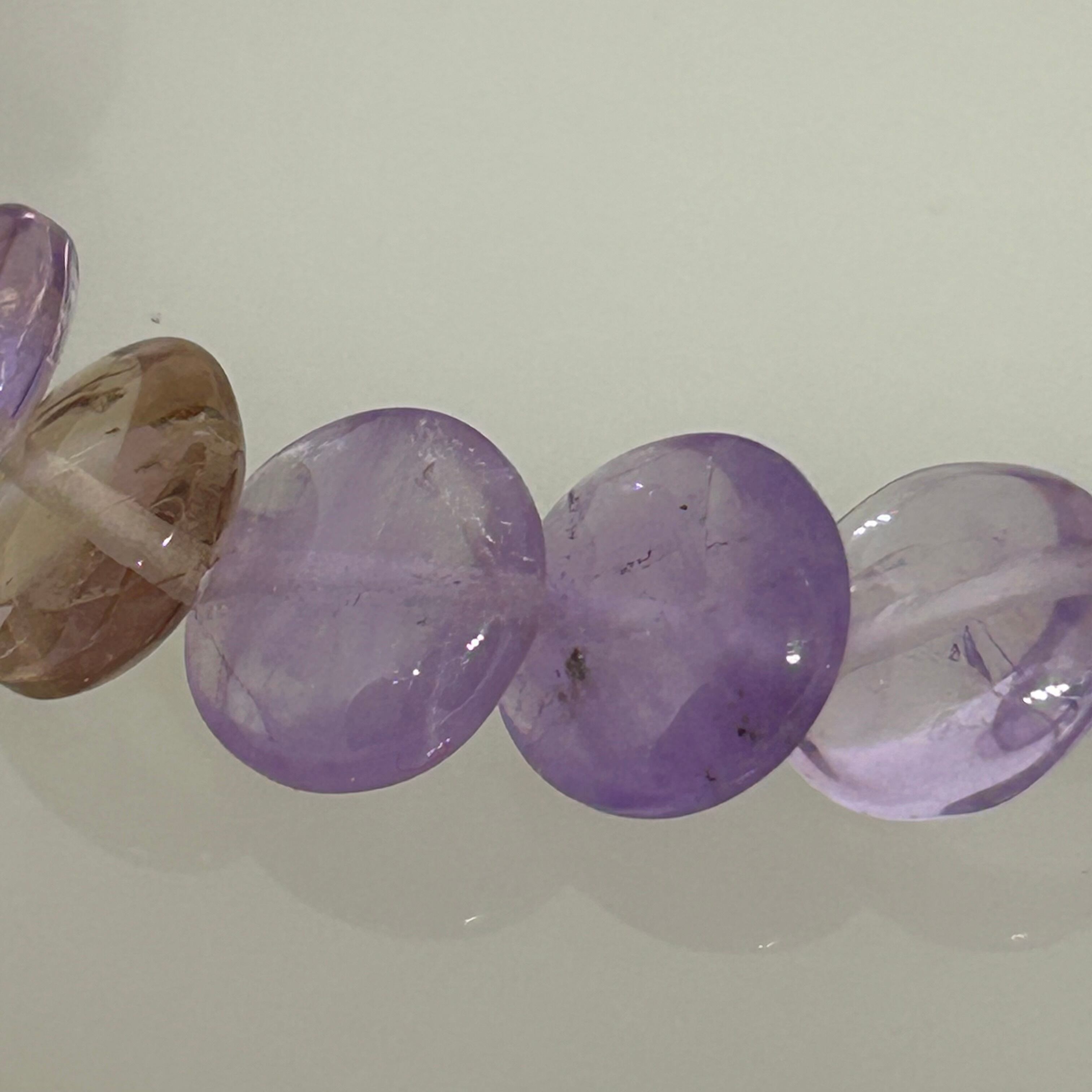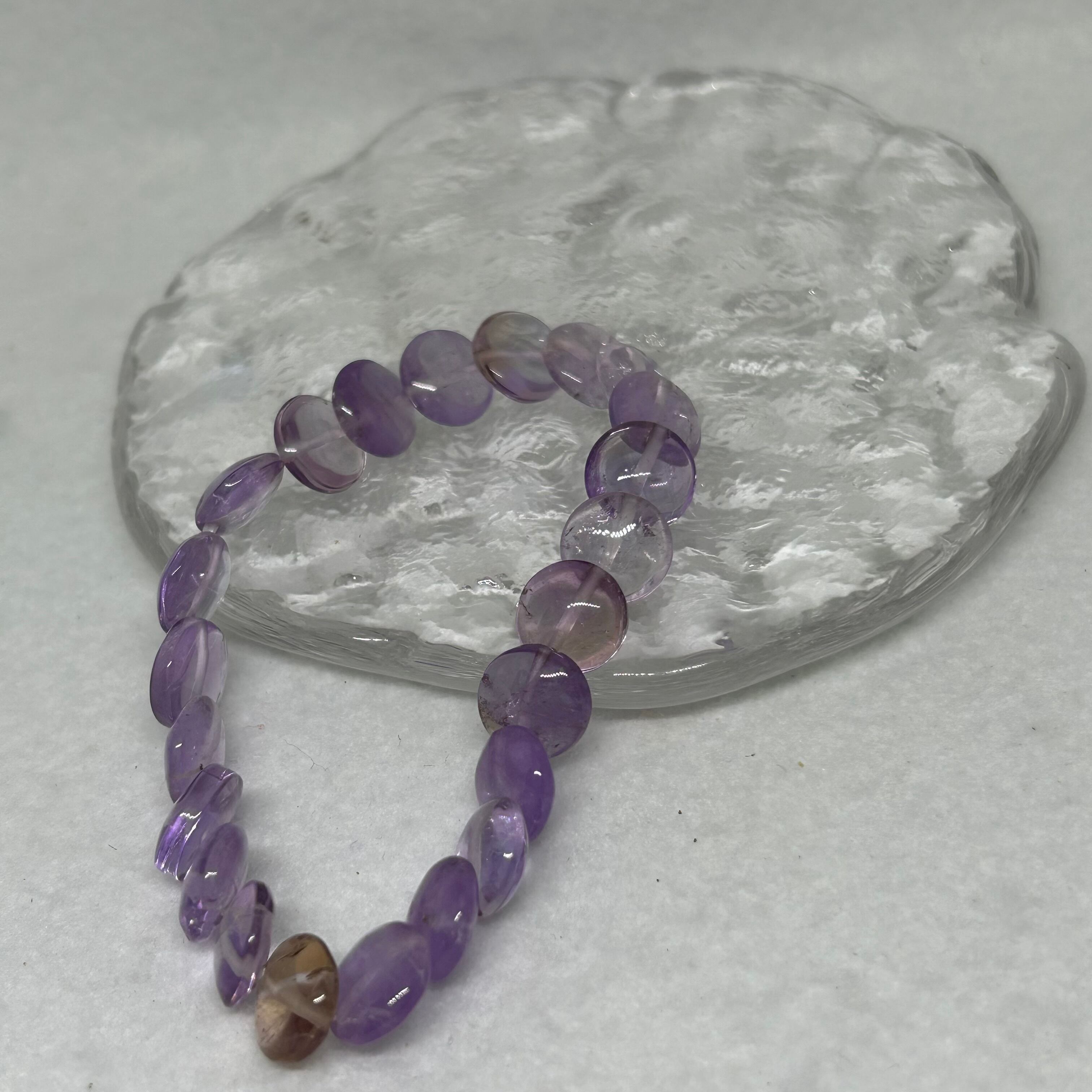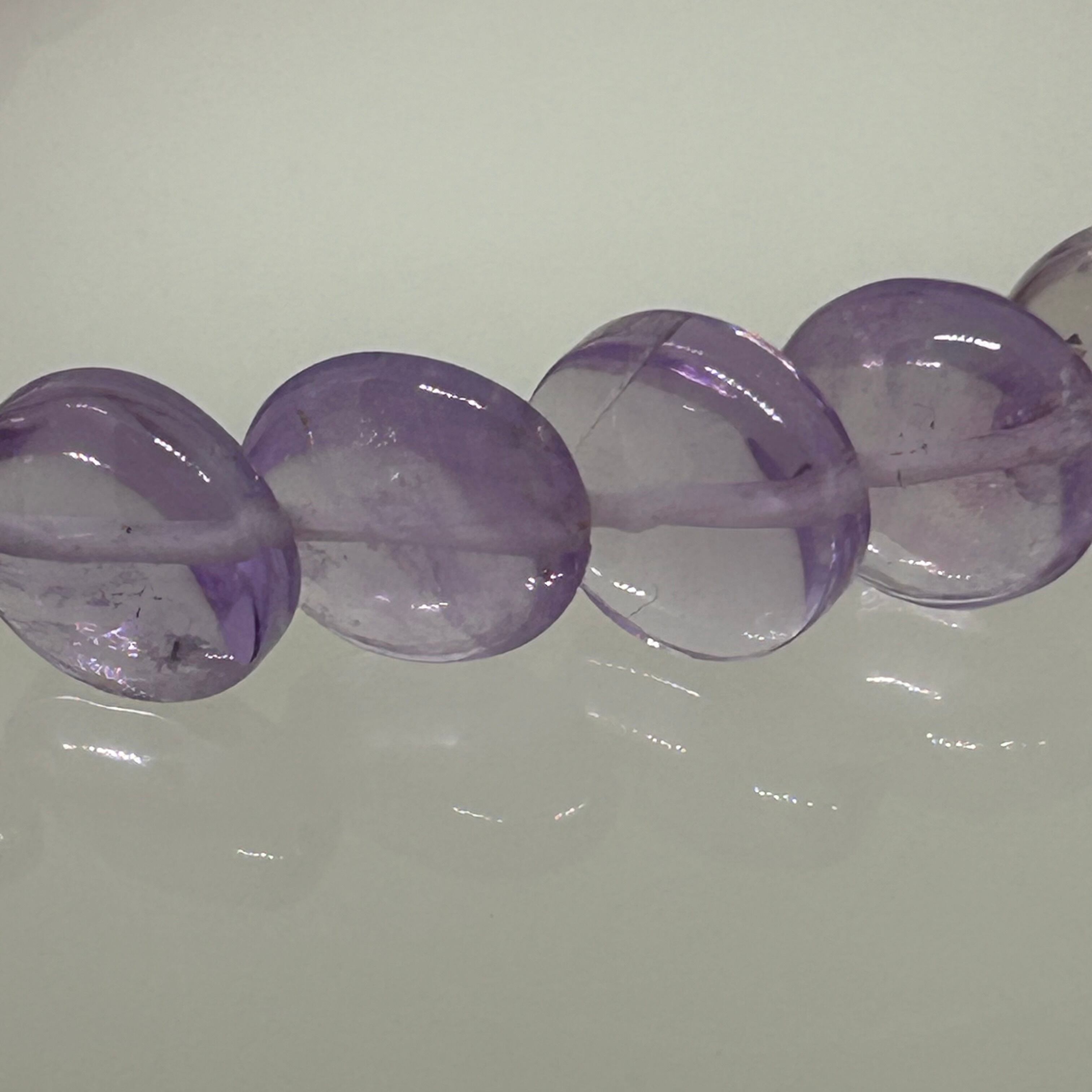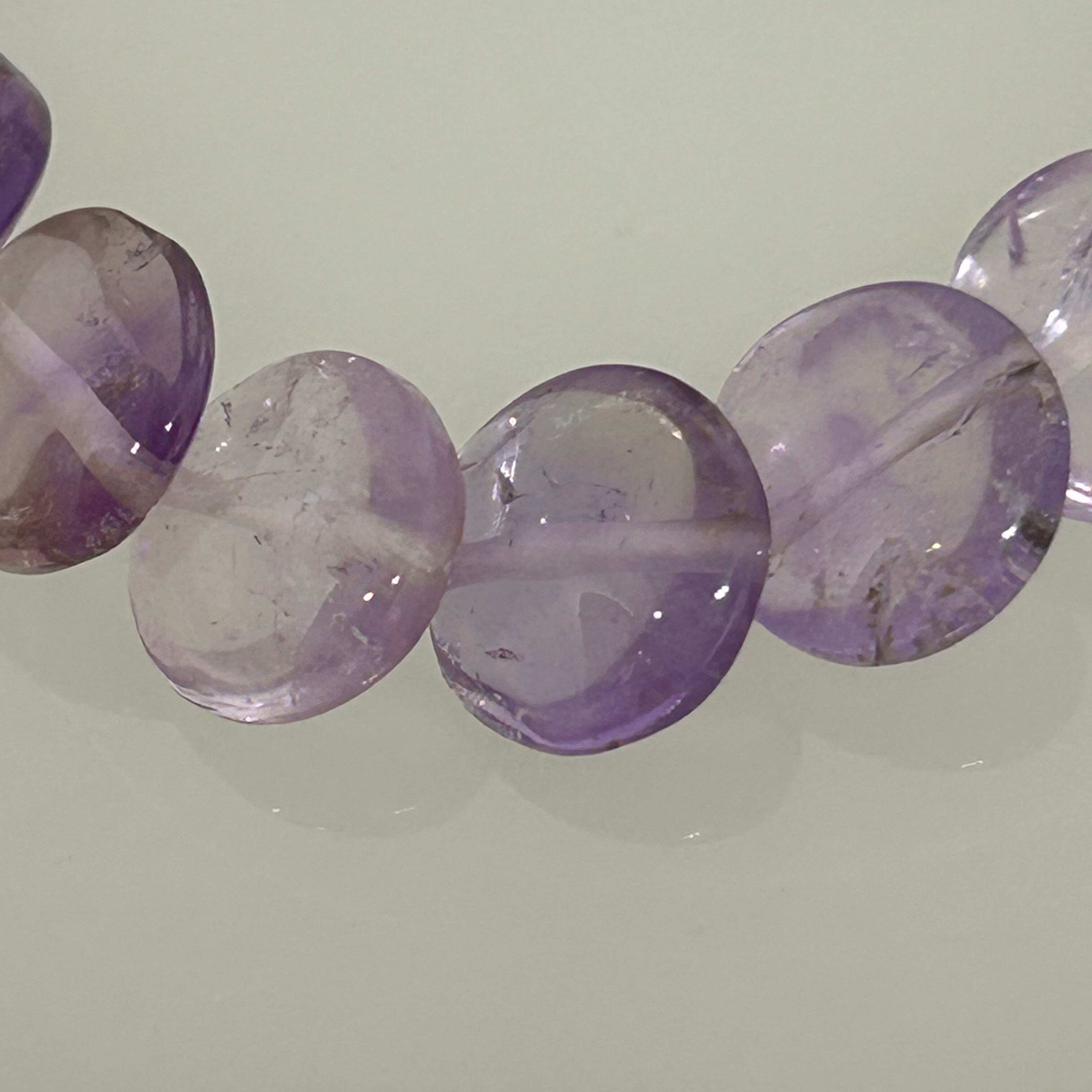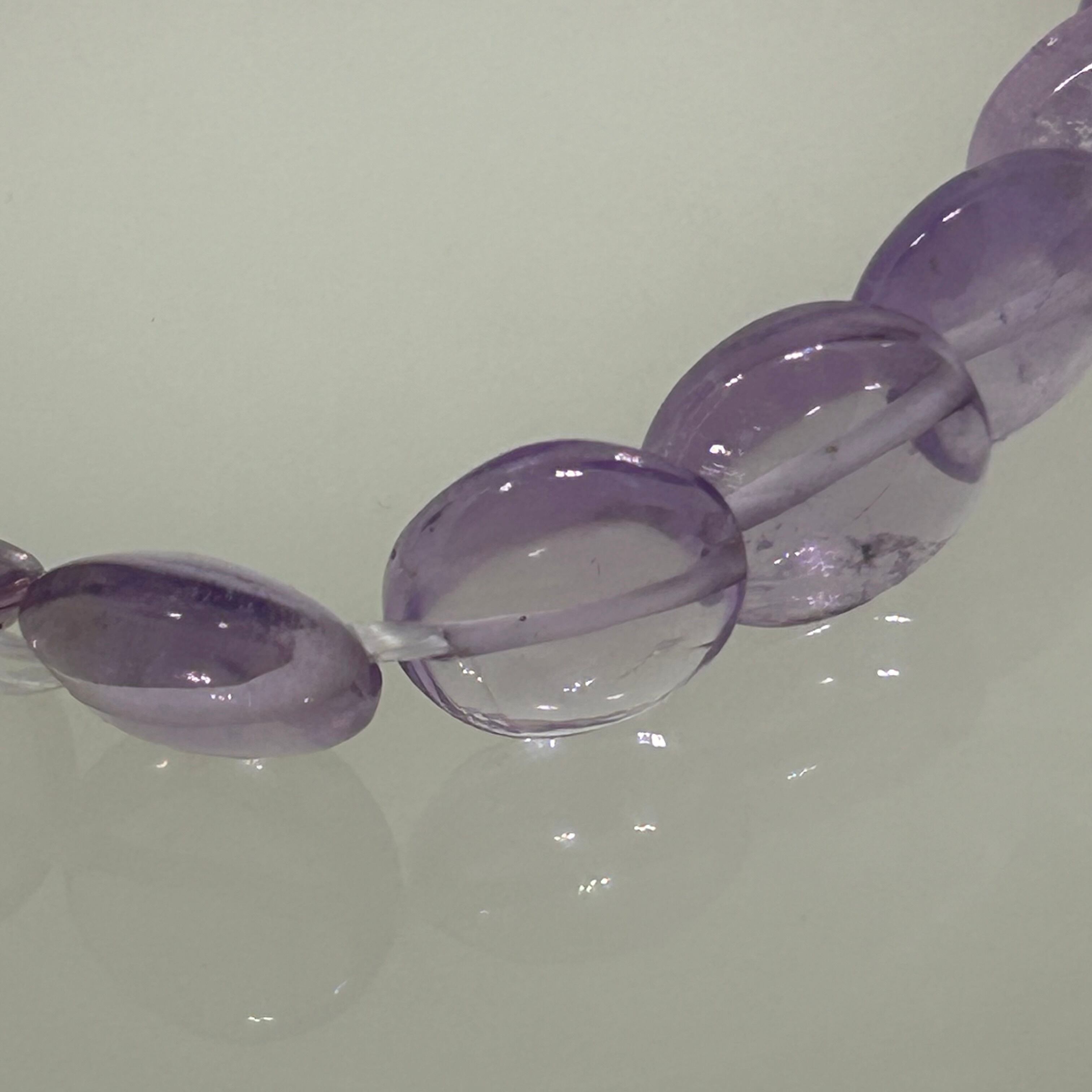 ラベンダーアメジストの7mmボタンカットブレスレットです。ラベンダーアメジストは、美しい淡い紫色が特徴のパワーストーンとして人気があります。ボタンカットの特徴は、輝きがより一層際立つことです。手首を華やかに演出する一品です。
