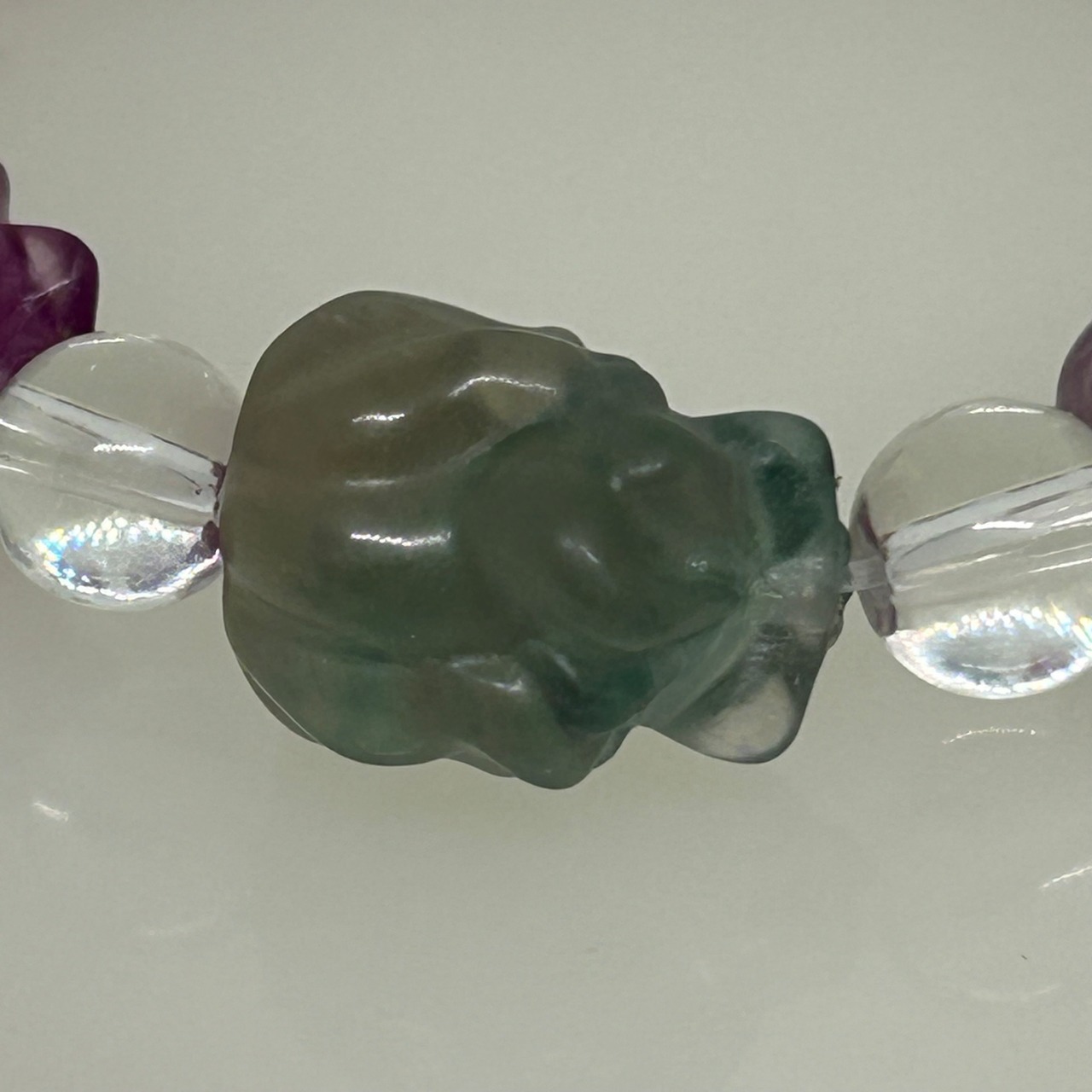フローライトは、直感力を高めると言われるパワーストーン。九尾狐のモチーフからは、魅力的な変身と持ち物や周囲への保護を象徴しています。このブレスレットは、個性的なデザインと意味深な組み合わせで、特別な存在感を放ってくれます。
