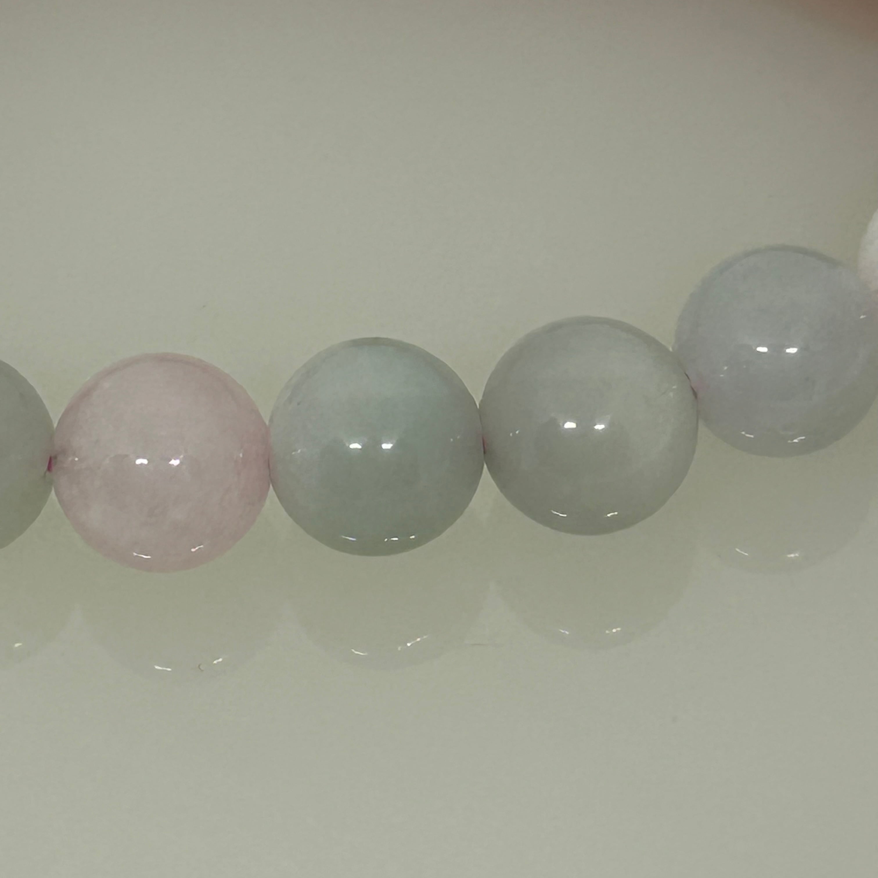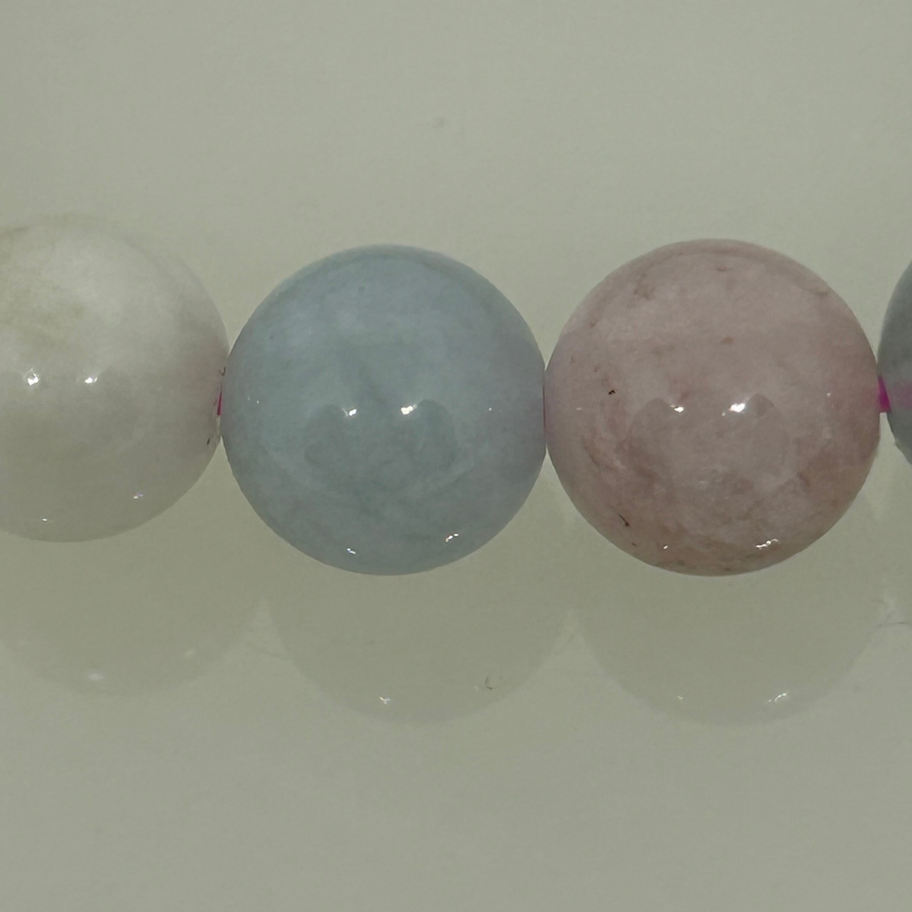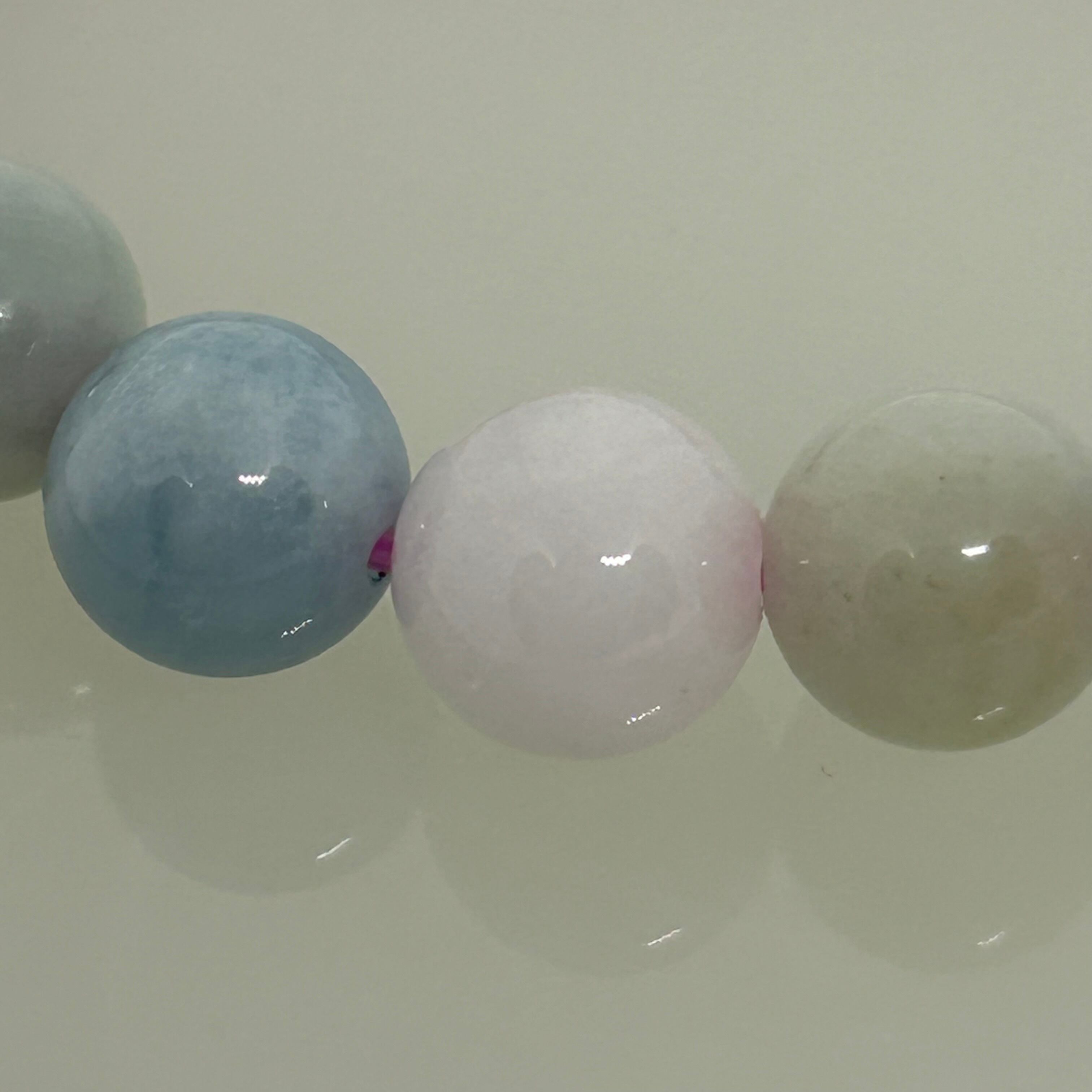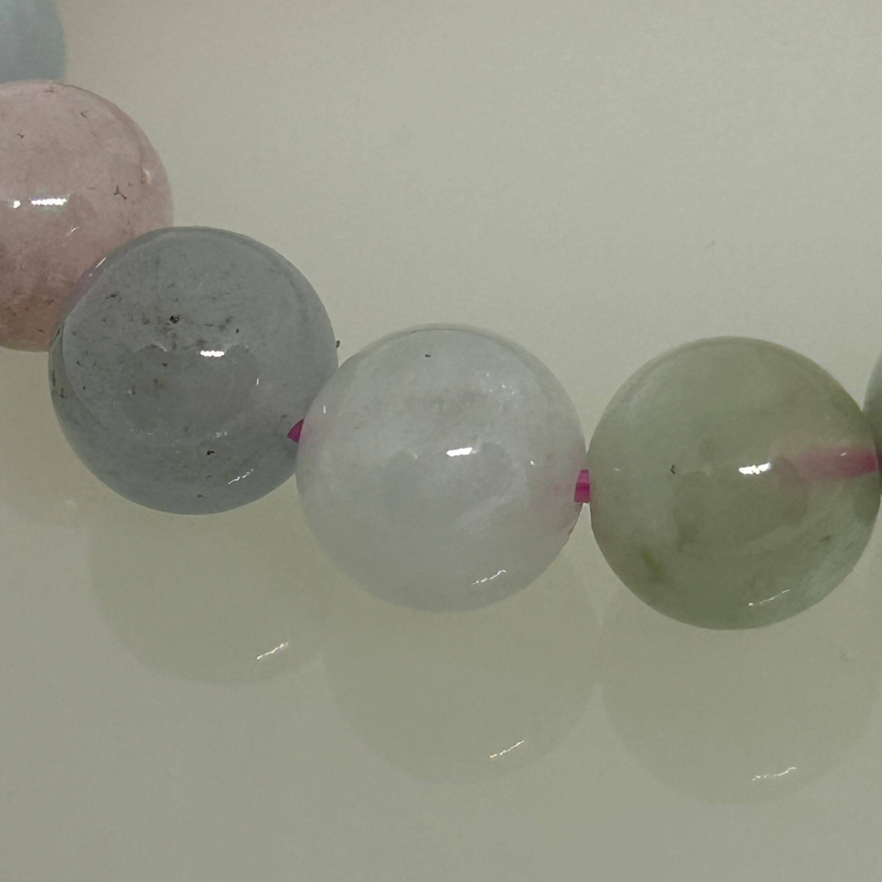 繊細で優美な輝きを持つ、ミックスカラーのモルガナイト8mmブレスレットです。自然の美しさを引き立てる天然色と、表面にある汚れがユニークな魅力を演出しています。このブレスレットは、エレガントな装いにぴったりのアクセサリーです。モルガナイトは、愛情や情熱を象徴し、心を穏やかにし、癒しのエネルギーを与えてくれます。