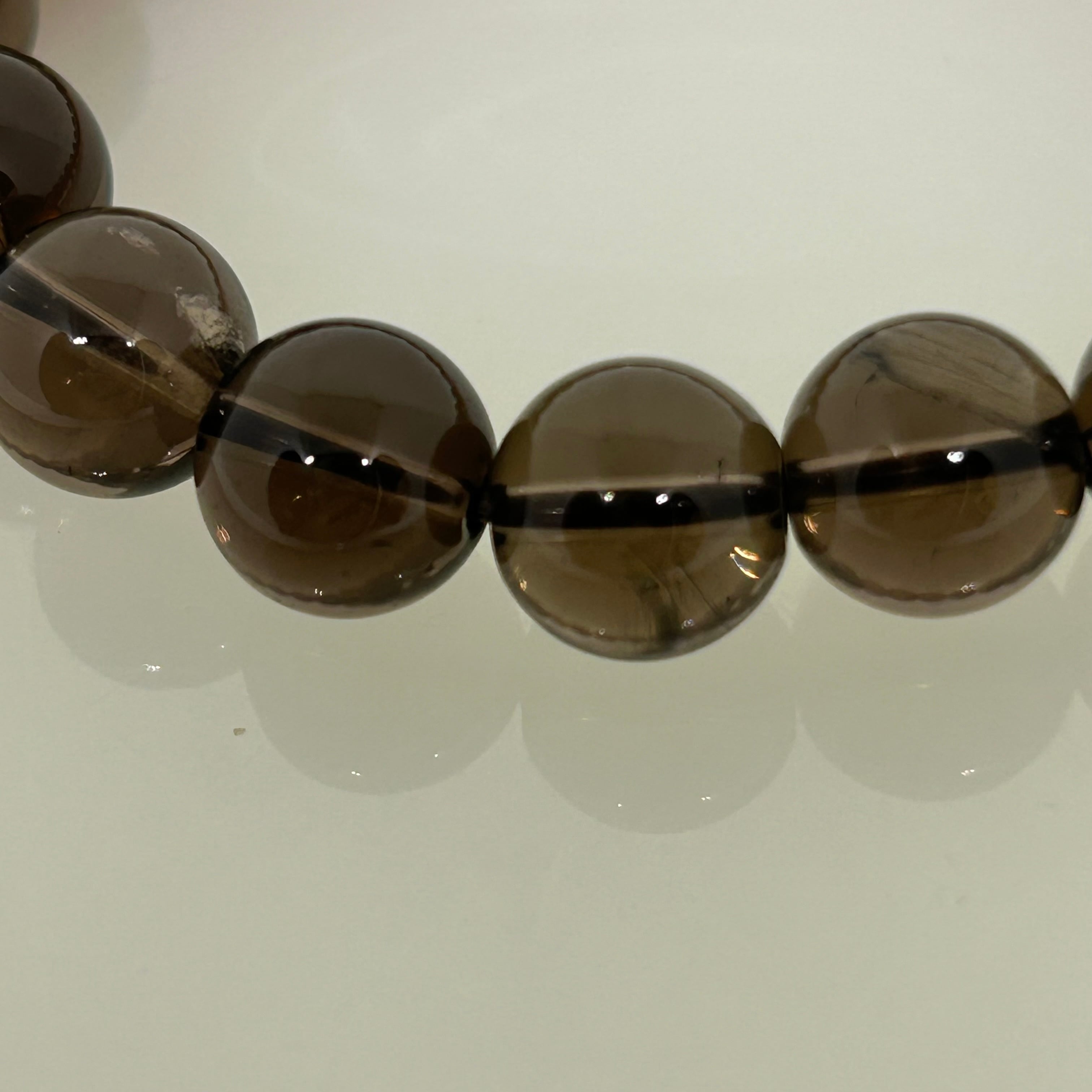 透明感のあるスモーキークォーツの美しい輝きを、手元で感じることができる10mmのブレスレットです。大きさがちょうどよく、付け心地も抜群。一つひとつの石には独特の模様があり、個性的な風合いが魅力です。