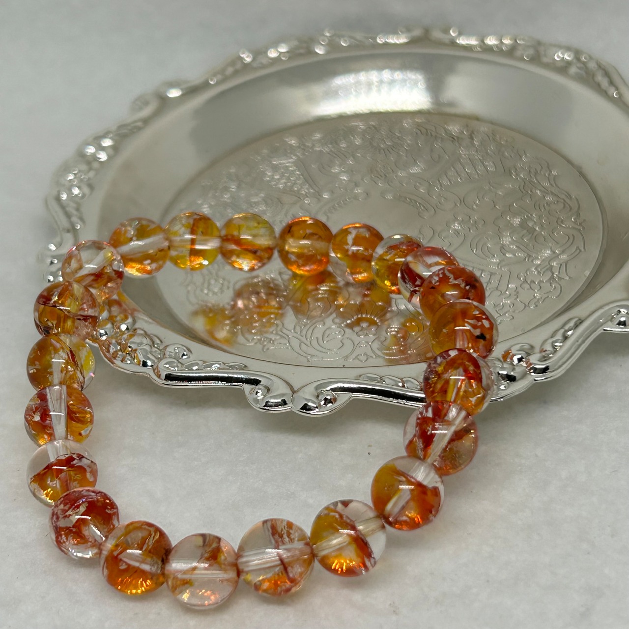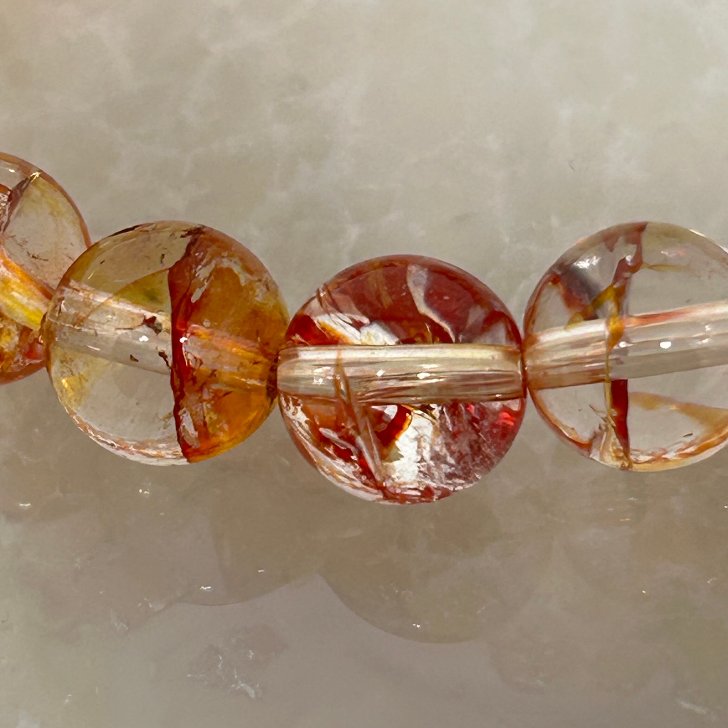 ライモナイトクォーツブレスレットは、8mmの手のひらサイズで、特徴である赤い内包物を美しく表現しています。その美しさと手頃な大きさから、日常使いや特別な場でのアクセントとして腕を飾るブレスレットです。