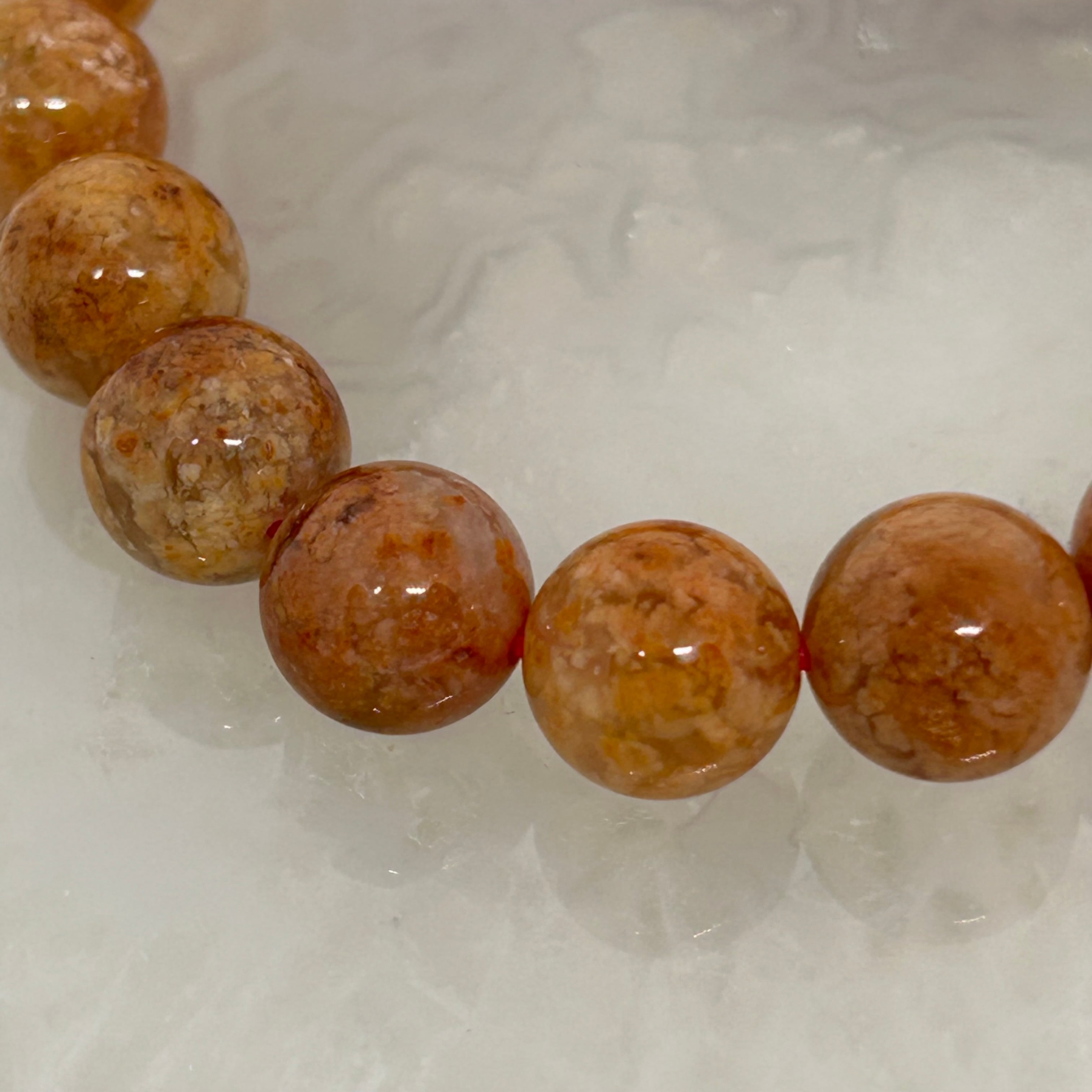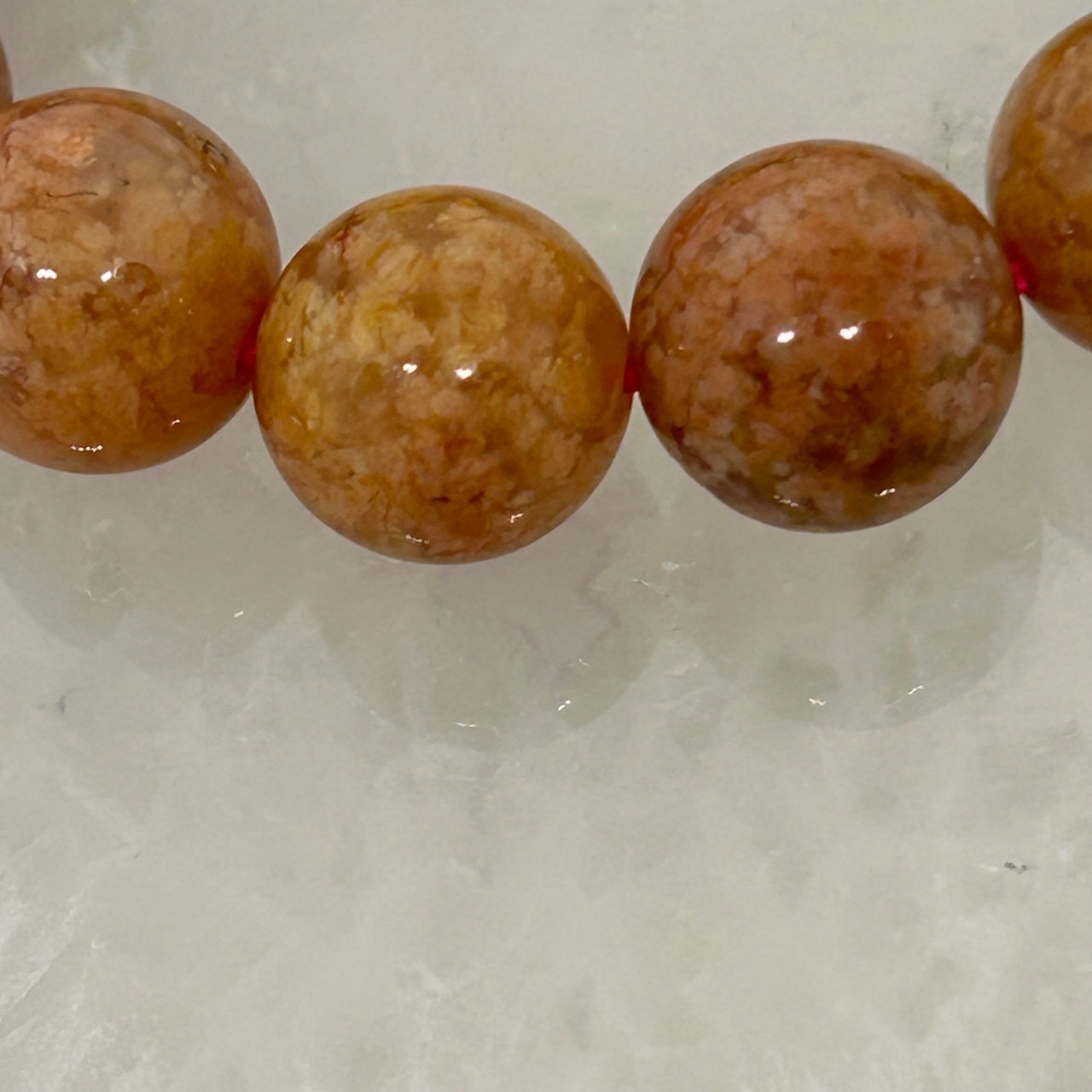 ブレシエイテッドジャスパー 11mm ブレスレットは、ヌーディーピンクの石を使用したエレガントなアクセサリーです。このブレスレットは、石の美しい色合いと個性的な模様が特徴で、どんなコーディネートにも華やかさをプラスしてくれます。