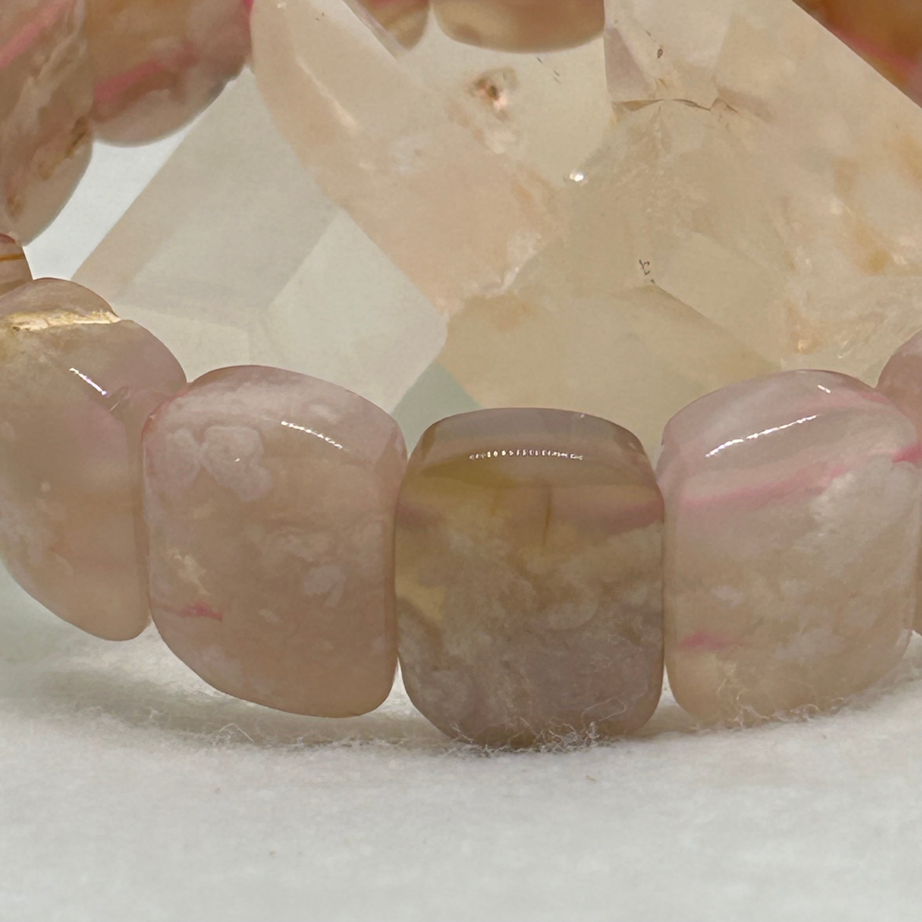 桜色の美しいチェリーブロッサムアゲートバングル。内包物の模様がまるで桜の花を思わせる、女性らしいデザインです。23✕13✕7mmの小ぶりなサイズ感が、手元を華やかに演出してくれます。さくら瑪瑙ならではの優しい色味と石の透明感で、どんなスタイルにも馴染みやすく、幅広いシーンで活躍してくれます。自分へのご褒美や大切な人へのギフトにもおすすめです。