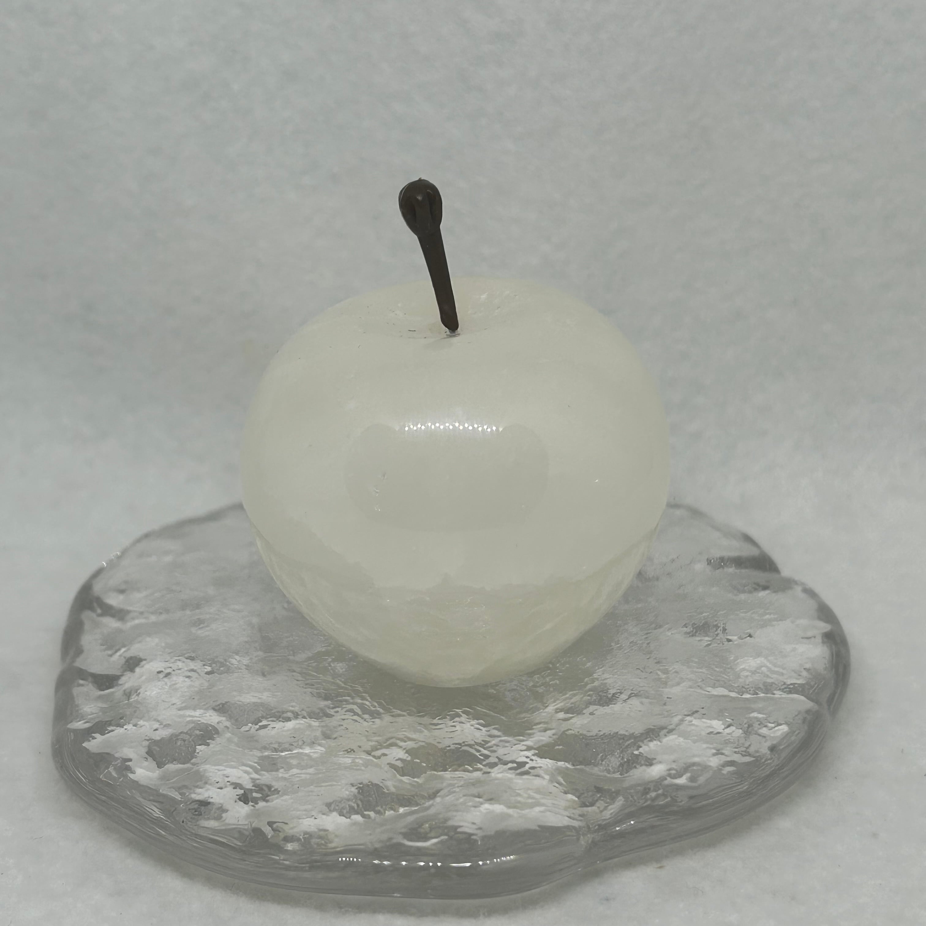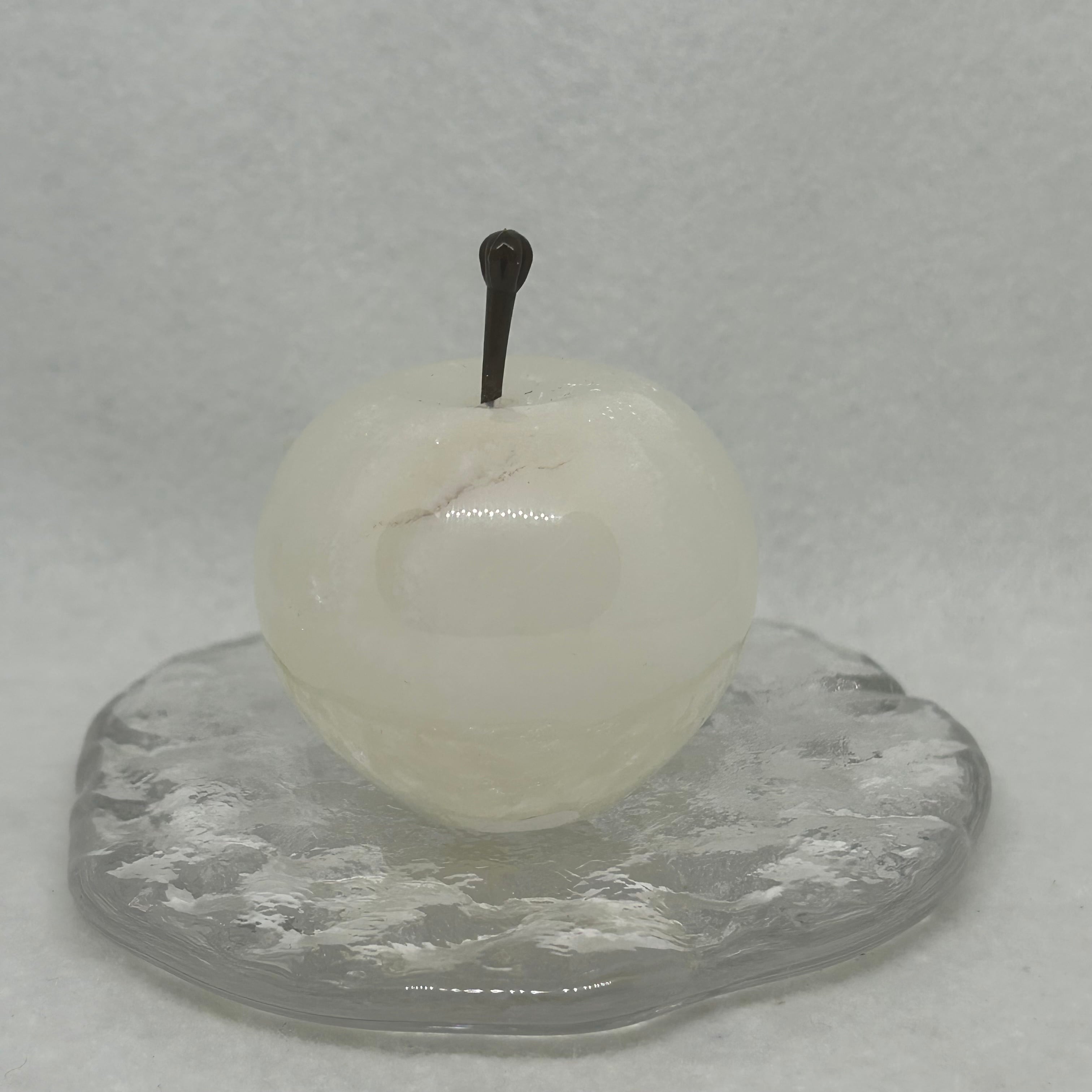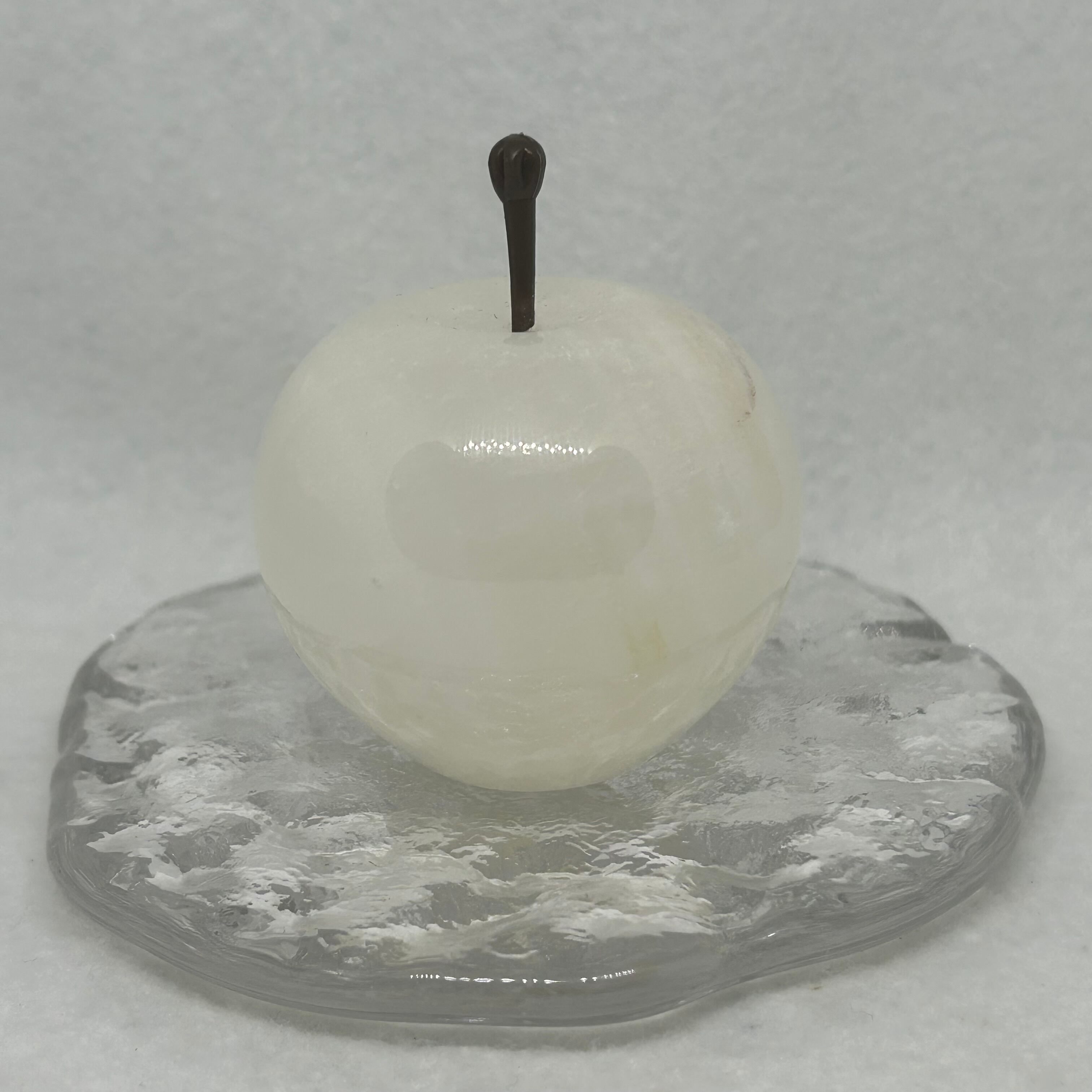 白瑪瑙を使用した幸せのりんご置物です。白瑪瑙は穏やかなエネルギーを持ち、心を浄化し好運を呼び込むと言われています。小さなりんごの形状で、手のひらにすっぽりと収まるサイズ感です。デスクやリビングなど、幸せを感じたい場所に置いて頂くと、明るい気持ちで過ごすことができるでしょう。また、手のひらに持ってみると、ひんやりと心地よい触感が広がります。この置物と共に、日常の喧騒から一息ついてみてはいかがでしょうか。