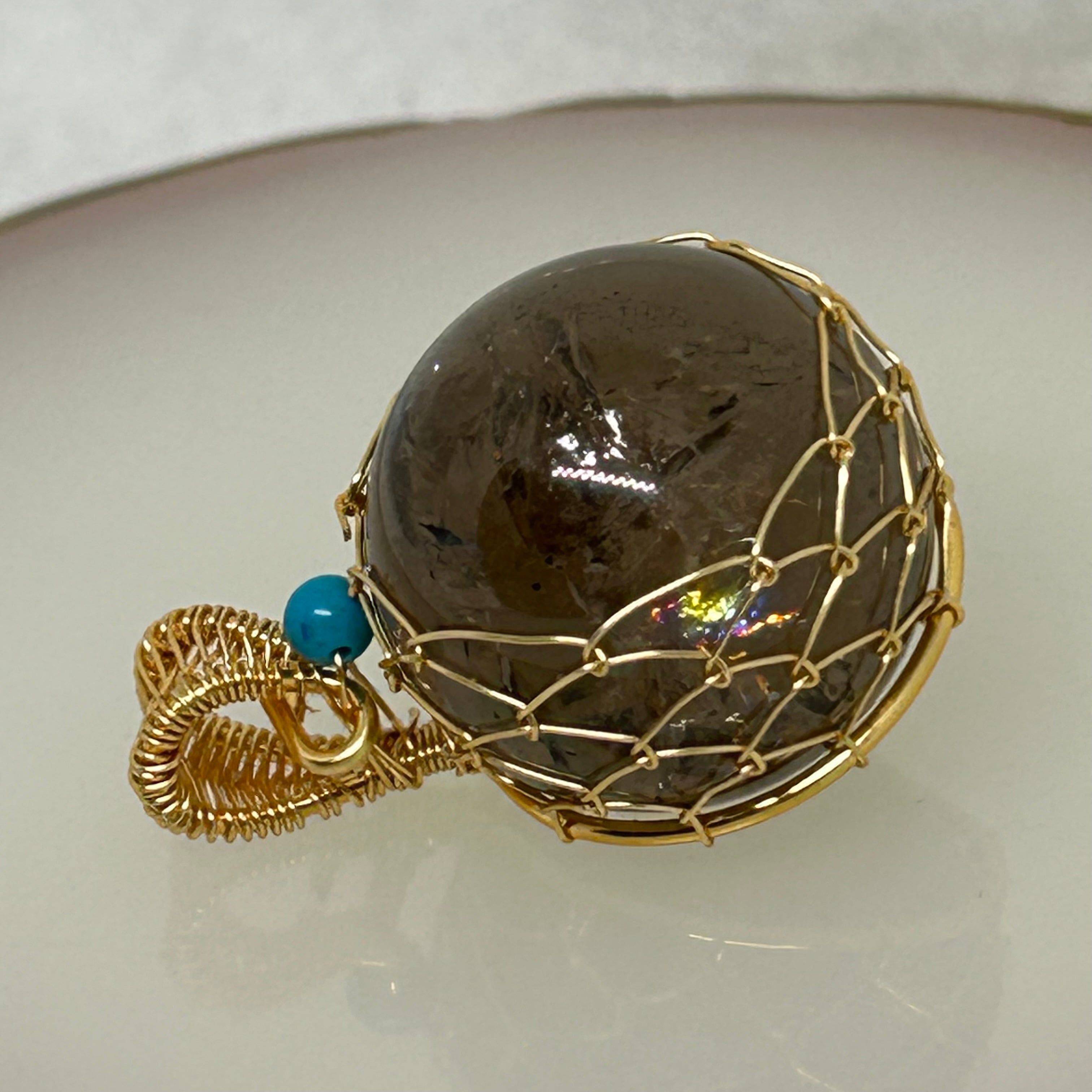 美しさと神秘性が融合したアイリススモーキークォーツのペンダントトップです。直径21mmの大粒スフィア型のクォーツは、特別な加工を施すことで、内部に虹色の輝きを宿しています。光の当たり方によって美しいグラデーションが生まれ、まるで幻想的な光景を目の前にしたかのような感動を与えます。