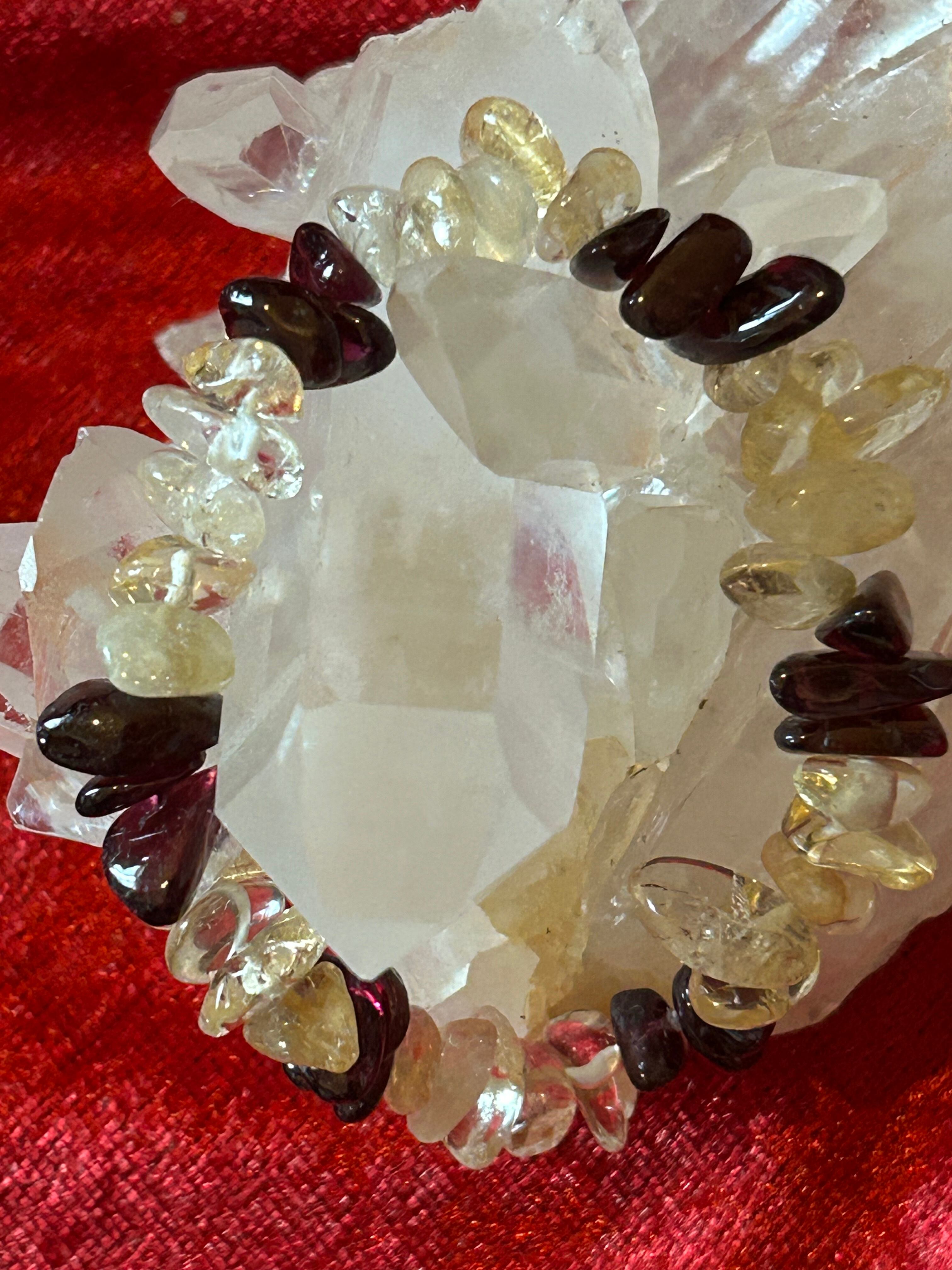 シトリン&ガーネット細石ブレスレットは、新陳代謝を促進しデトックス効果を期待出来るパワーストーンブレスレットです。シトリンの明るい黄色は、身体のエネルギーフローを整えてくれます。また、ガーネットは身体の毒素を排出し、冷えやむくみを解消してくれると言われています。