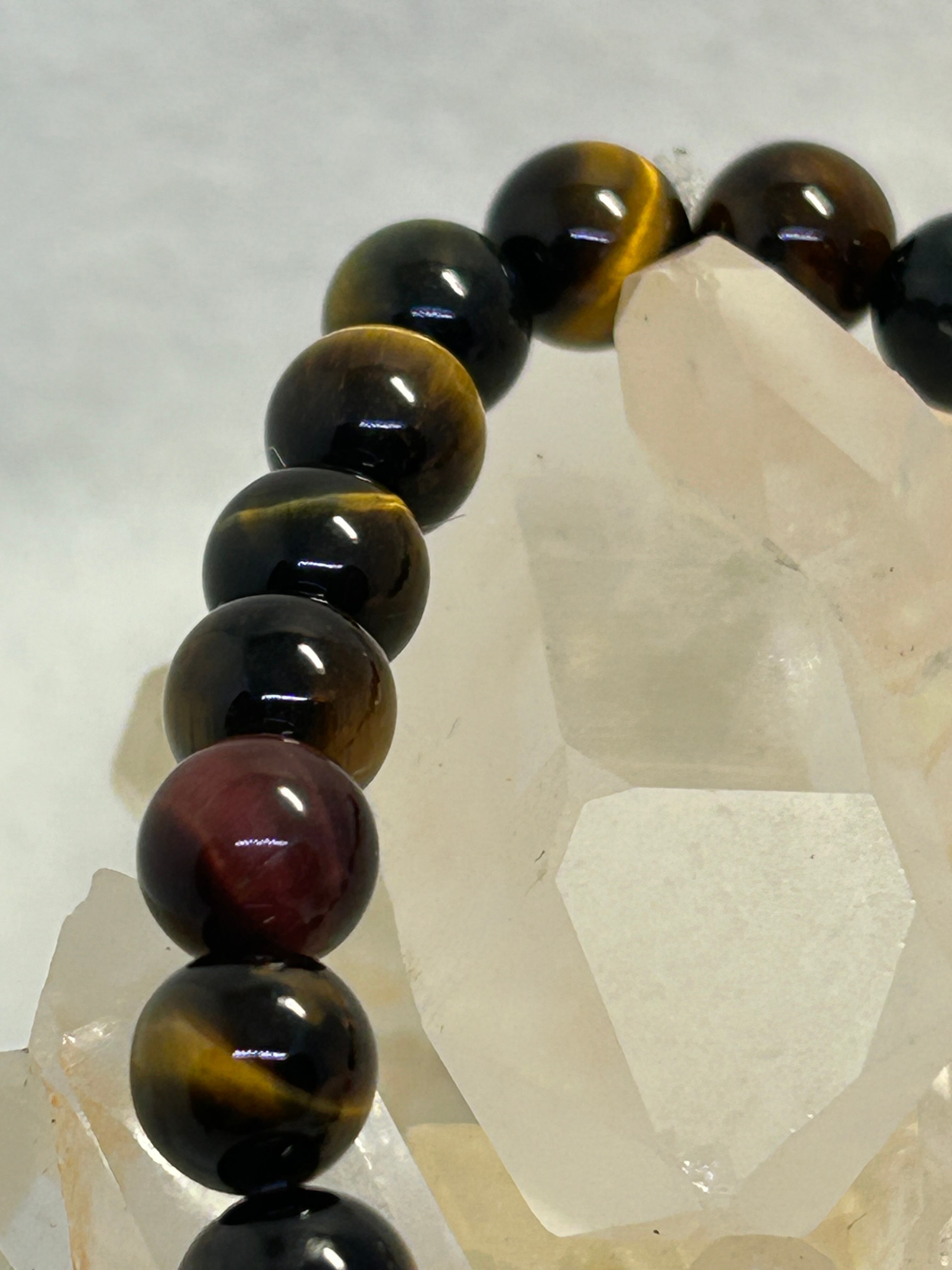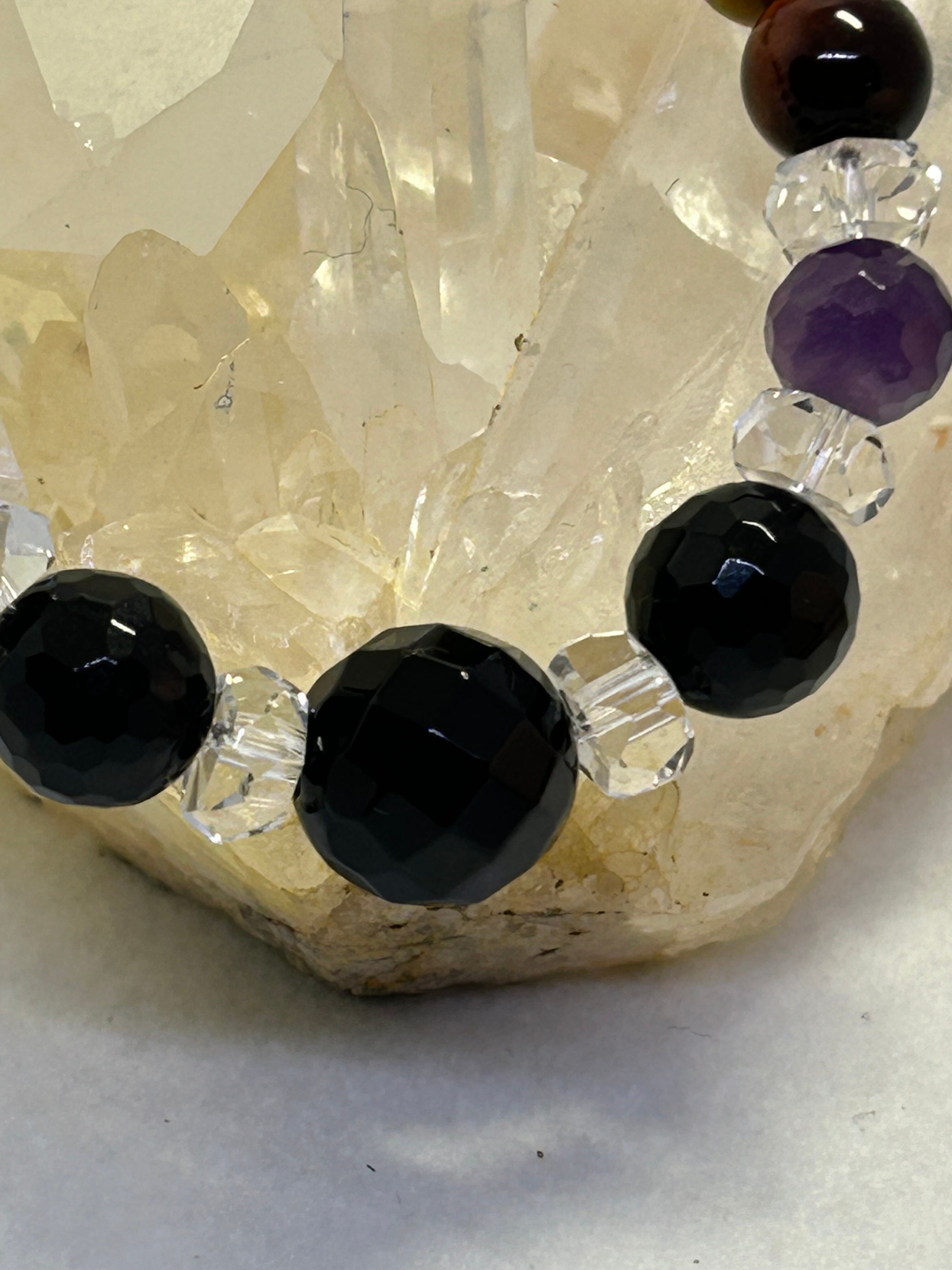 ミックスタイガーアイ&オニキスブレスレットは、魔除けの効果があると言われるオニキスと、強運を引き寄せるパワーストーンであるミックスタイガーアイを組み合わせたアクセサリーです。さらに、アメジストのパーツがアクセントとして配されており、華やかな印象を与えます。