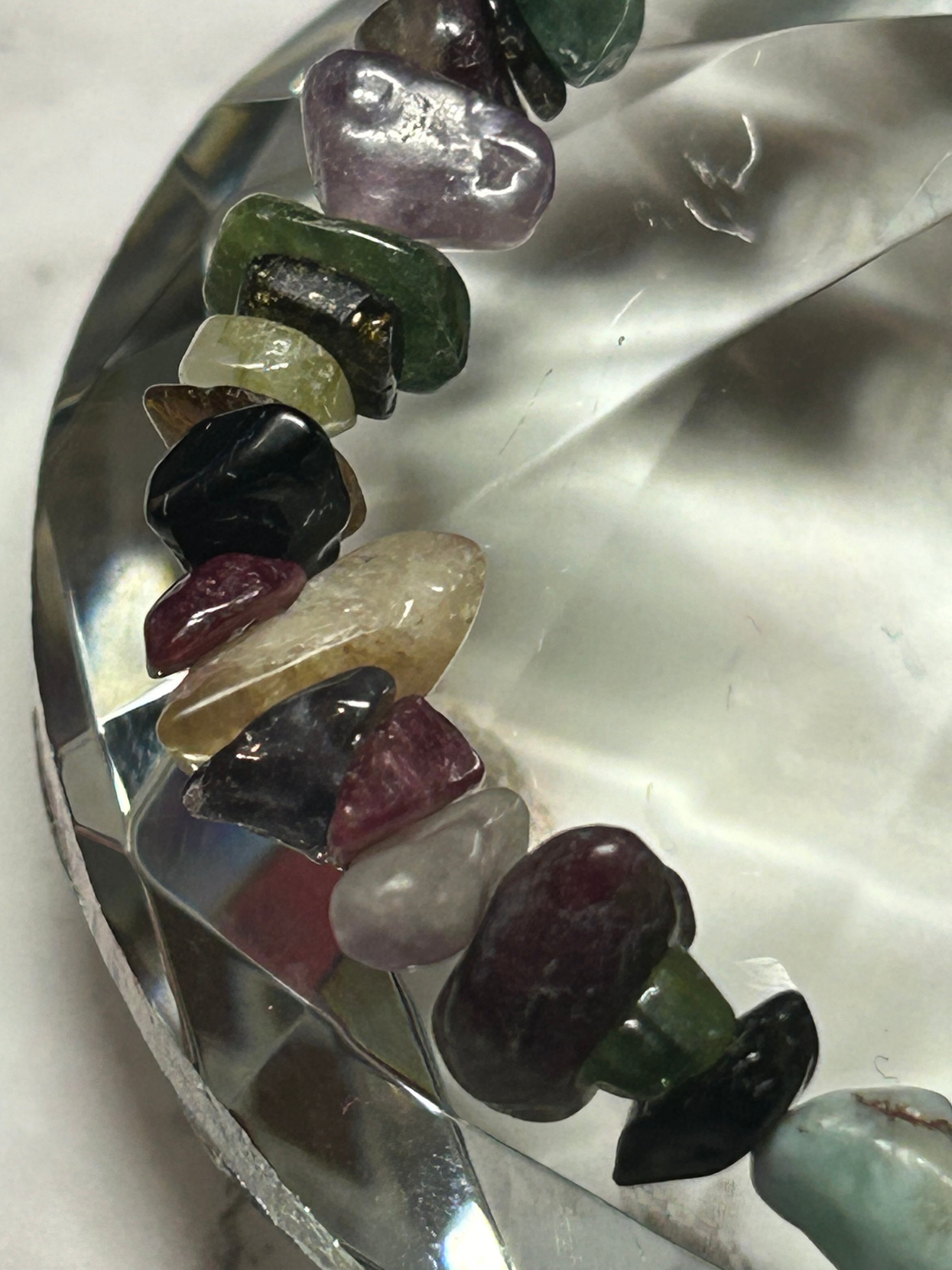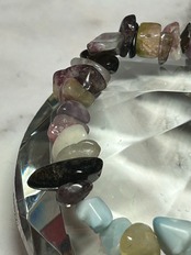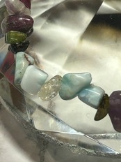 カラフルなマルチカラートルマリンと、青と白が美しいラリマーさざれ石が織り成す、個性豊かでカジュアルなブレスレットです。トルマリンの石は、様々な色が混ざり合った美しい模様が特徴で、その色合いがアクセントとなり、さりげないおしゃれを演出します。シトリン ラリマーを挟み込むことで、より一層華やかさをプラスしました。