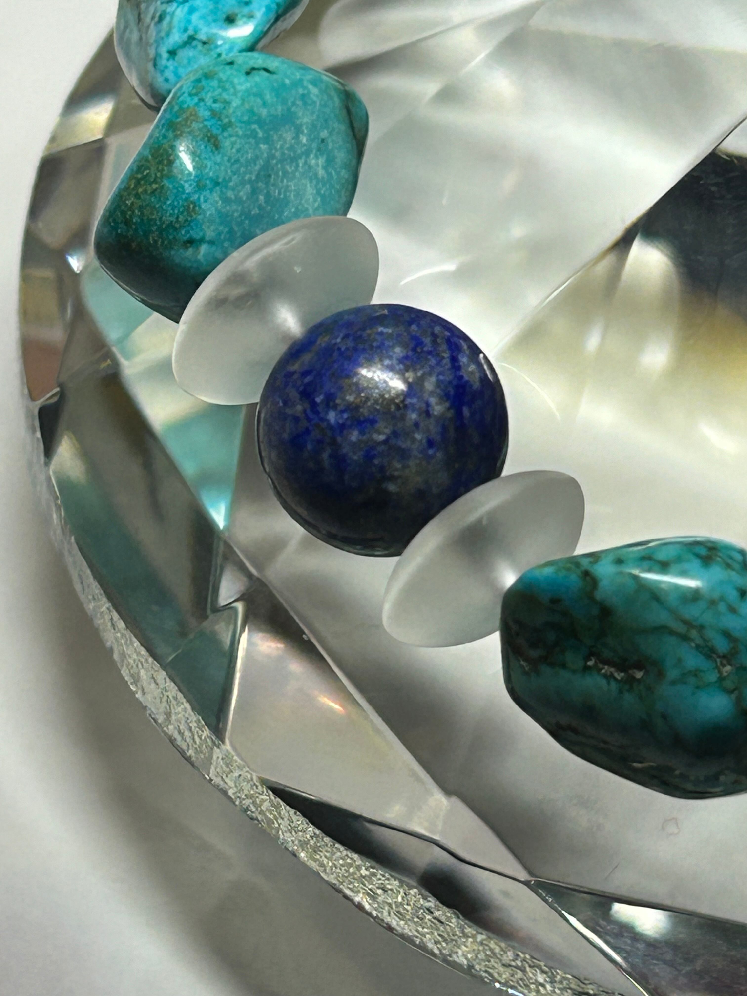 このブレスレットは、自然界の力強さと美しさを身に纏いたい方にぴったりです。ハウライトターコイズは、健康や幸福感を引き寄せるといわれ、心身のバランスを整えるお守りとしても知られています。一方、ラピスラズリは古代から奇跡を起こす力があるとされ、知恵や洞察力を高めると言われ目標達成のお守りにピッタリです。