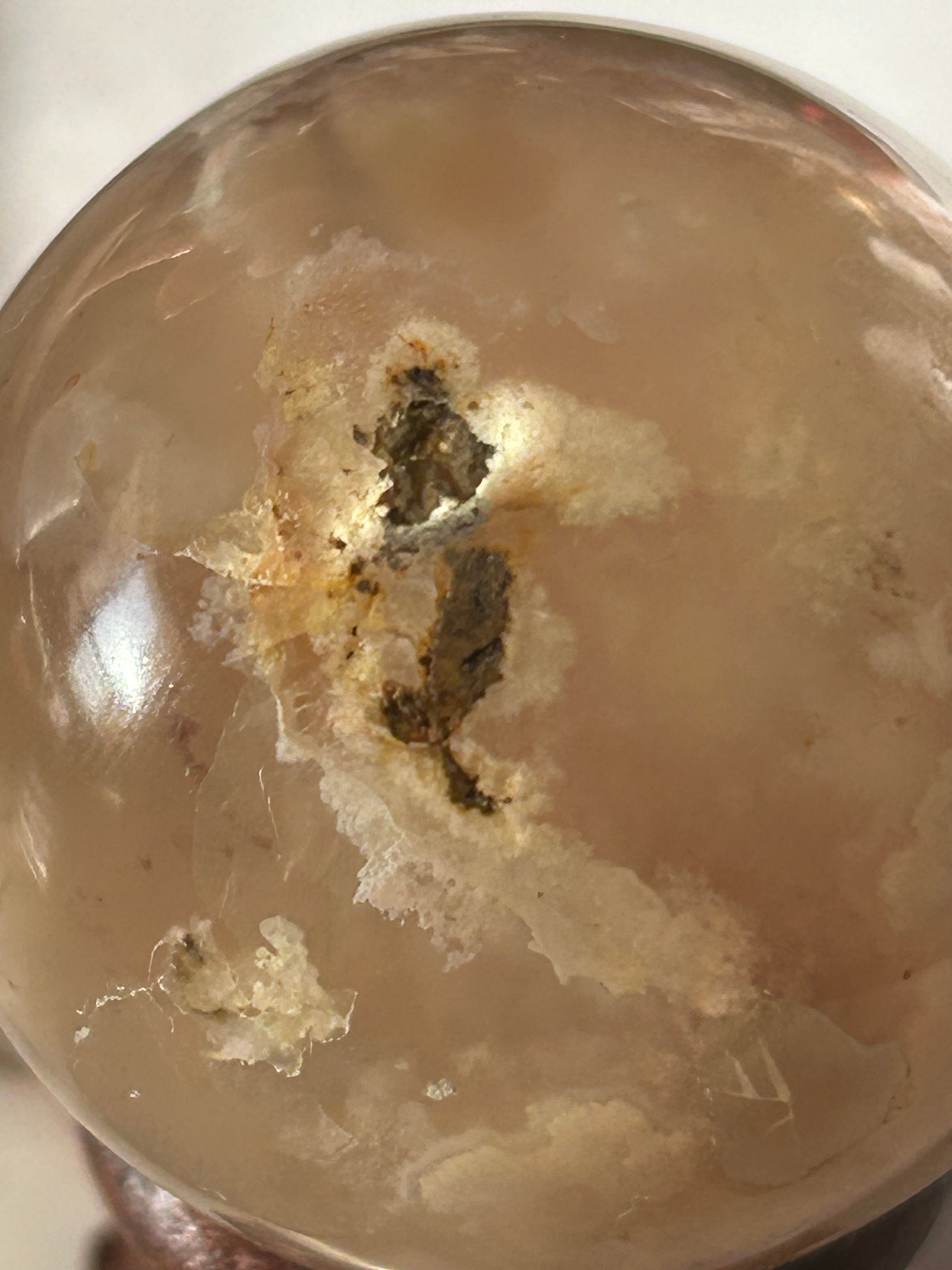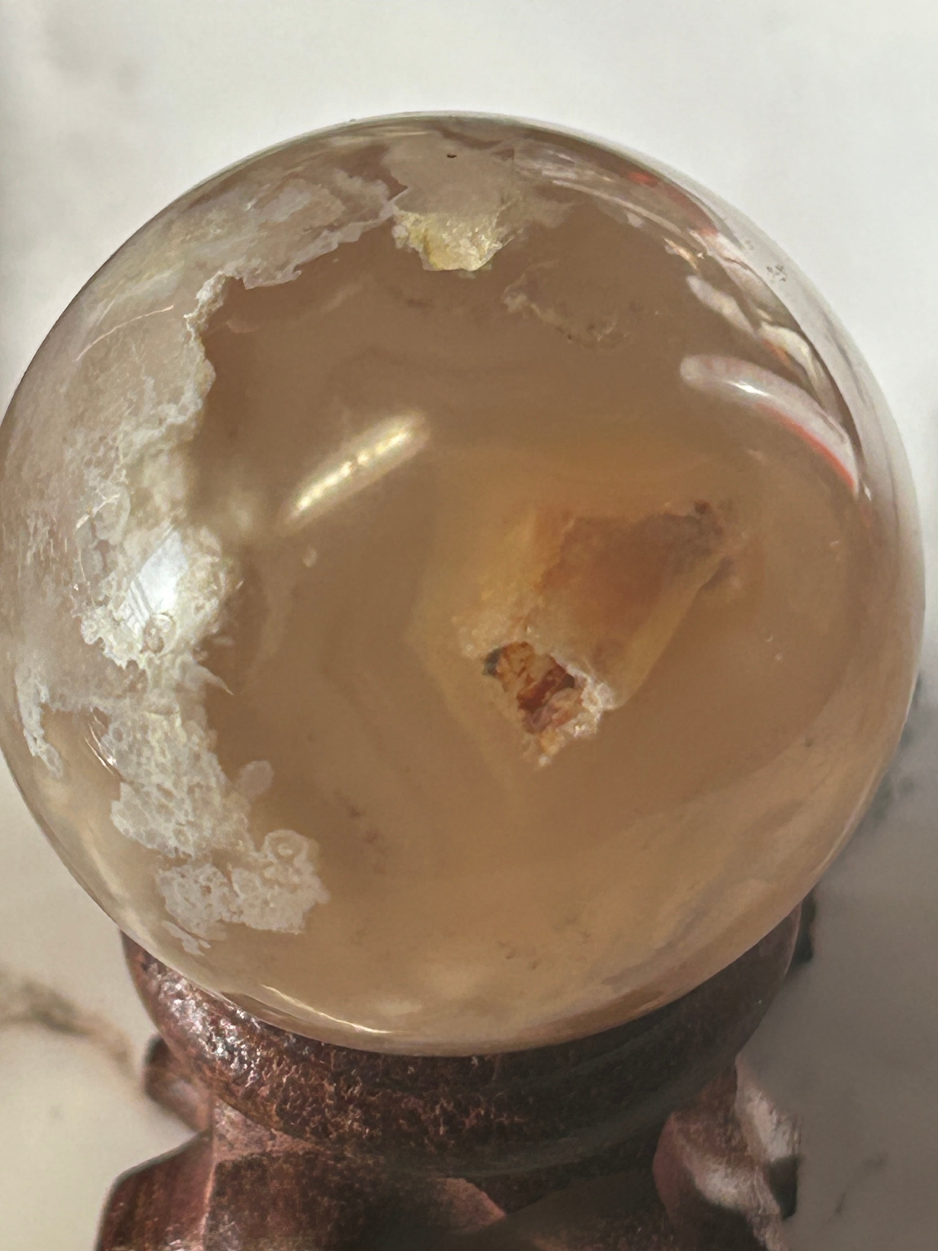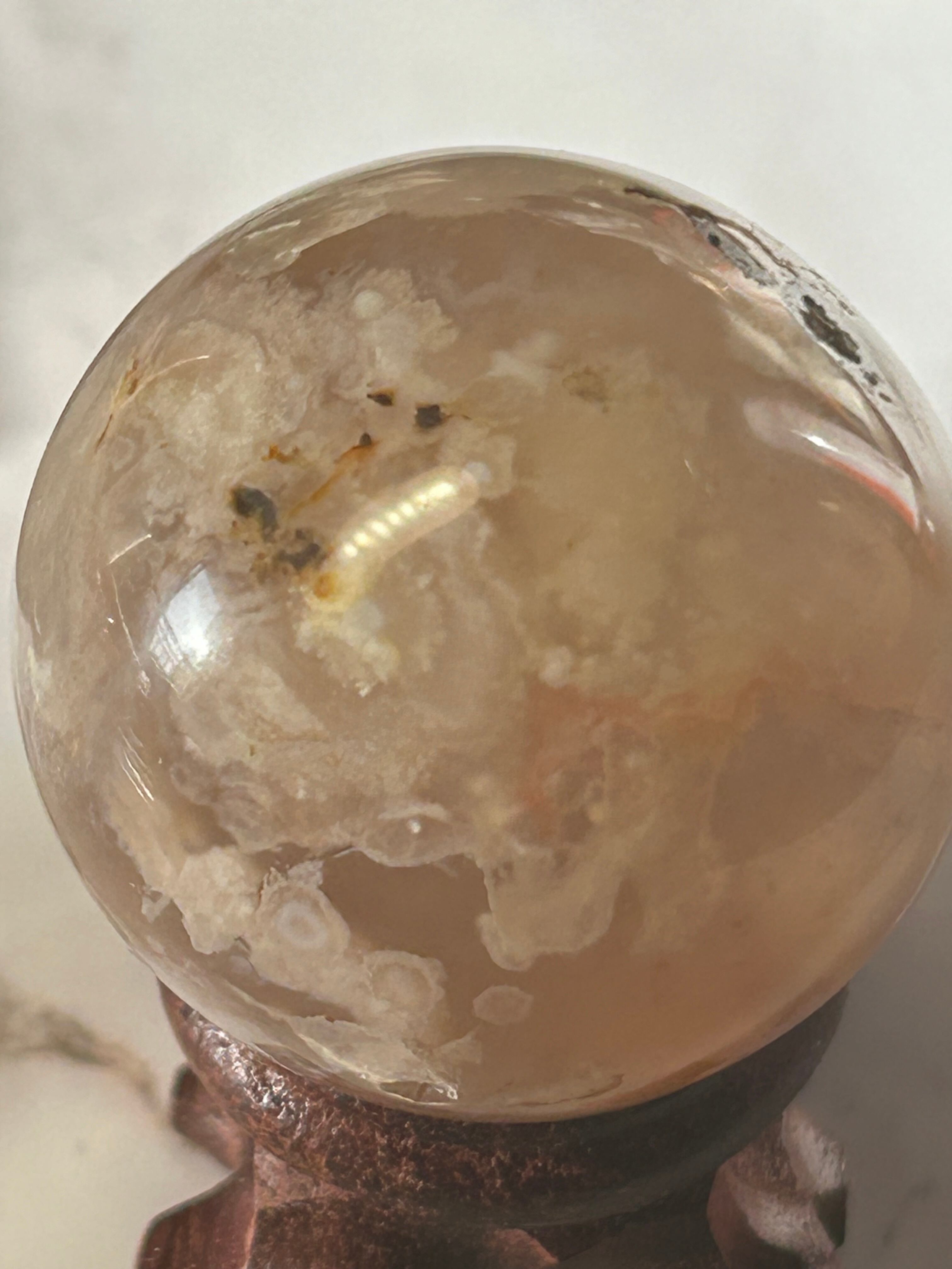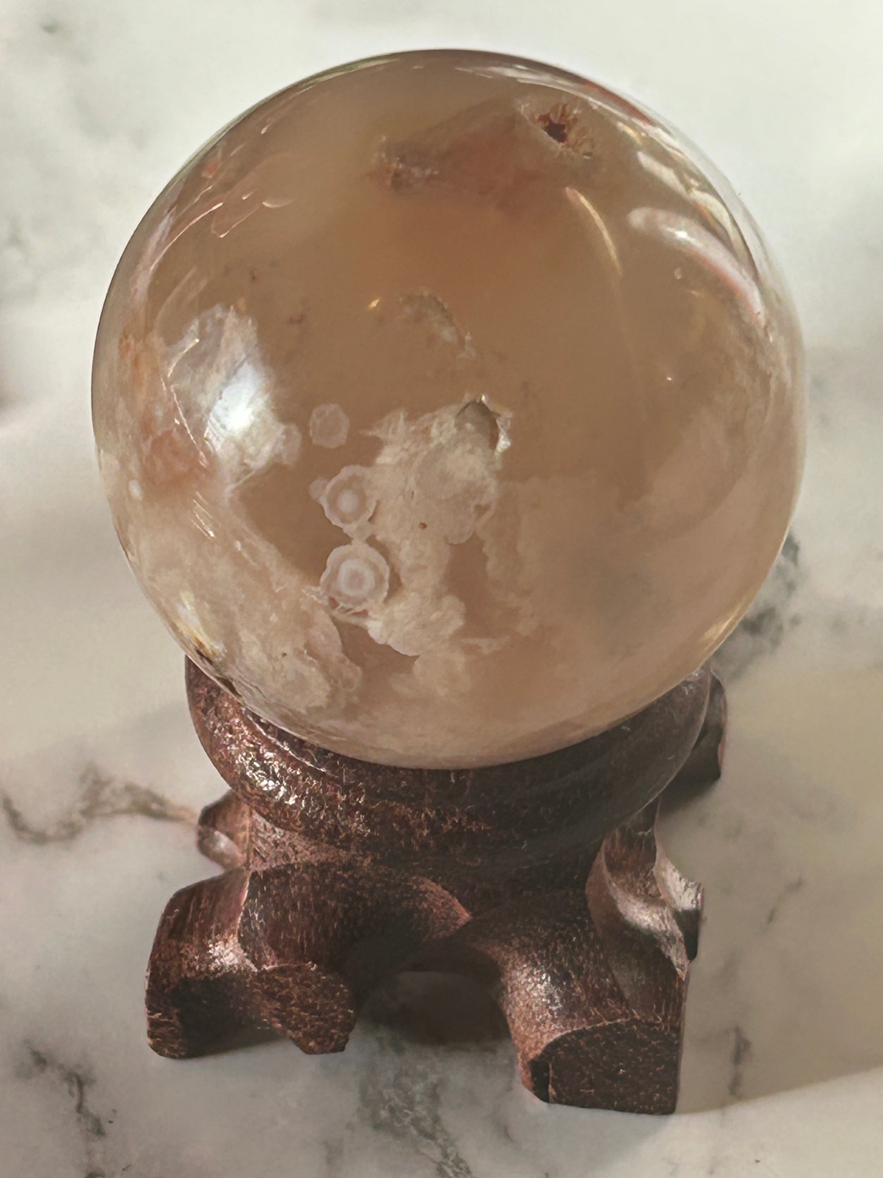 スノーフレイクさくら瑪瑙 スフィアは、天然の美しい模様が施された瑪瑙のスフィアです。瑪瑙は、古くから幸運や保護の象徴とされてきた貴重な石です。このスノーフレイクさくら瑪瑙 スフィアは、その中でも特に珍しいスノーフレイク模様が広がる一品です。スノーフレイク模様は、まるで雪が降る様子を表しており、神秘的かつ優美な雰囲気を醸し出しています。