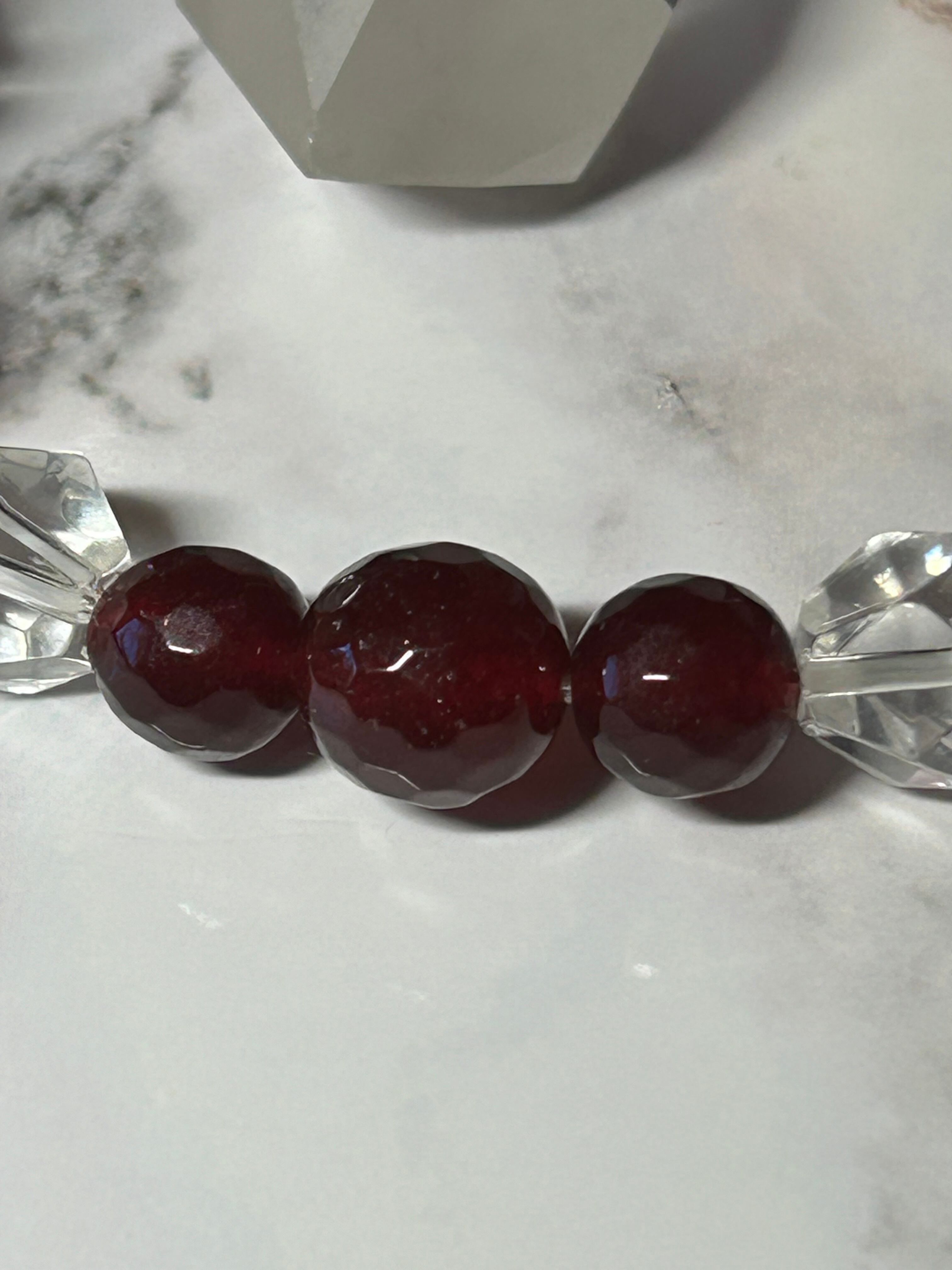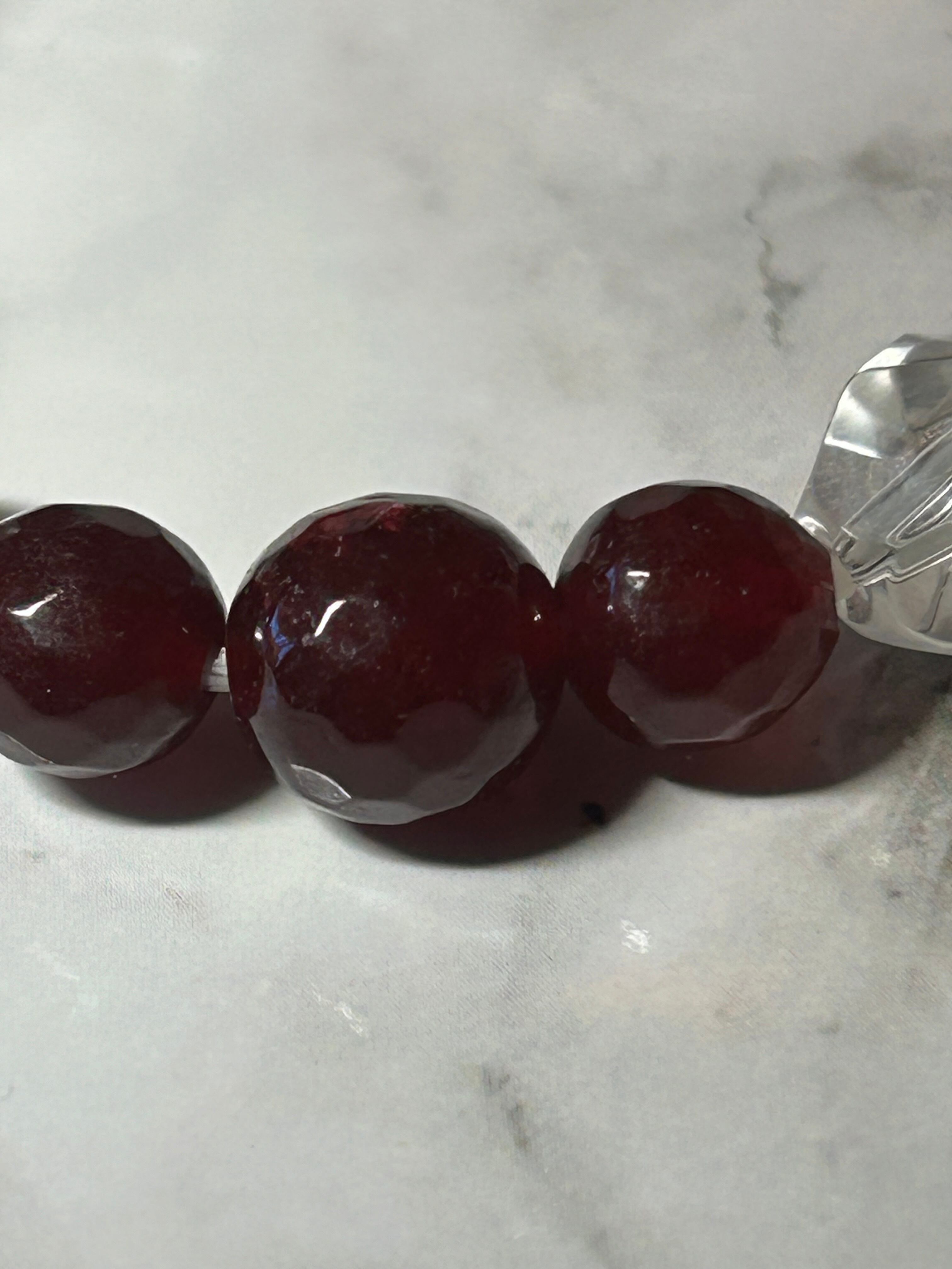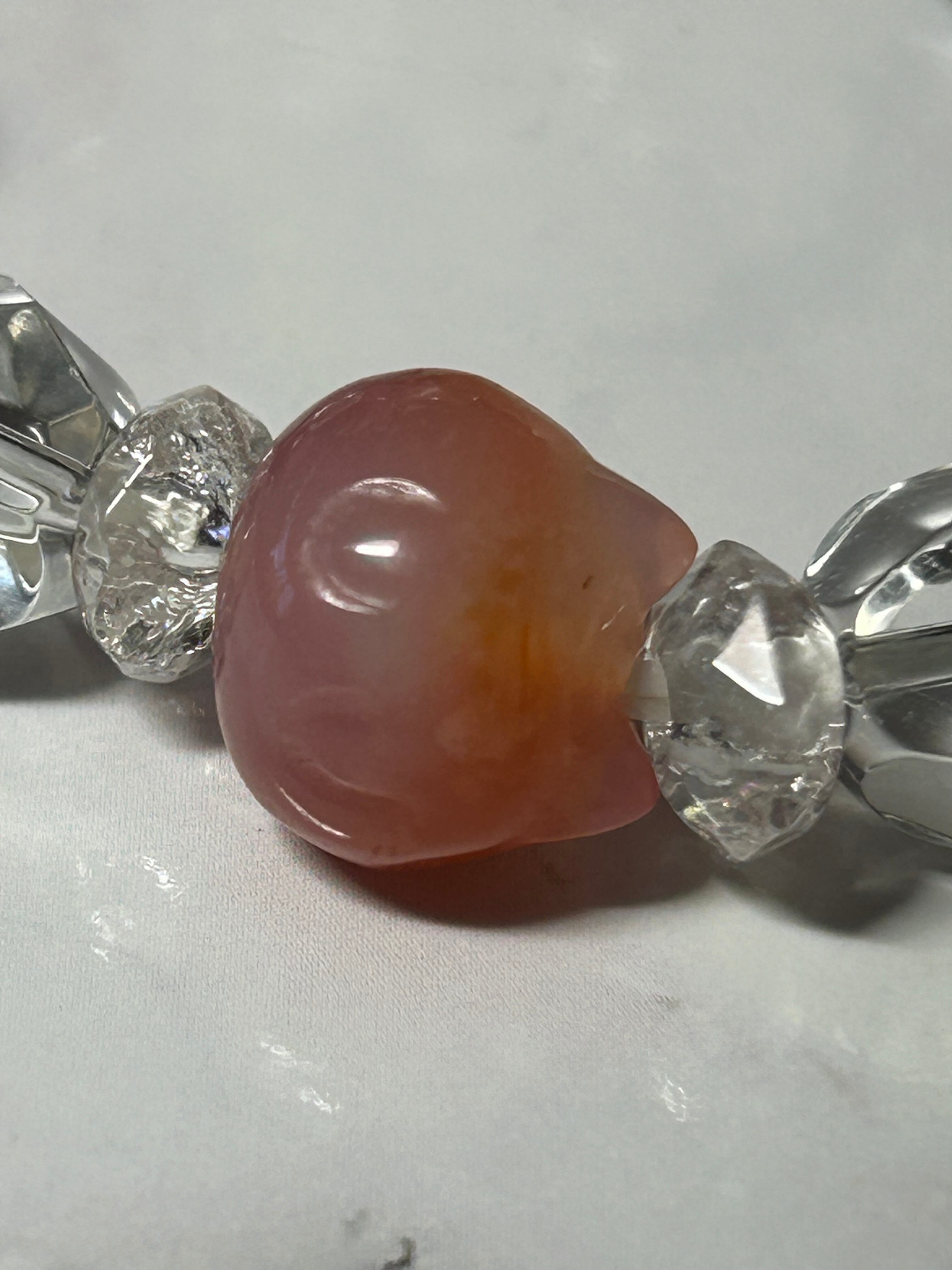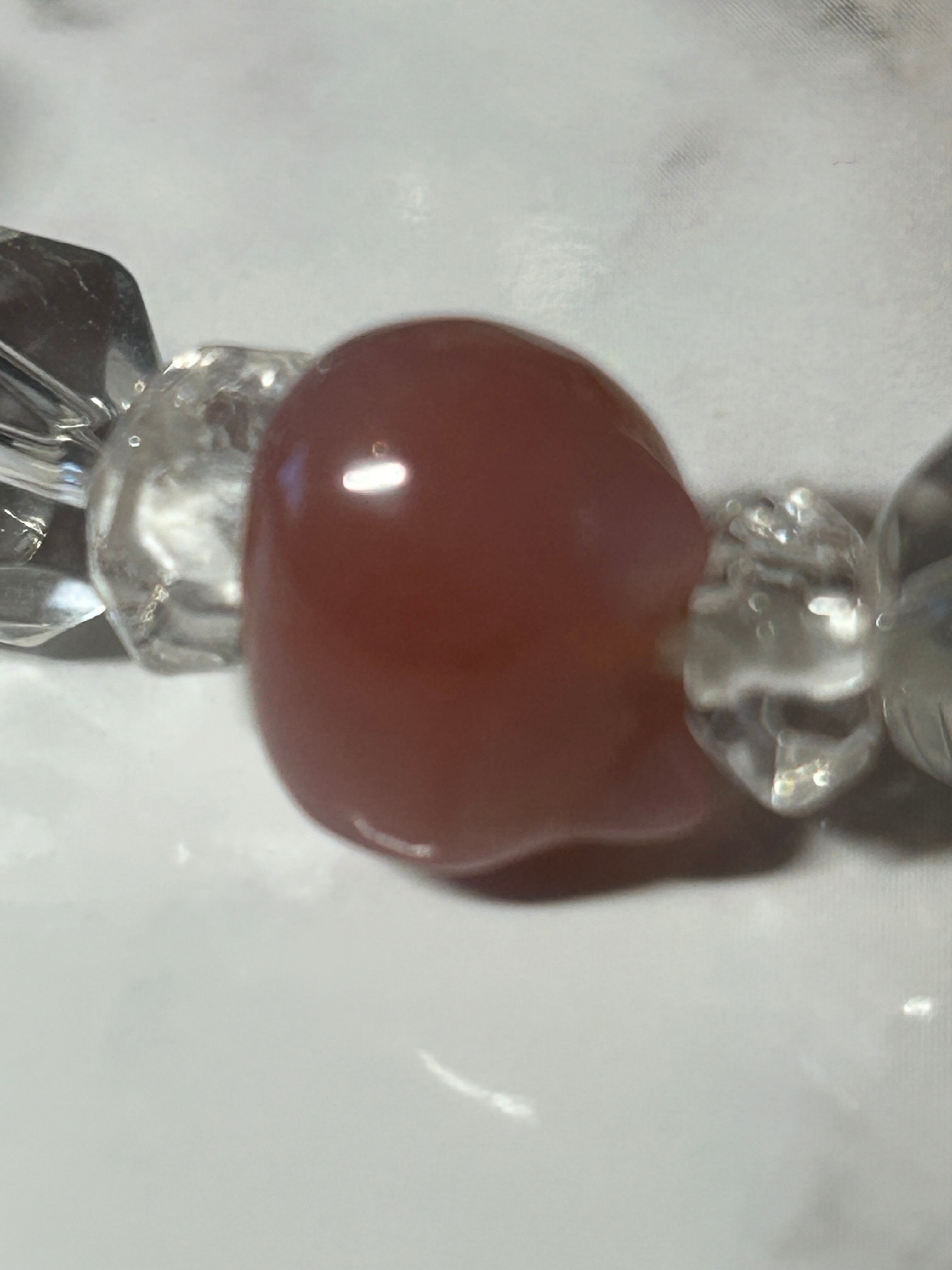 このネコ付きカーネリアン、ガーネットブレスレットは、猫の顔が可愛らしいデザインが特徴です。カーネリアン、ガーネット、水晶の組み合わせが、キラキラと光り輝き、華やかな印象を与えます。