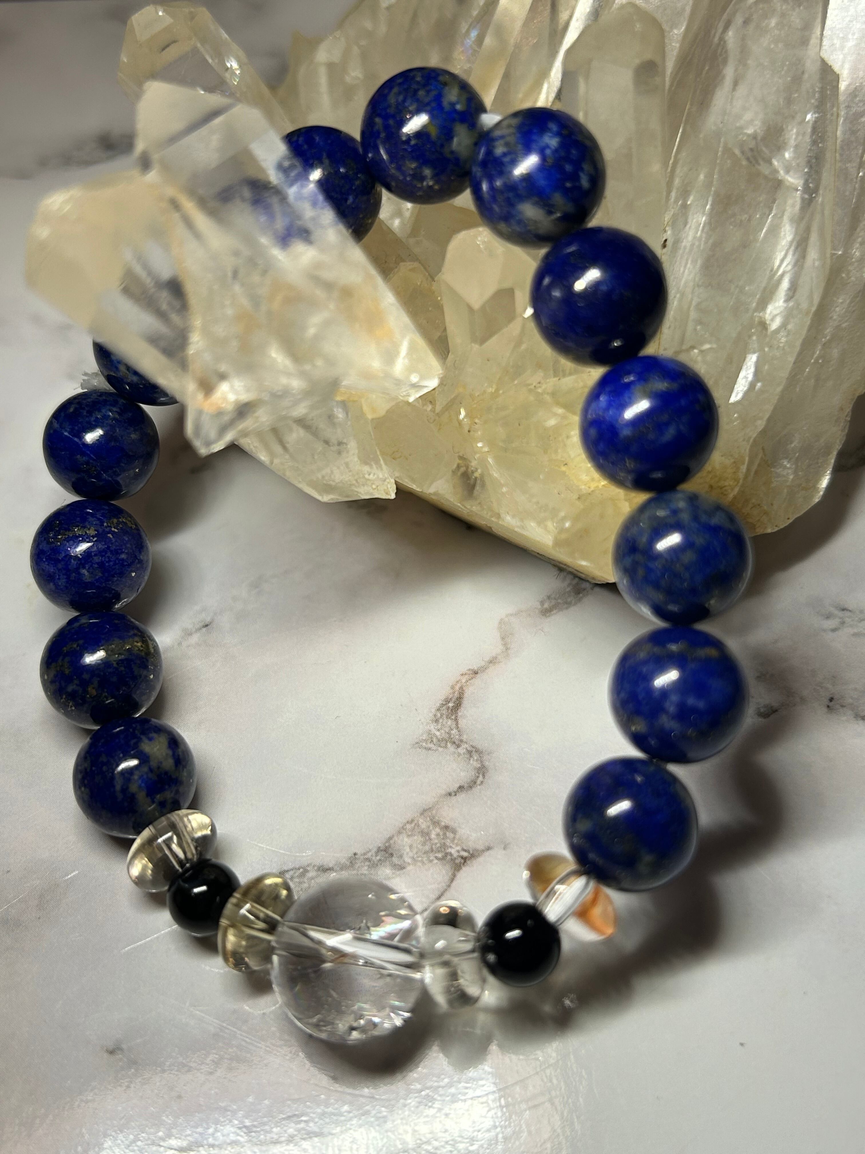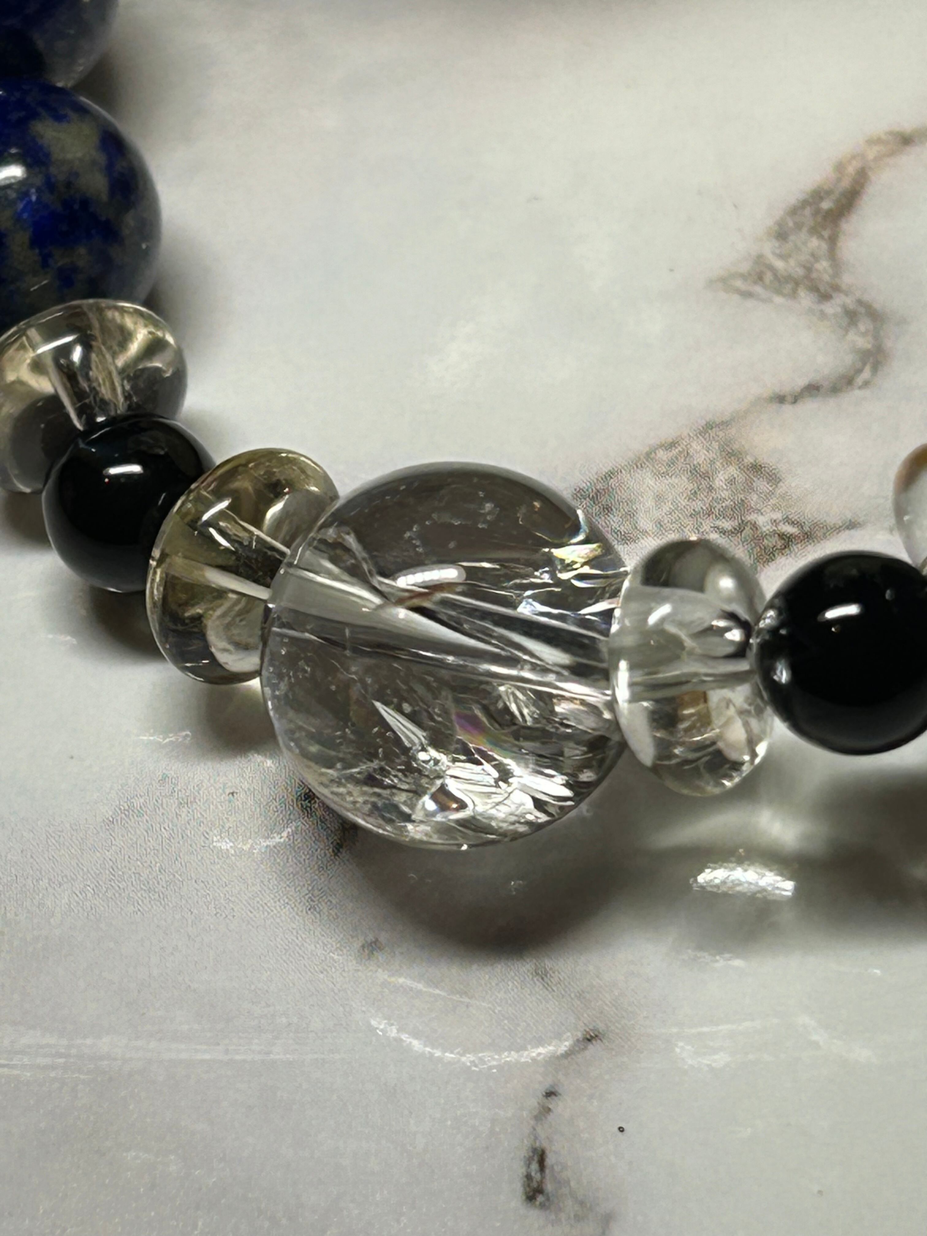輝くアイリスと深いブルーのラピスラズリが織りなす大人ブレスレット。6mmのオニキスがアクセントとなり、上品な印象を引き立てます。日常使いにさり気なく手首に彩りを与えてくれるブレスレットです。