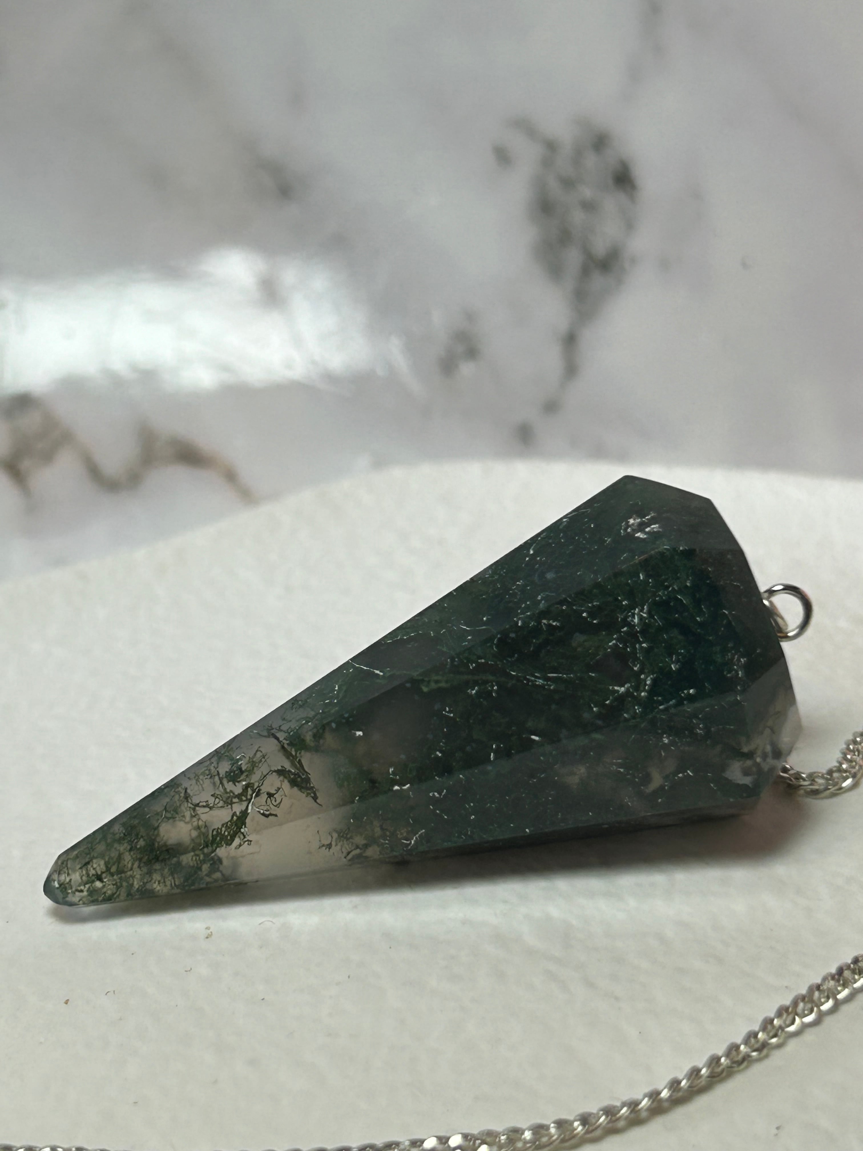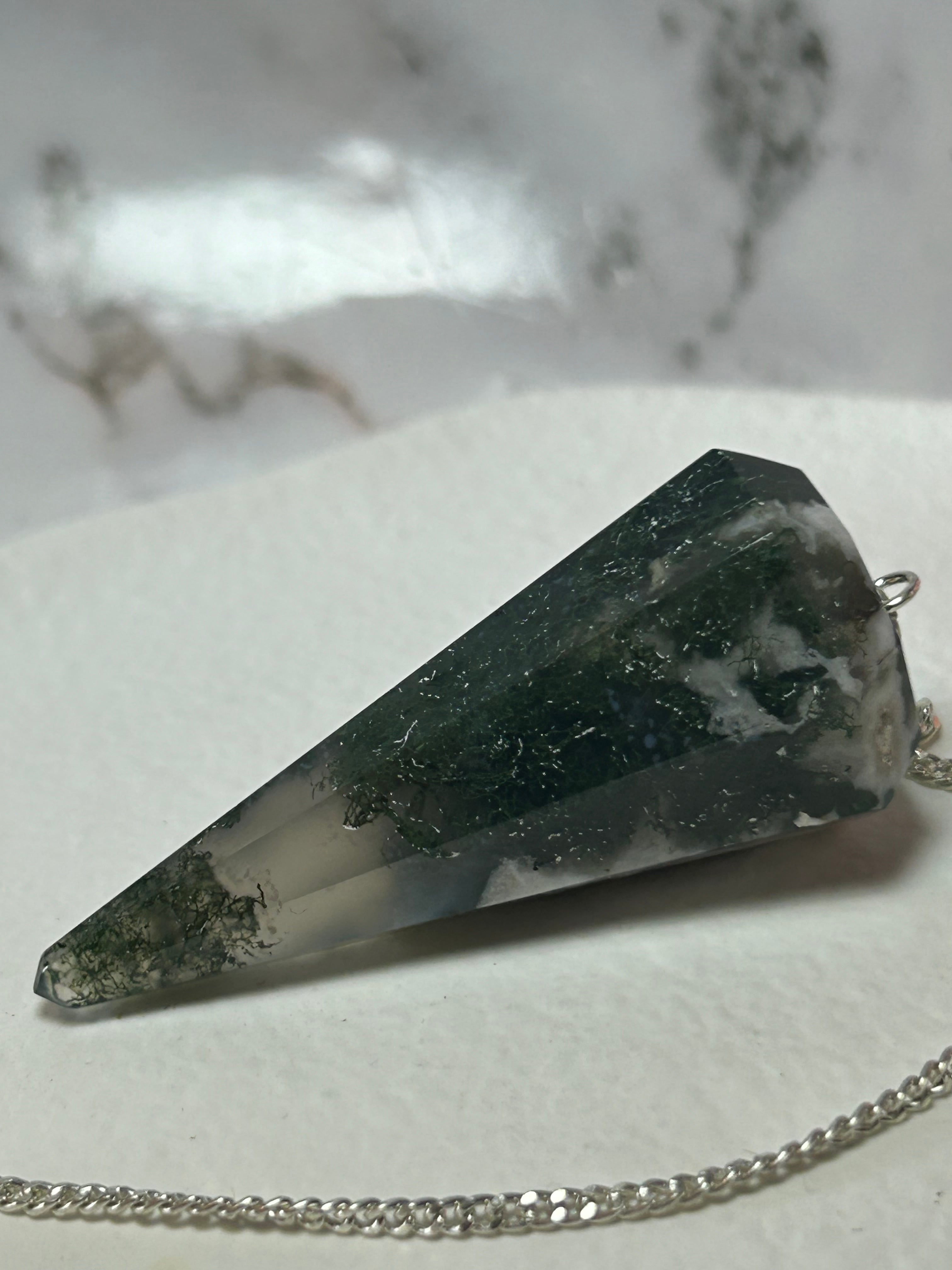 モスアゲートペンデュラムは、角度によって異なる景色が楽しめる魅力的なアイテムです。