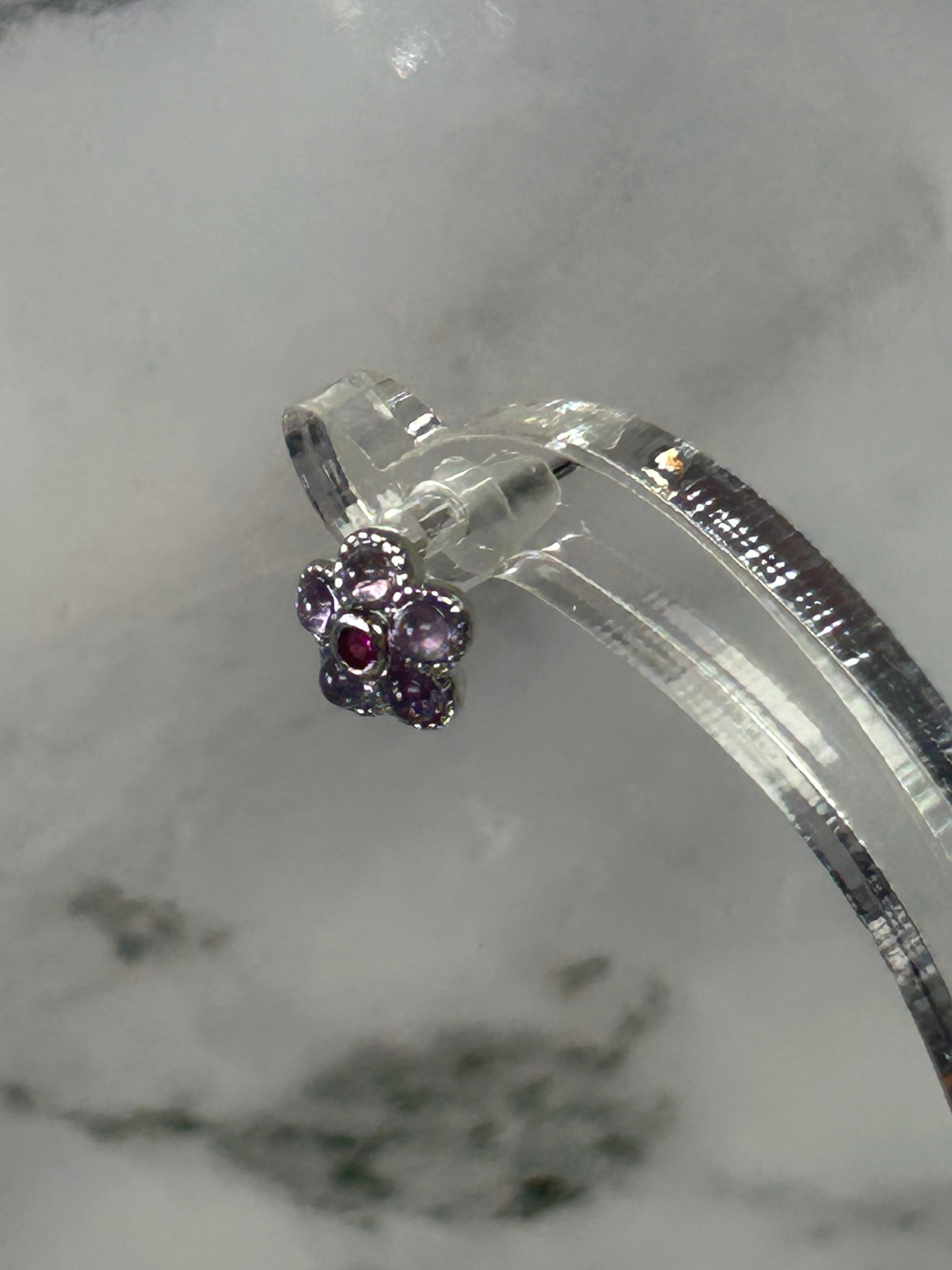 華やかな花のモチーフが印象的なタンザナイト&ガーネットお花ピアス。一輪の花をイメージしたデザインは、耳元を華やかに彩ります。上品なパープルのタンザナイトが花びらを演出し、中心に輝く赤いガーネットがアクセントとなっています。