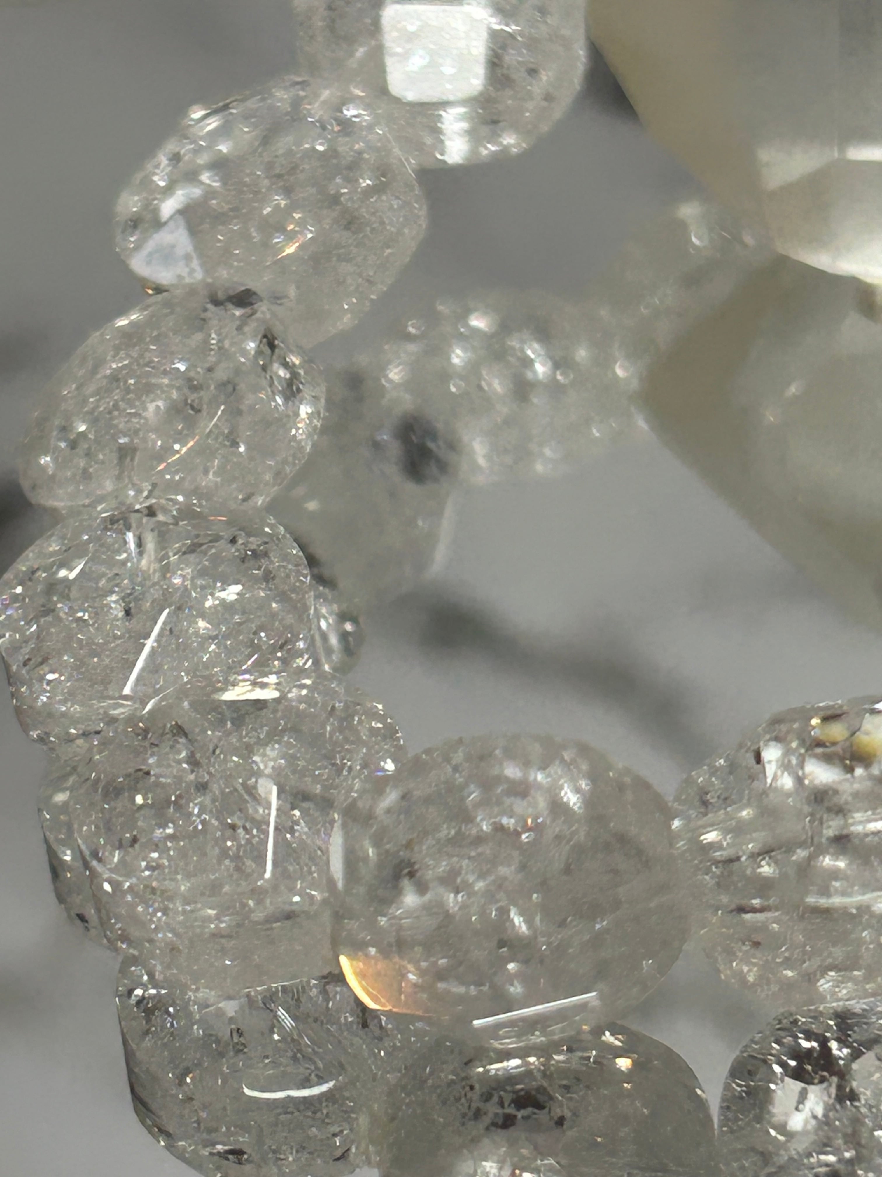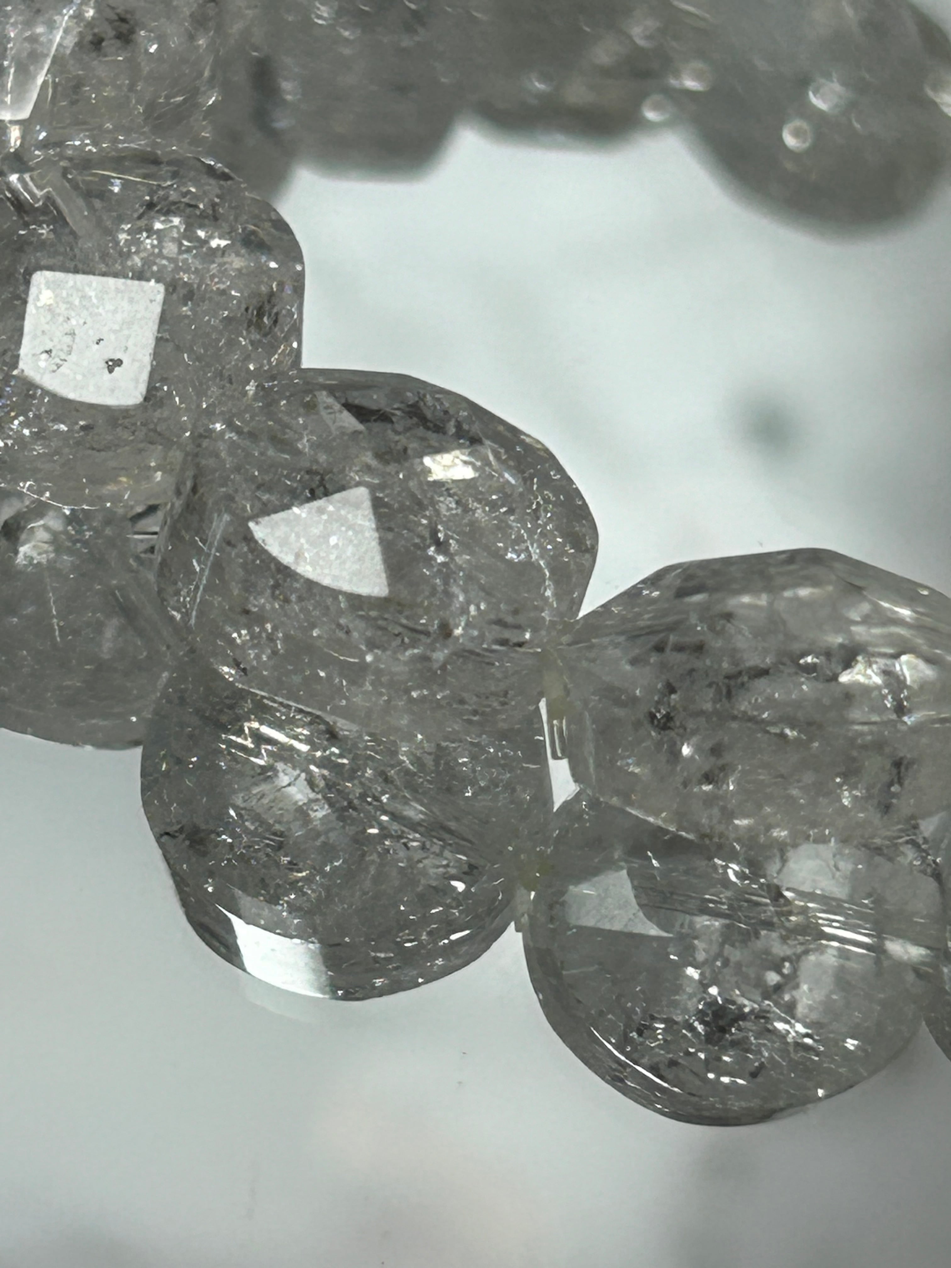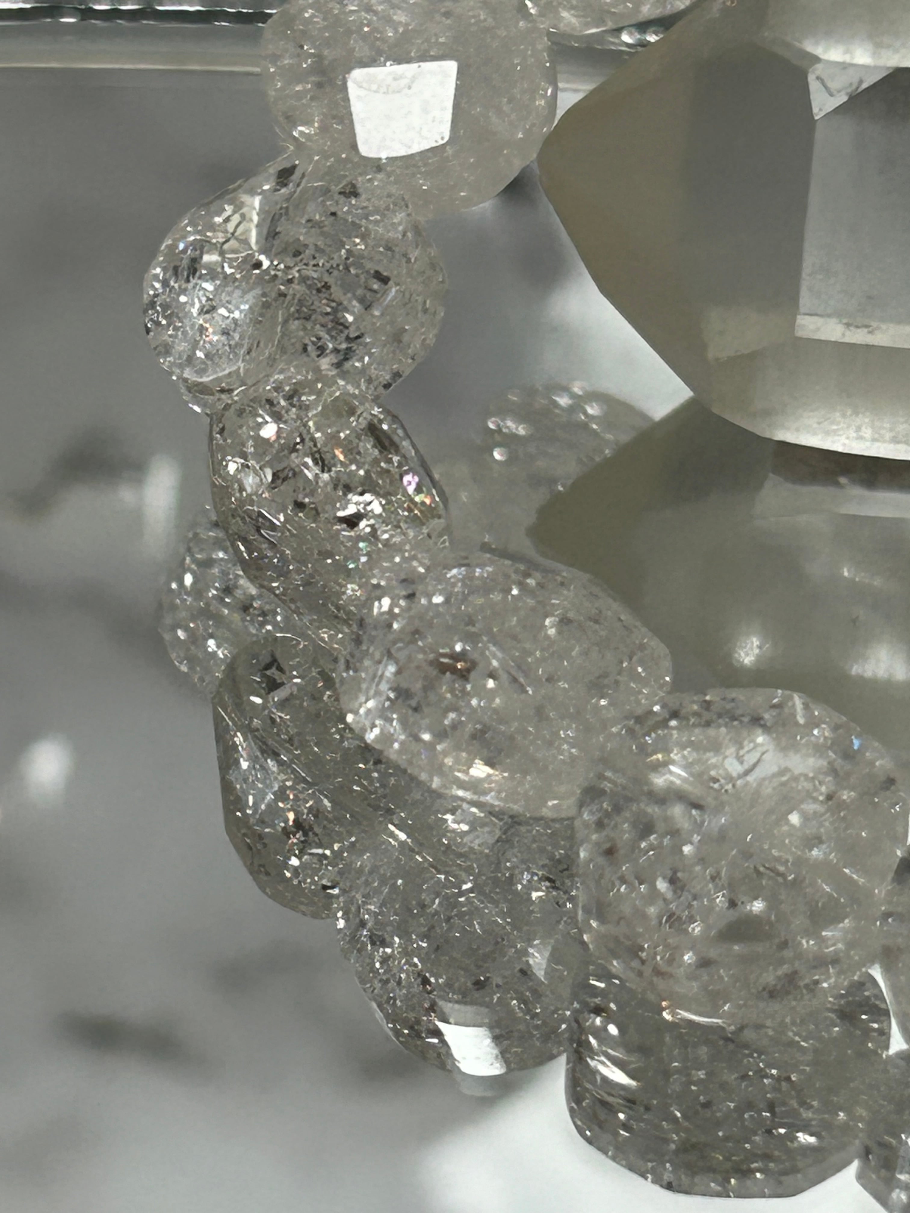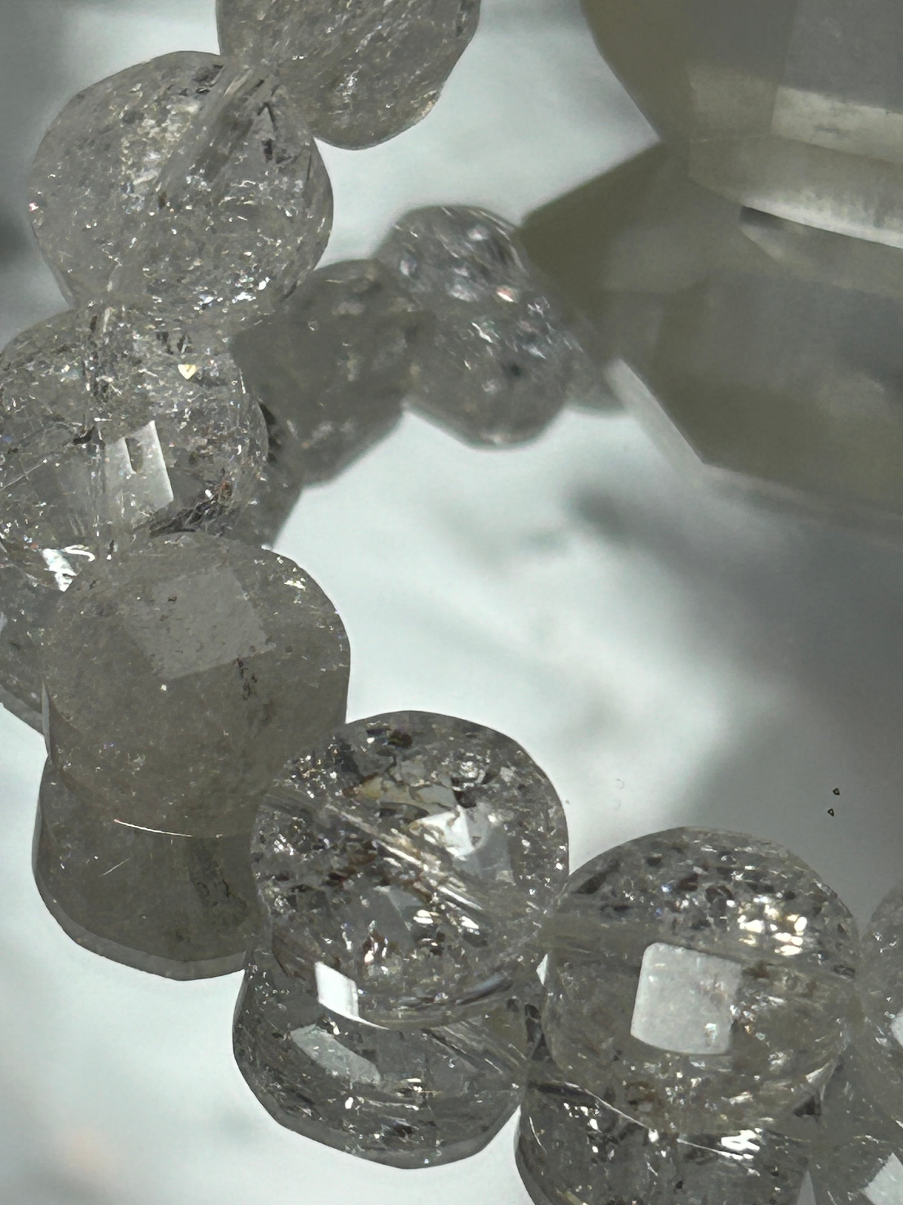ヒマラヤ水晶 クラックボタンブレスレットは、自然の美しさを感じさせるヒマラヤ水晶を使用した、クラックの入ったボタン型のブレスレットです。独特なクラック模様が入った水晶は、一点一点が個性的な輝きを持つブレスレットです。