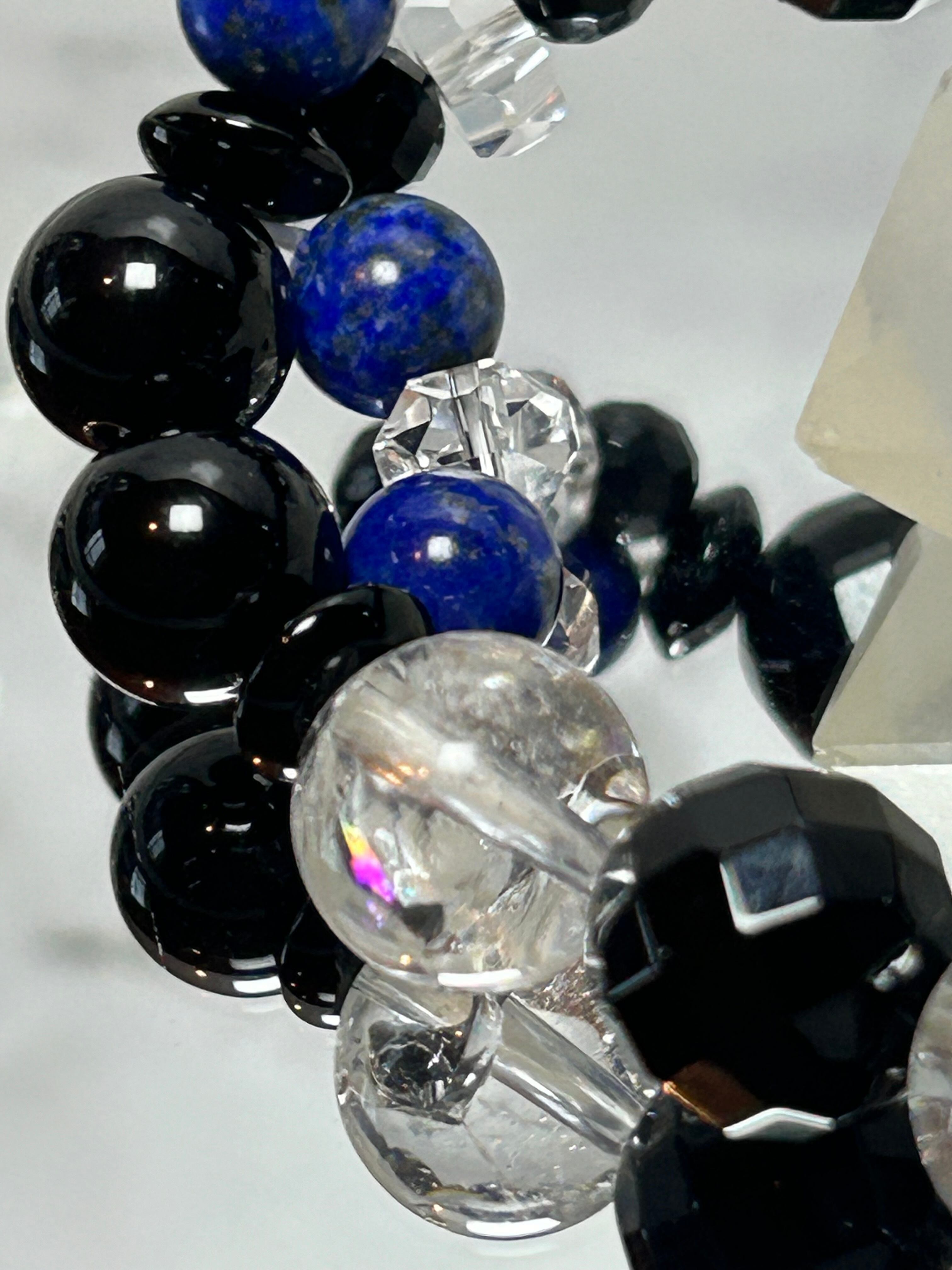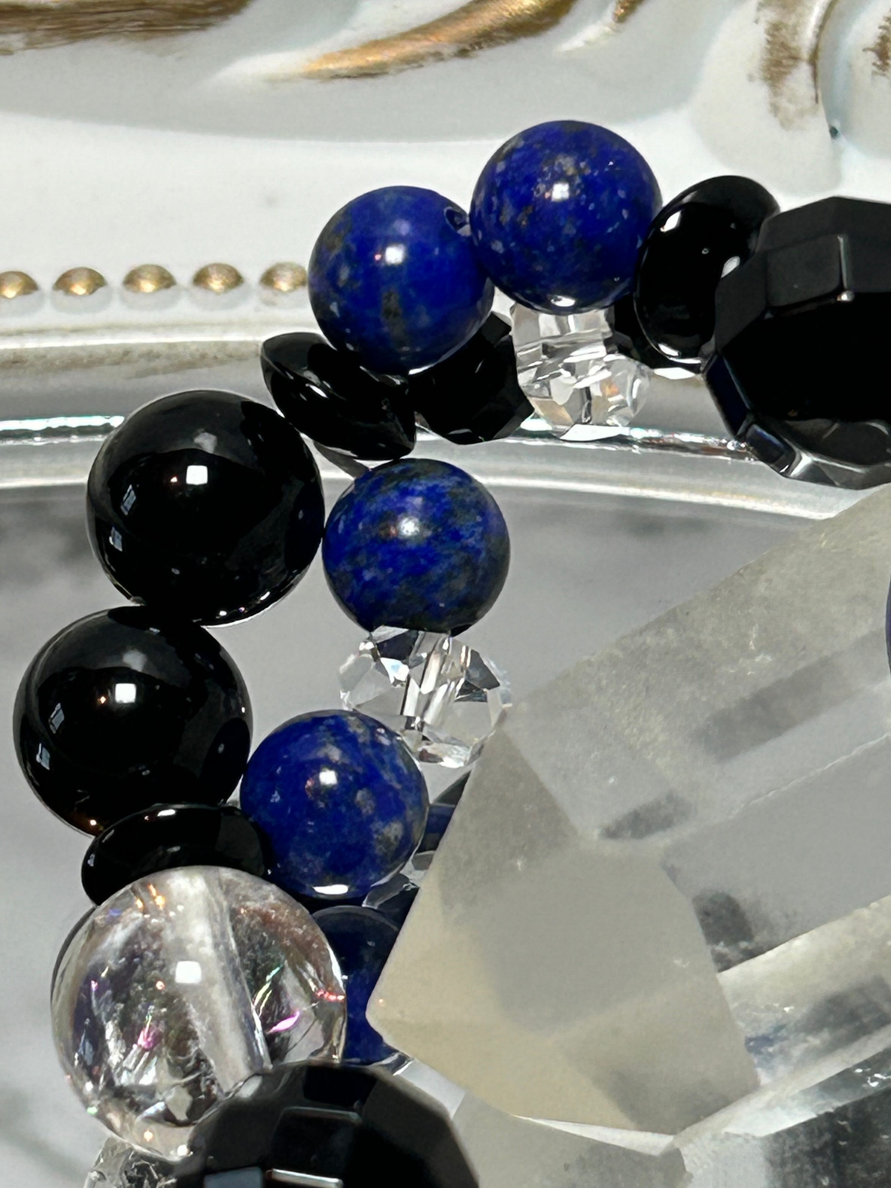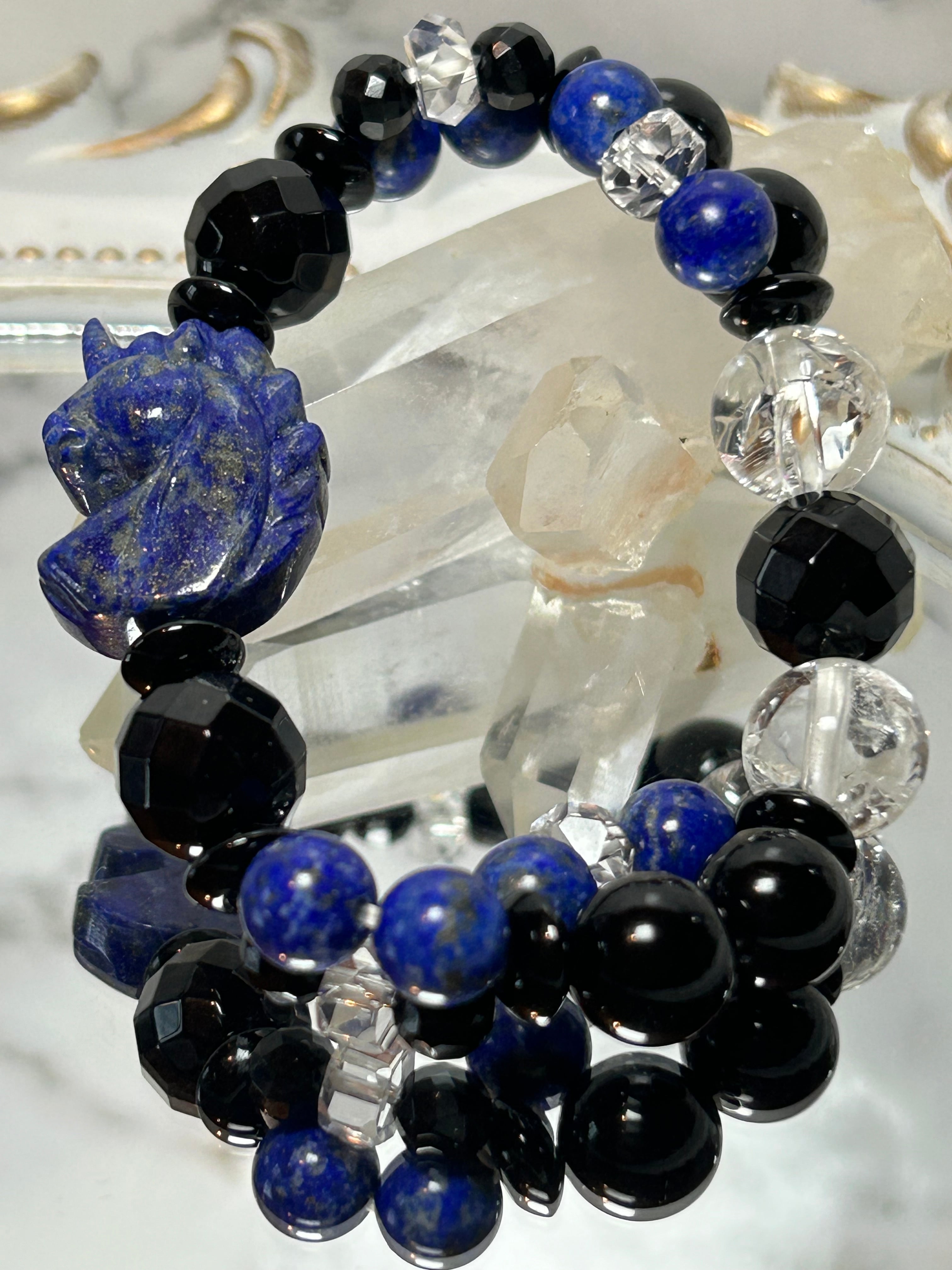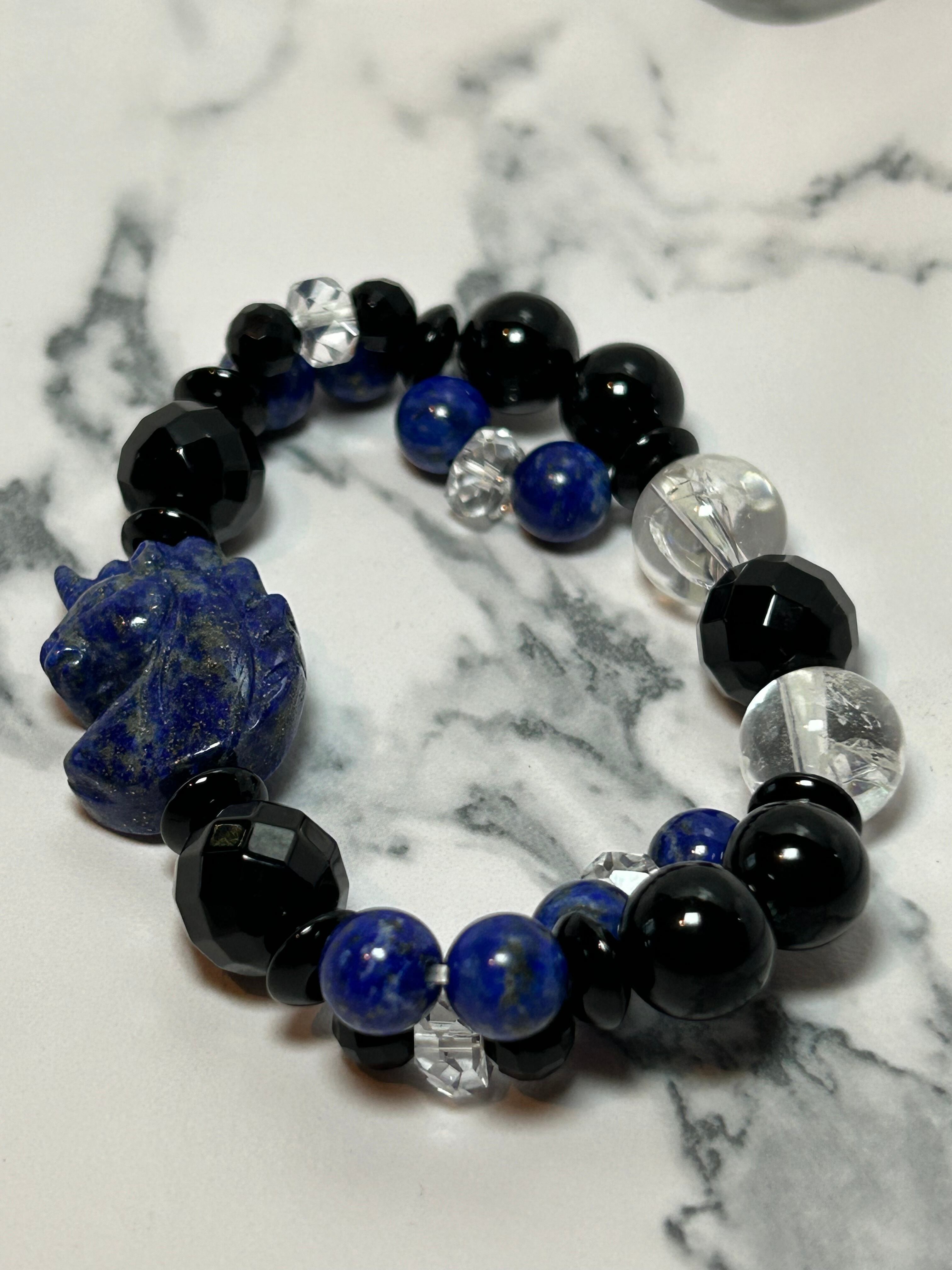 ユニコーンは純粋さや希望を象徴する存在とされている神獣です。小ぶりのラピスラズリで出来たユニコーンを中心にオニキスと水晶を組み合わせたブレスレットです。