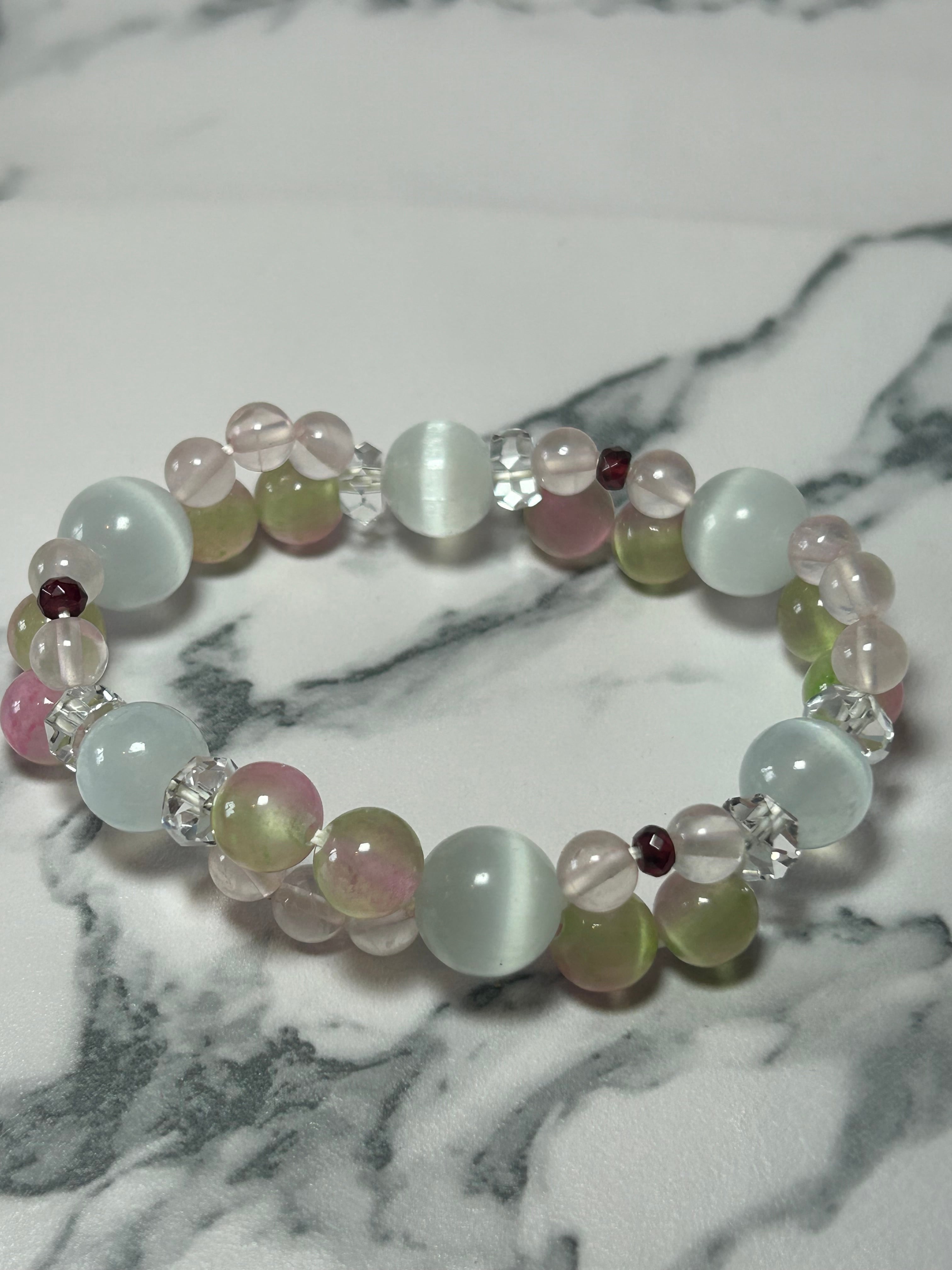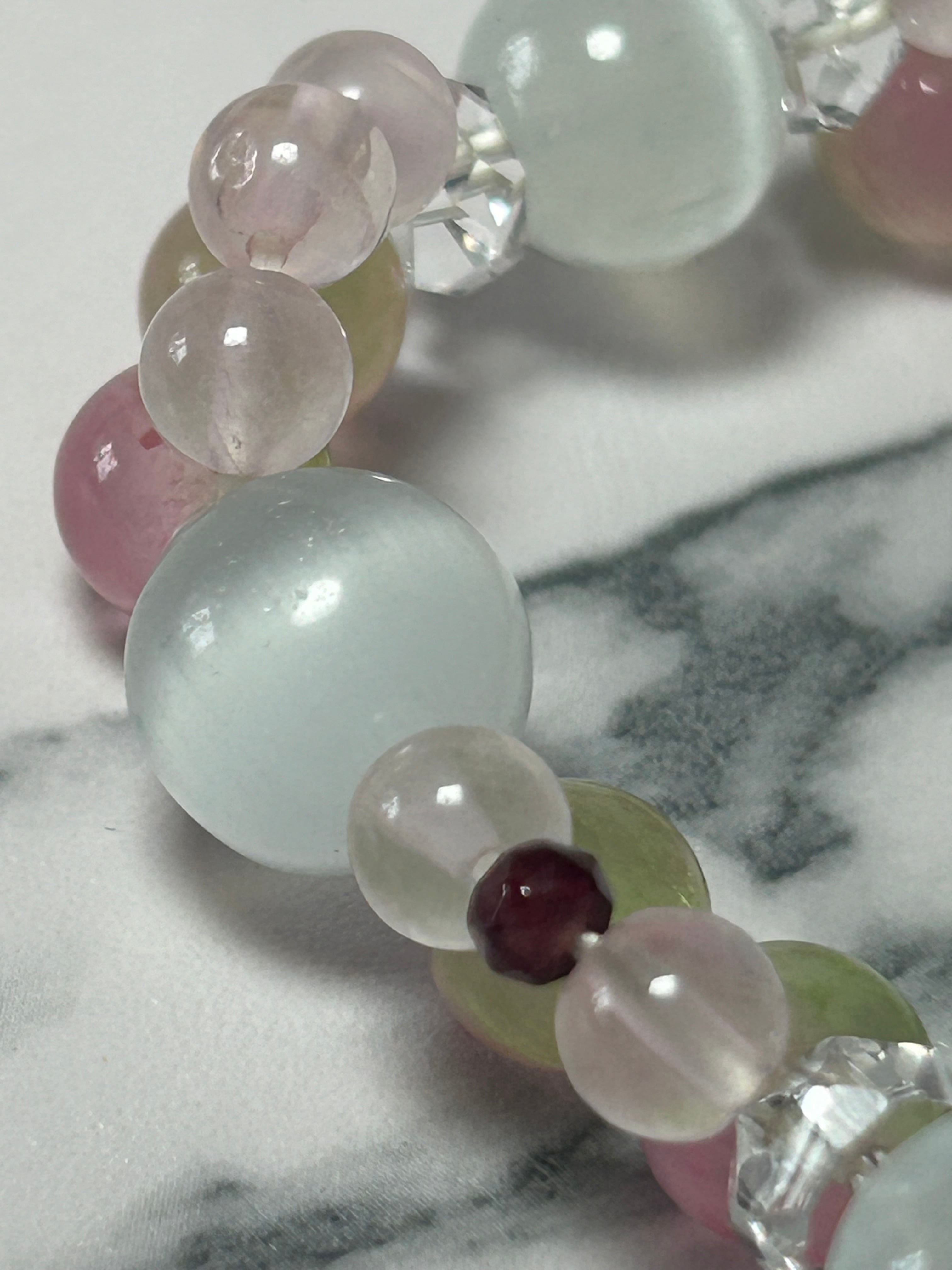 大小のセレナイトを組み合わせた華やかなデザインが手元を優しく彩ります。
