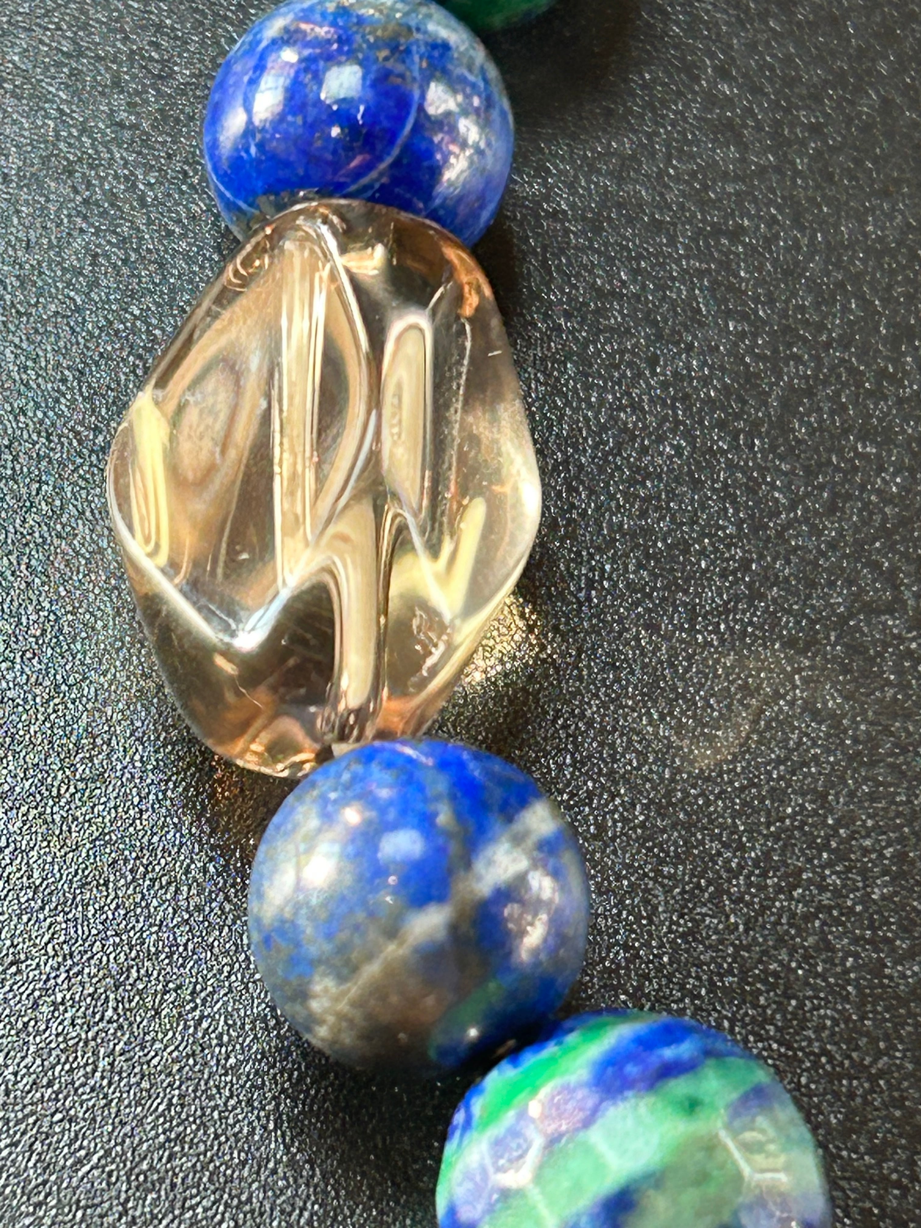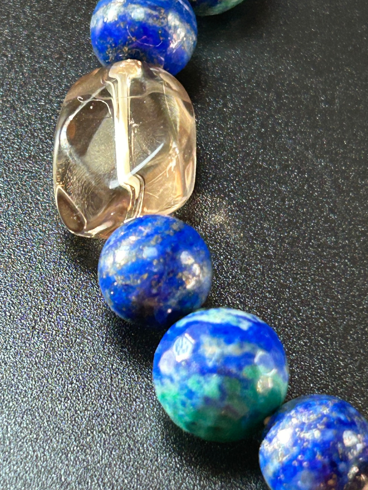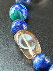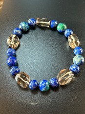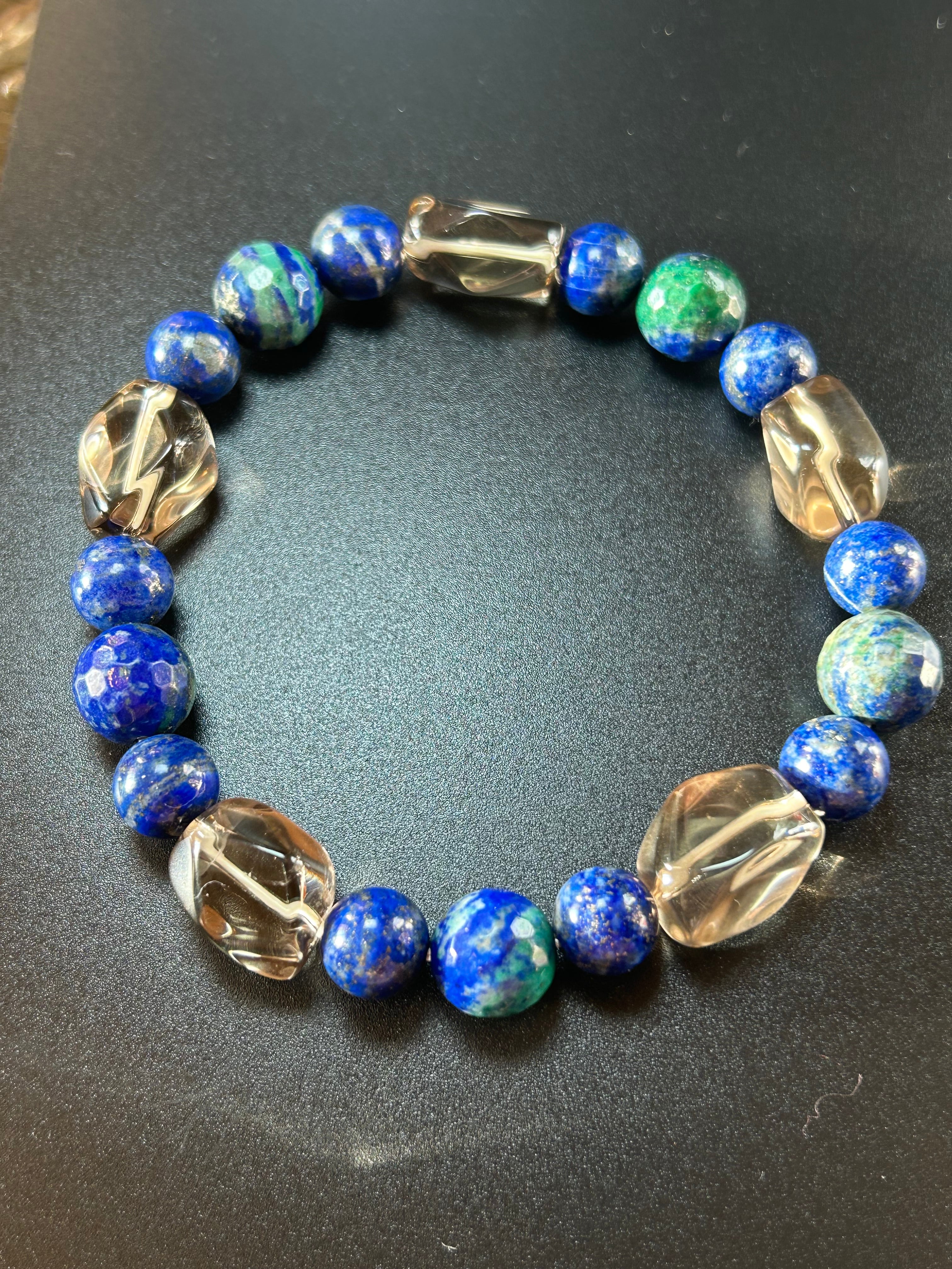 フリーカットのスモーキークォーツを使用し、ラピスラズリとナチュラルクリソコラのカット玉を挟んだスタイルが特徴のブレスレットです。