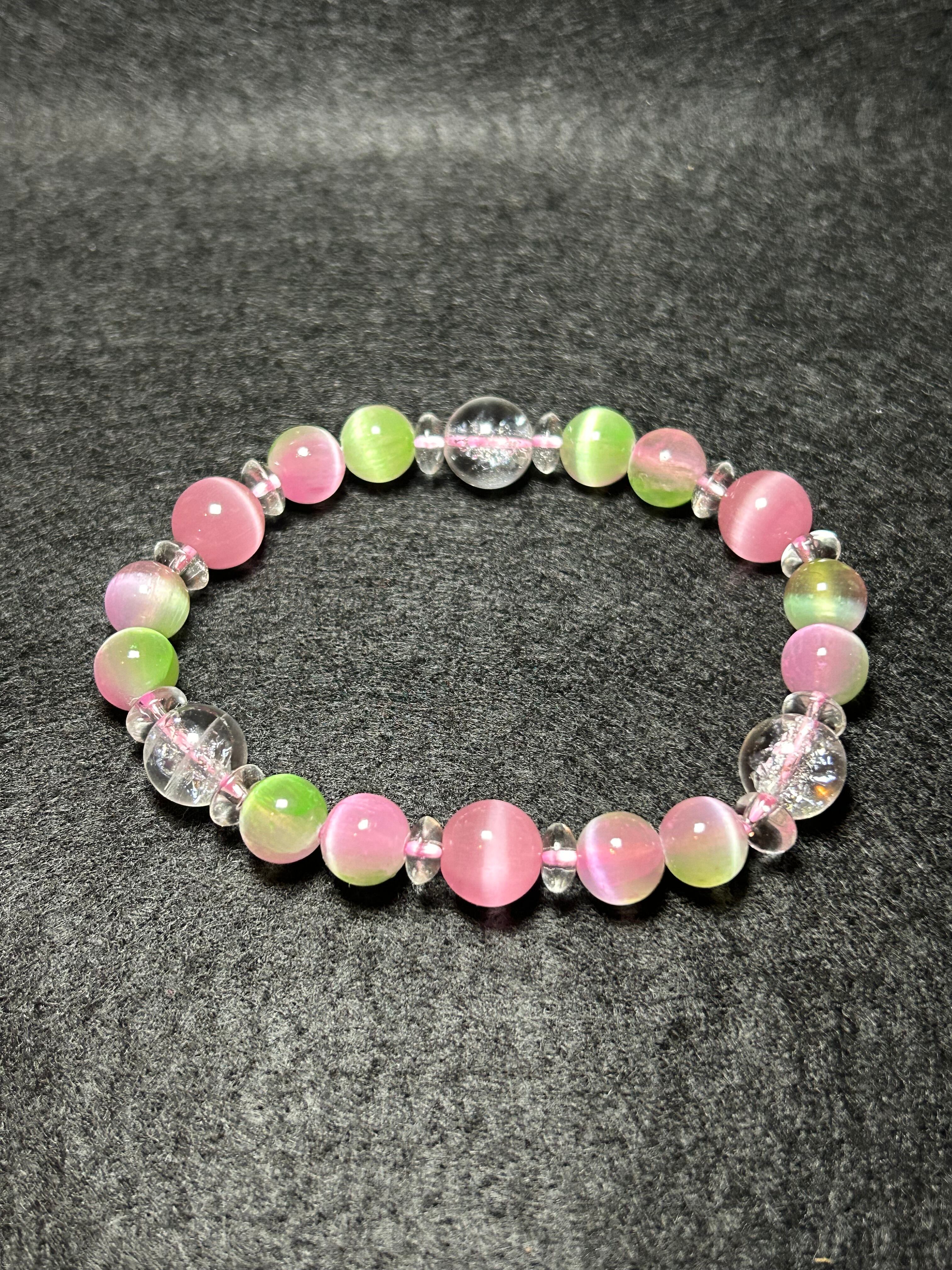 鮮やかなピンクのキャッツアイをポイントに、2色の染めセレナイトのグラデーションが印象的なデザインが特徴のブレスレットです。