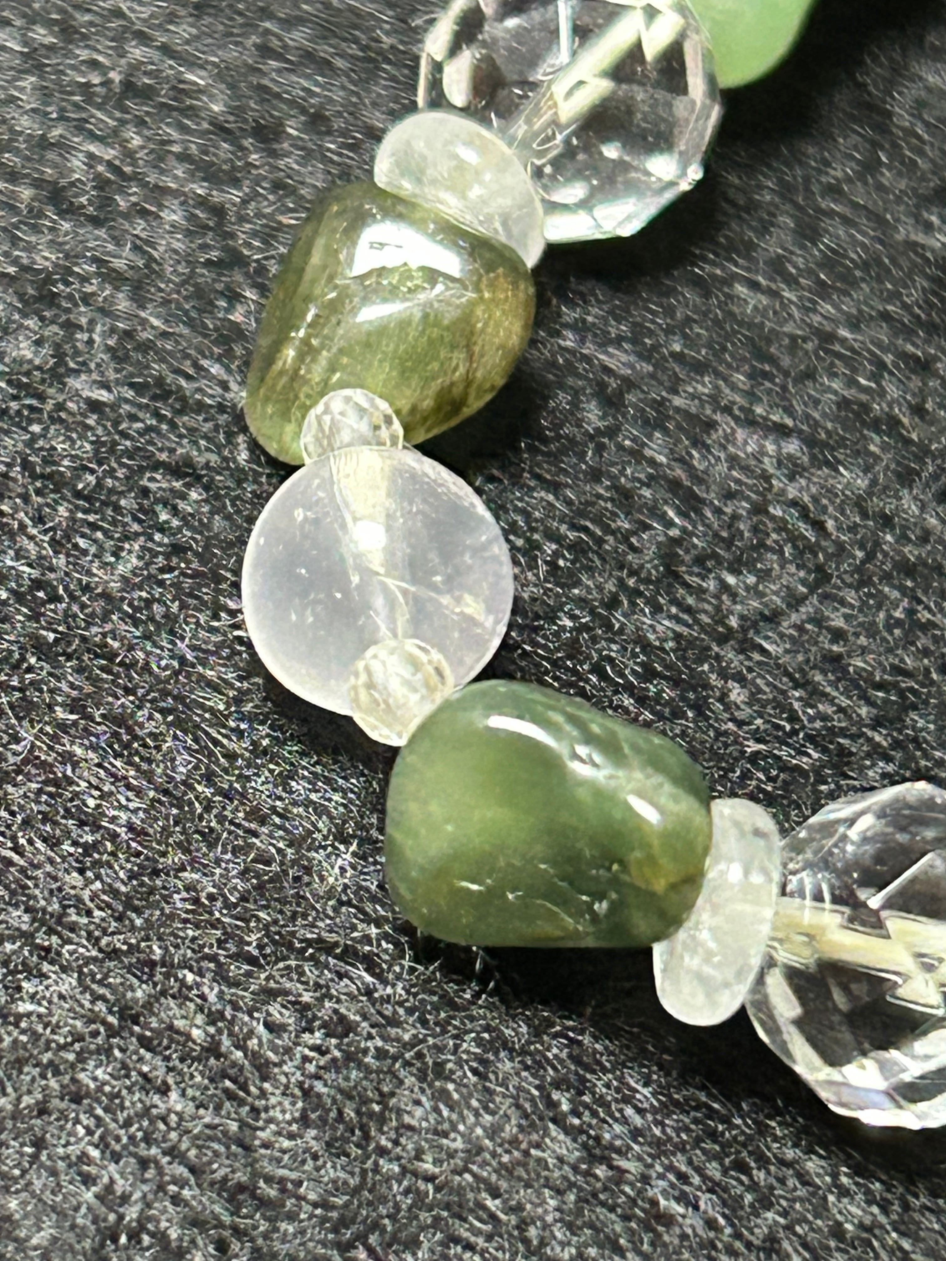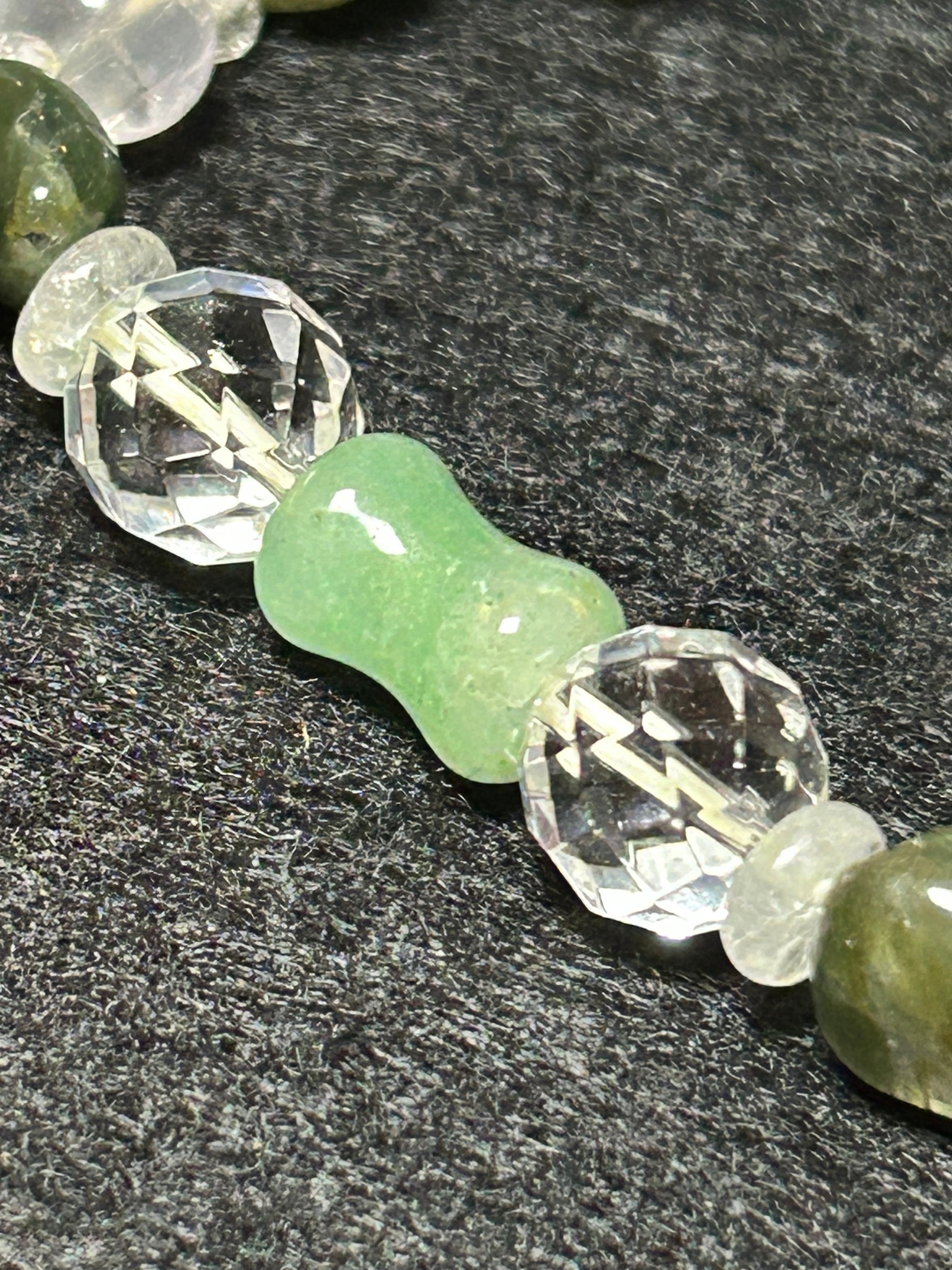 バンブーにカットされたアベンチュリンと、不規則な形のモスアゲートを組み合わせたユニークなデザインが特徴のブレスレットです。