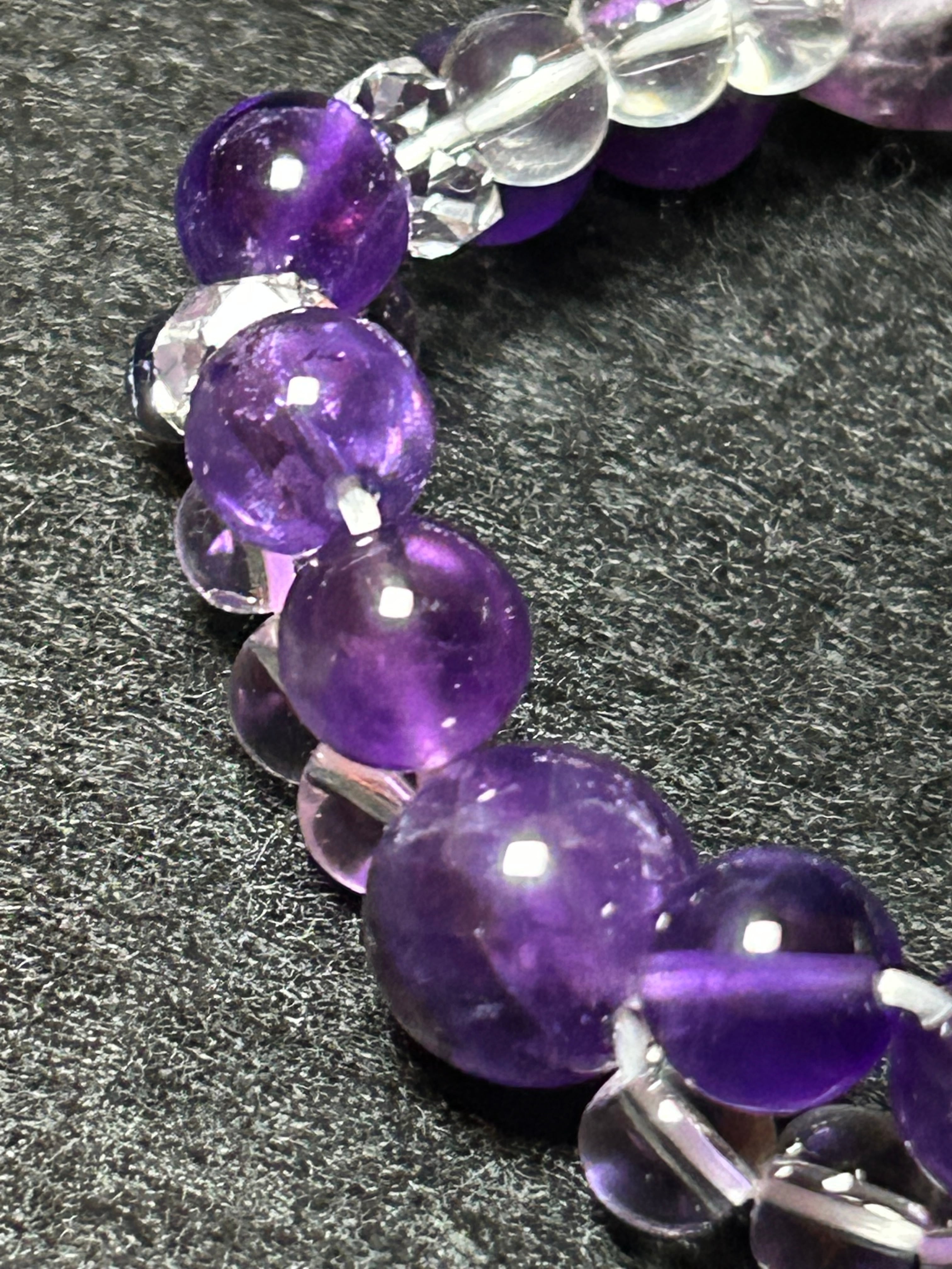 フリーカットのアメジストとラウンドアメジストを組み合わせた、優雅で洗練されたデザインが特徴のブレスレットです。