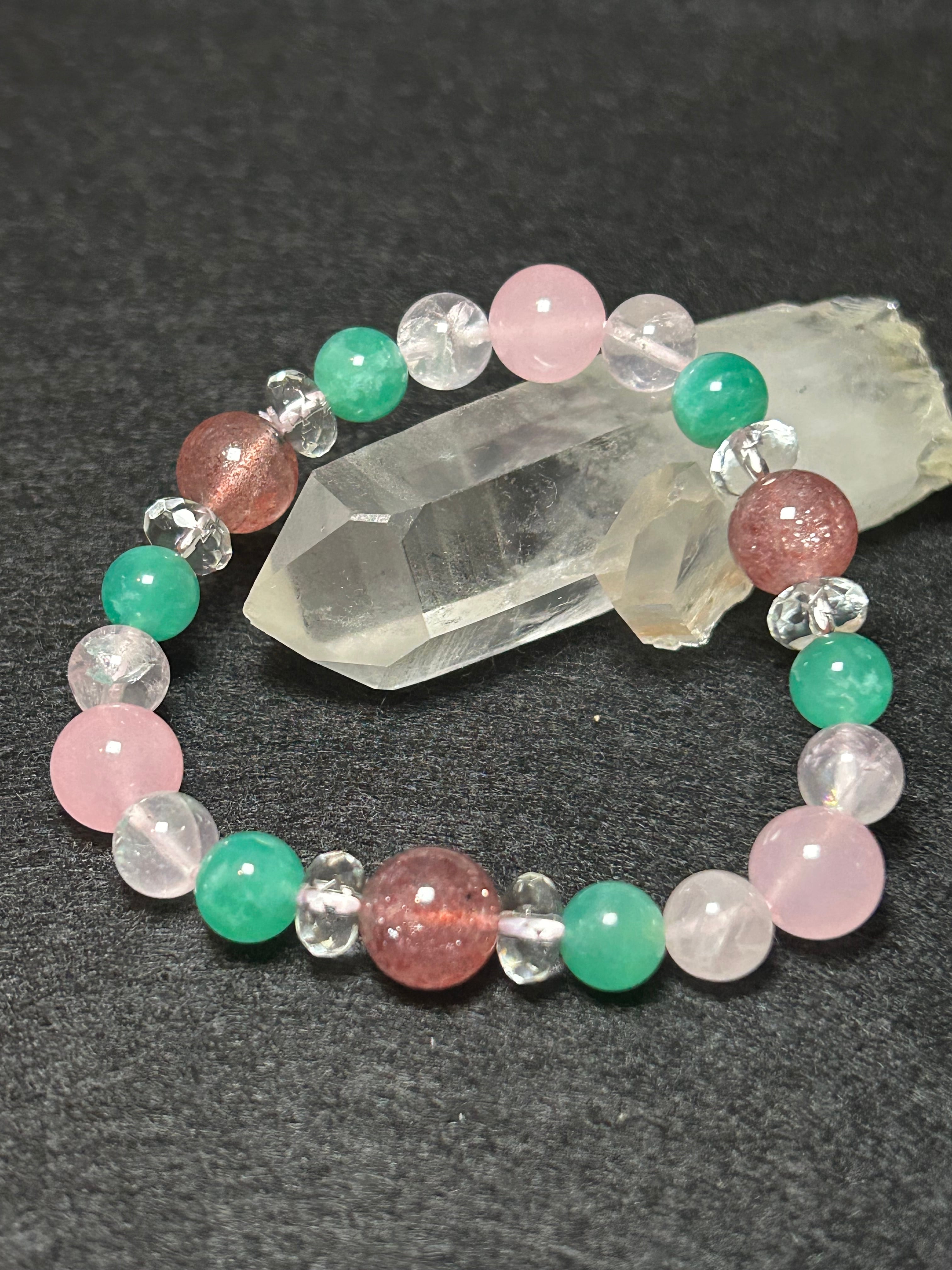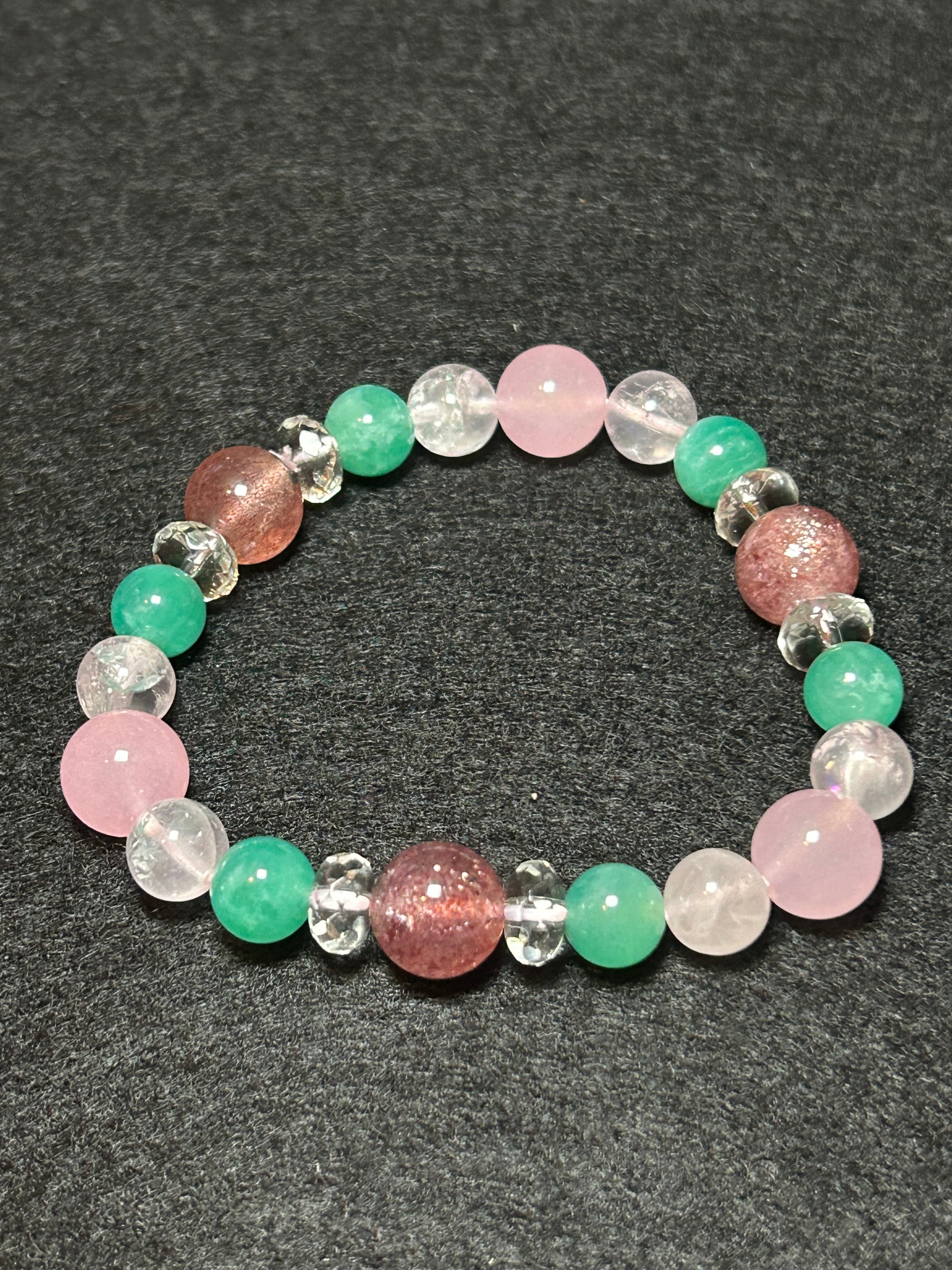 ストロベリークォーツが女性らしさを引き立て、爽やかなアマゾナイトが魅力をプラスしています。